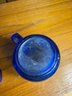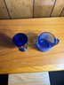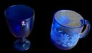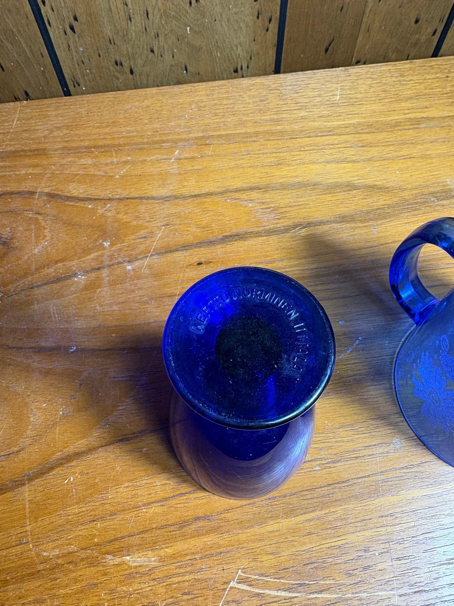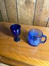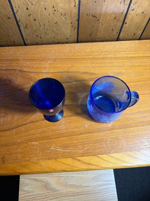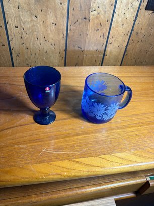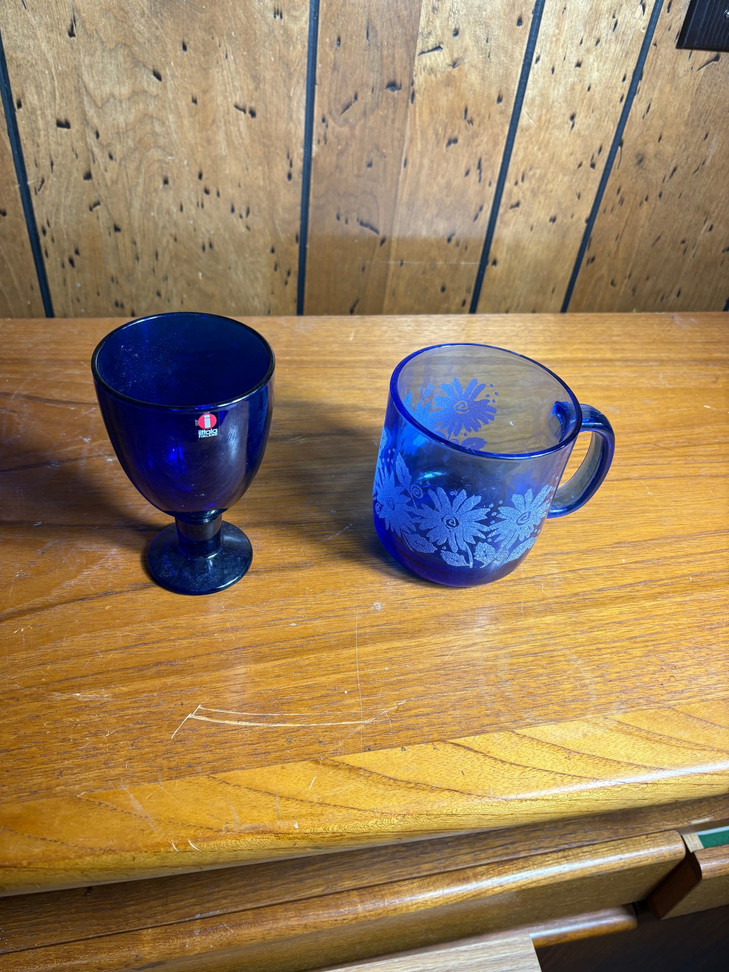 Dimensions approximately ittala finland goblet 5.25 inches tall. 3.25 inches in diameter. Cobalt etched mug dimensions approximately 4.25 inches tall. Diameter approximately 4 inches