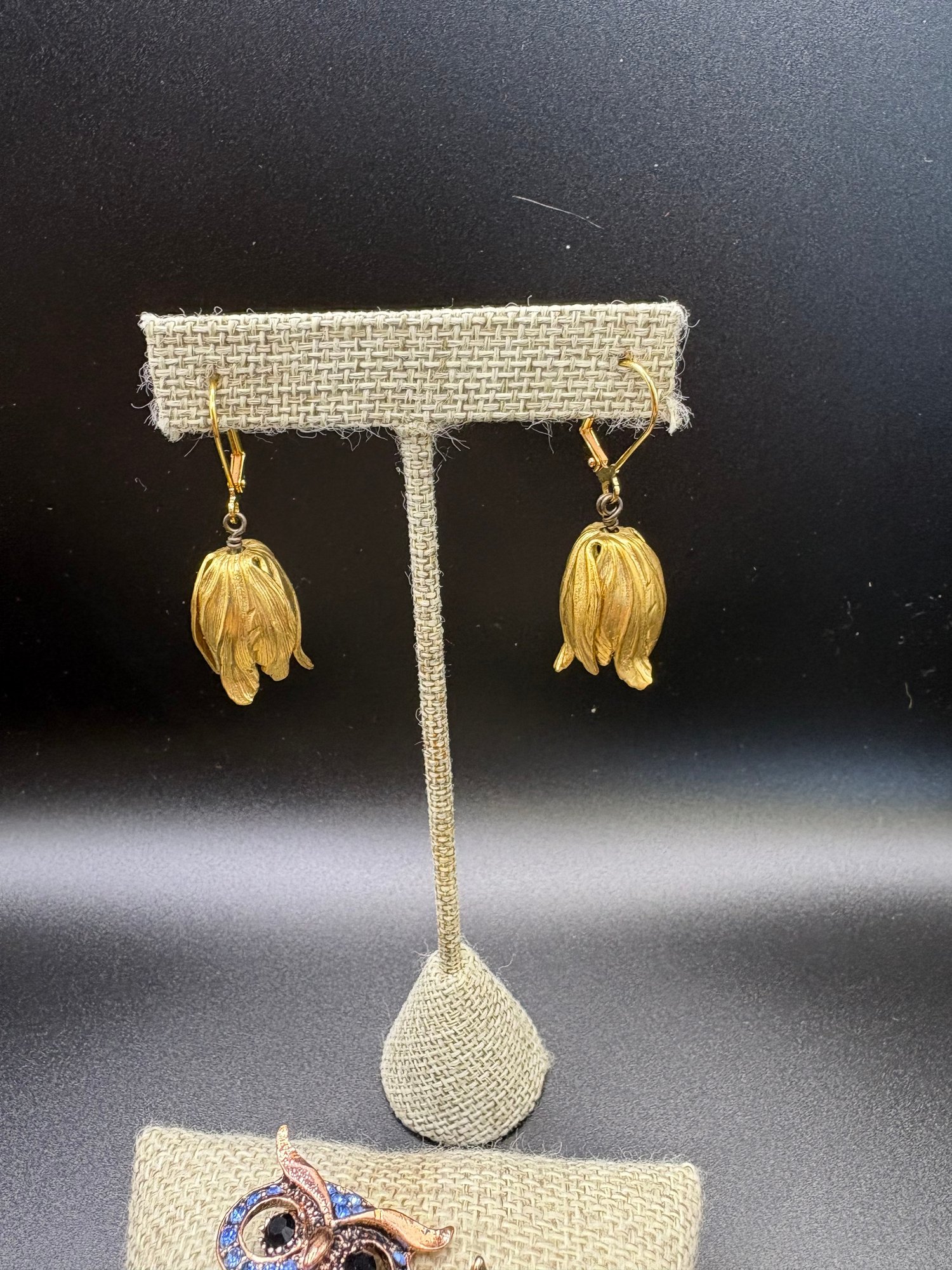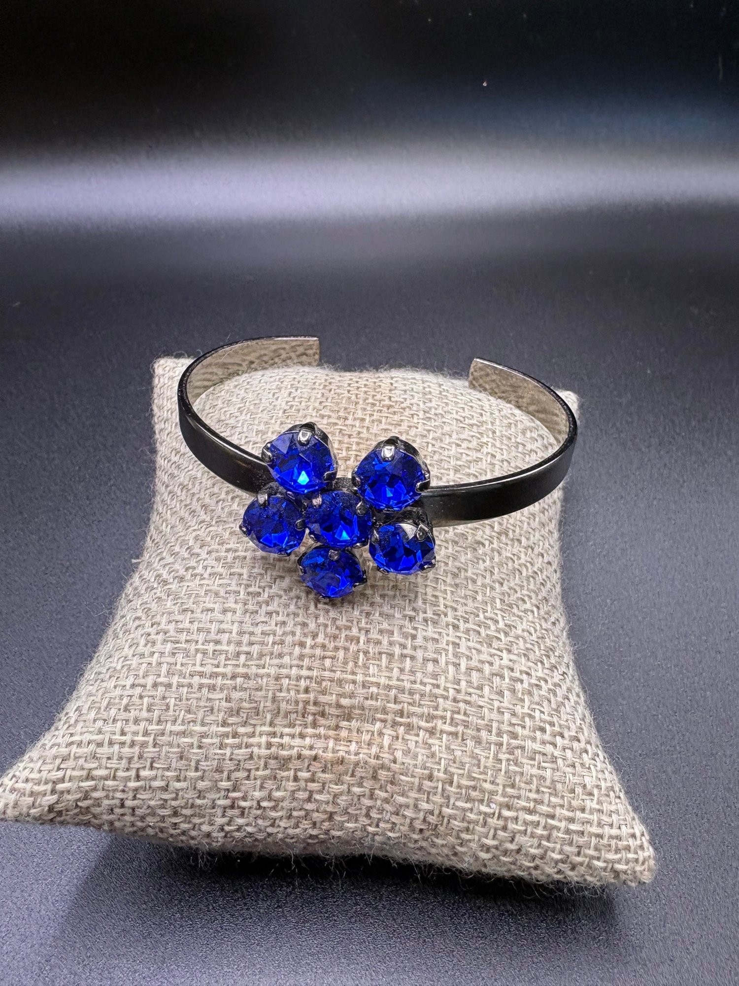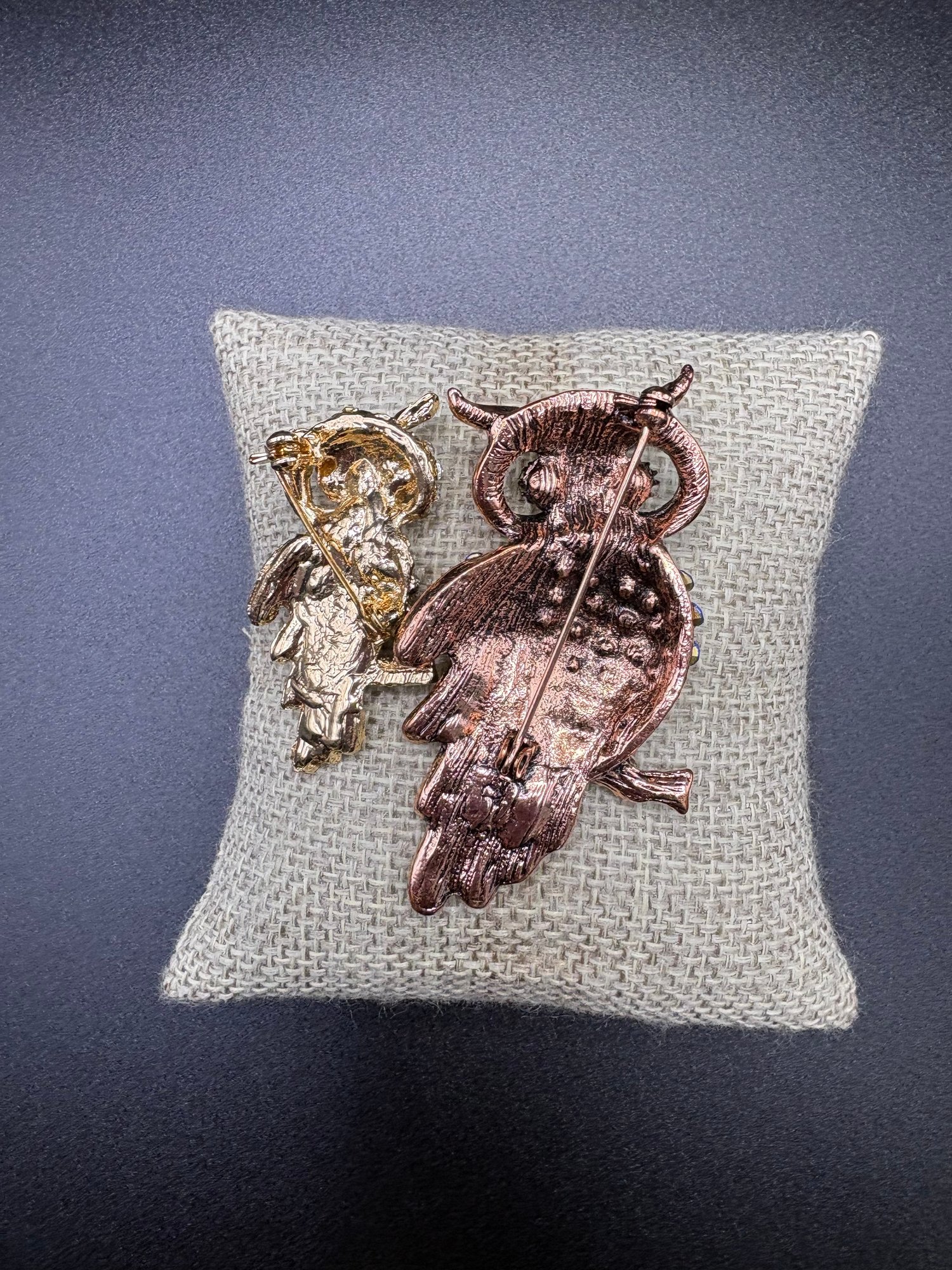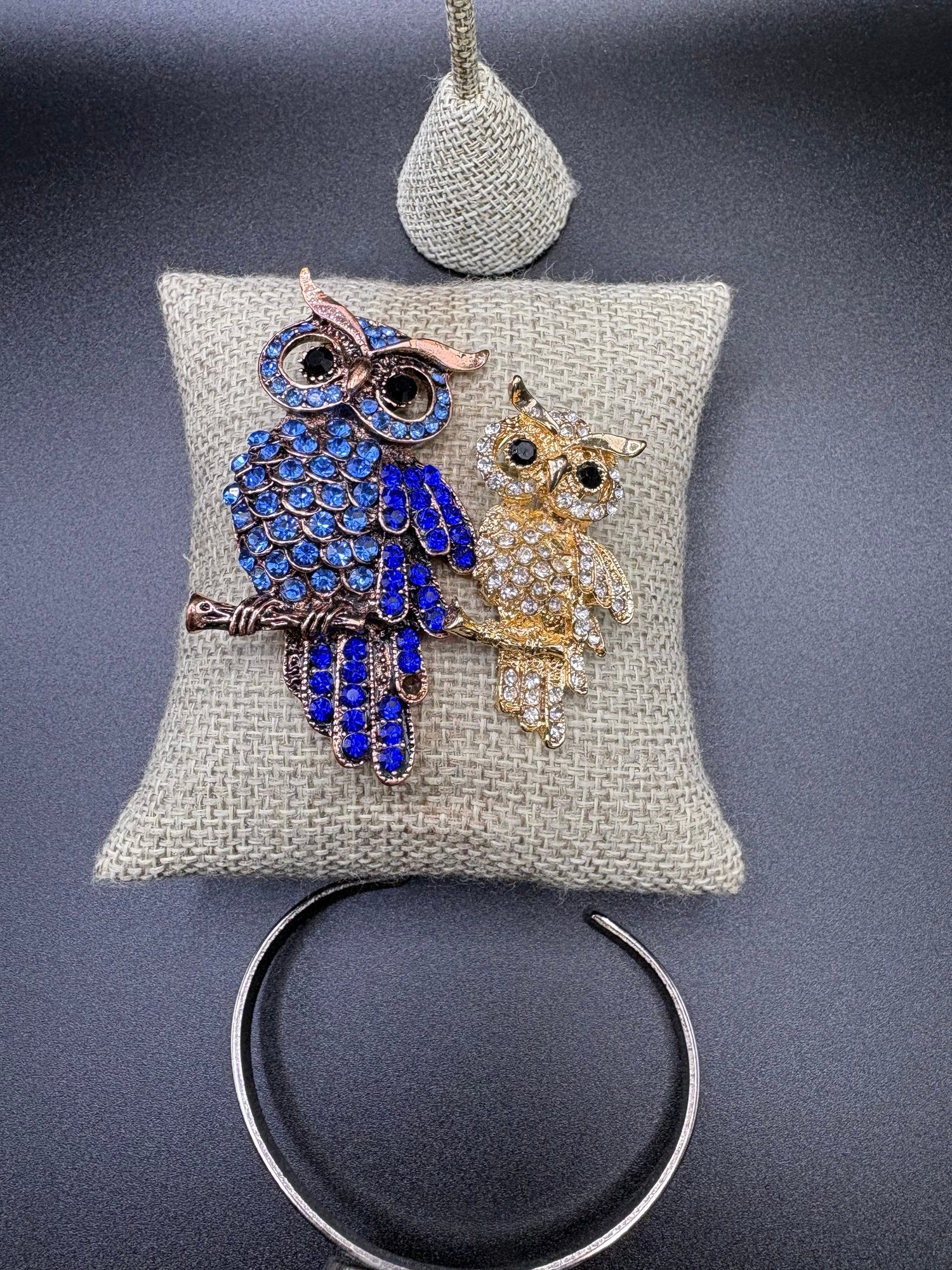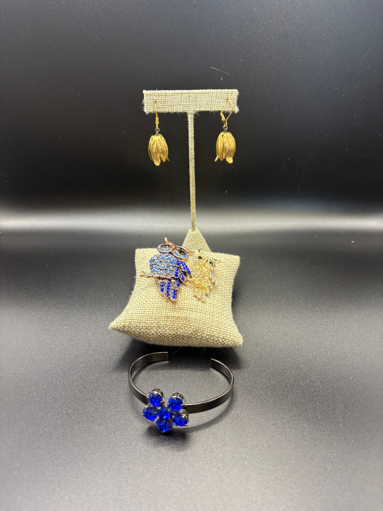 Two rhinestone owl pins, blue and gold tone. The blue owl is 2.5 x 1“ silver owl is 1“ x 1.5“. The earrings are gold plated and they are 2“ x .5“ and the bracelet is dark silver tone with blue glass flower beating and it’s 2.5 inches wide