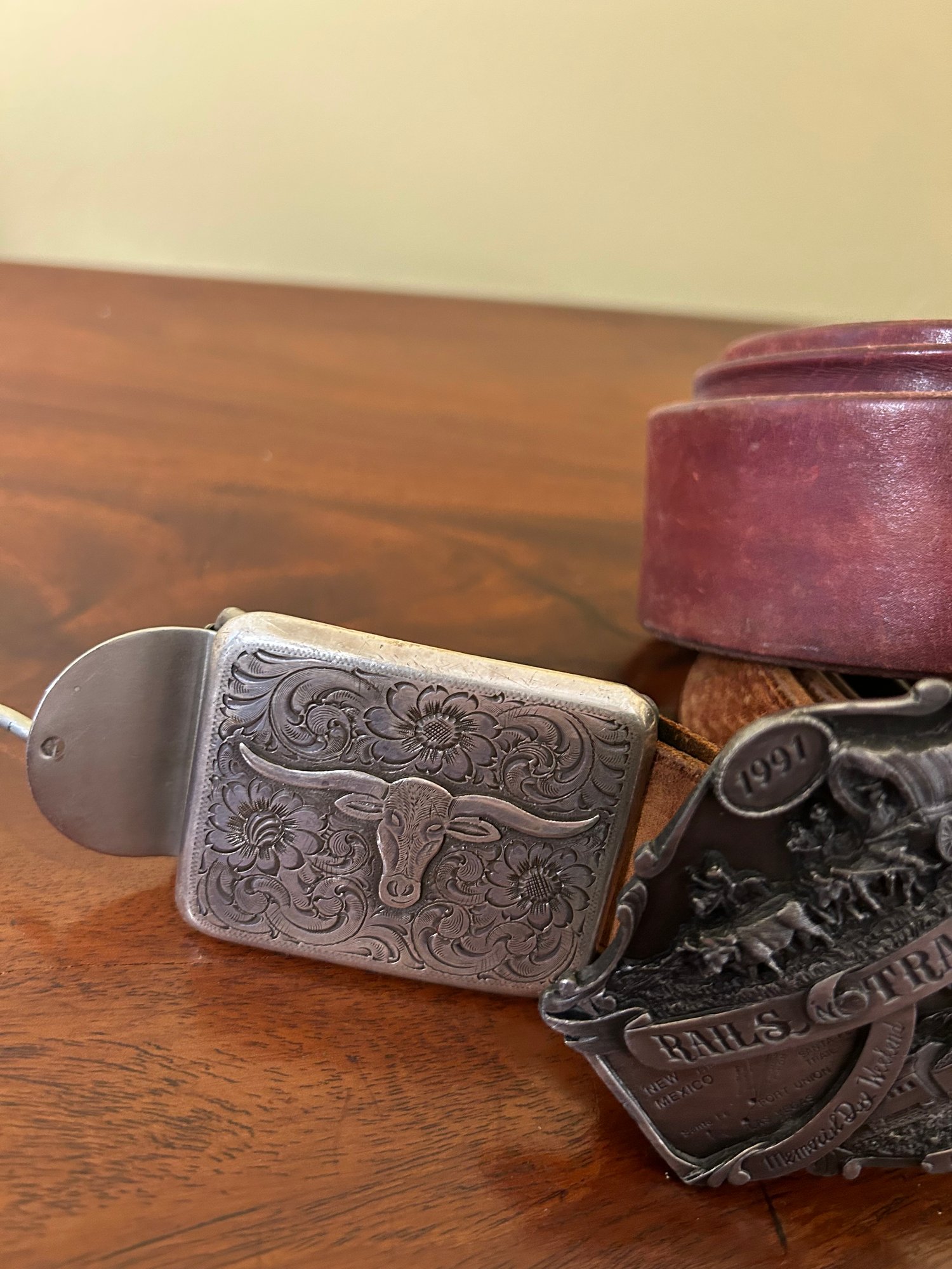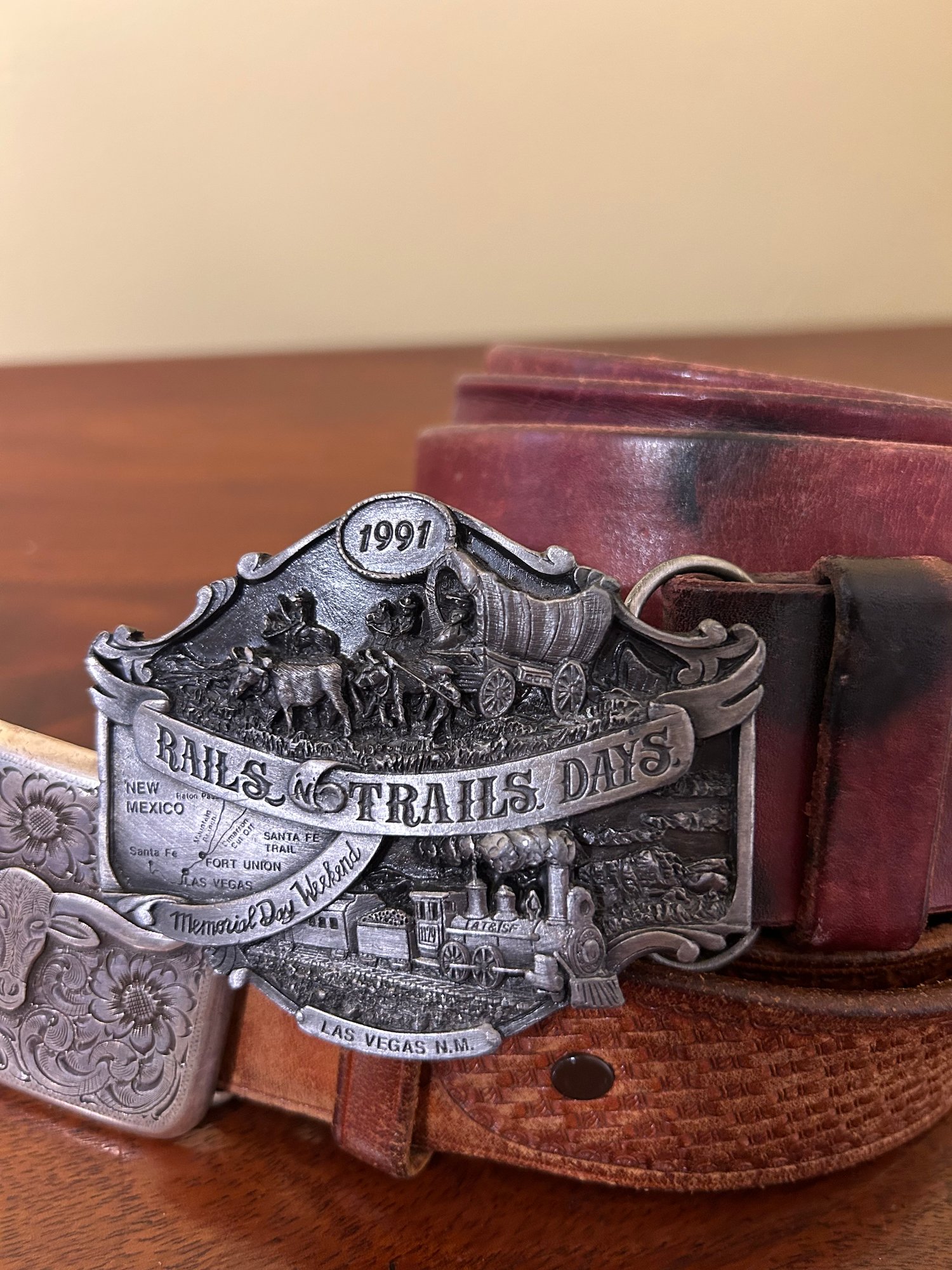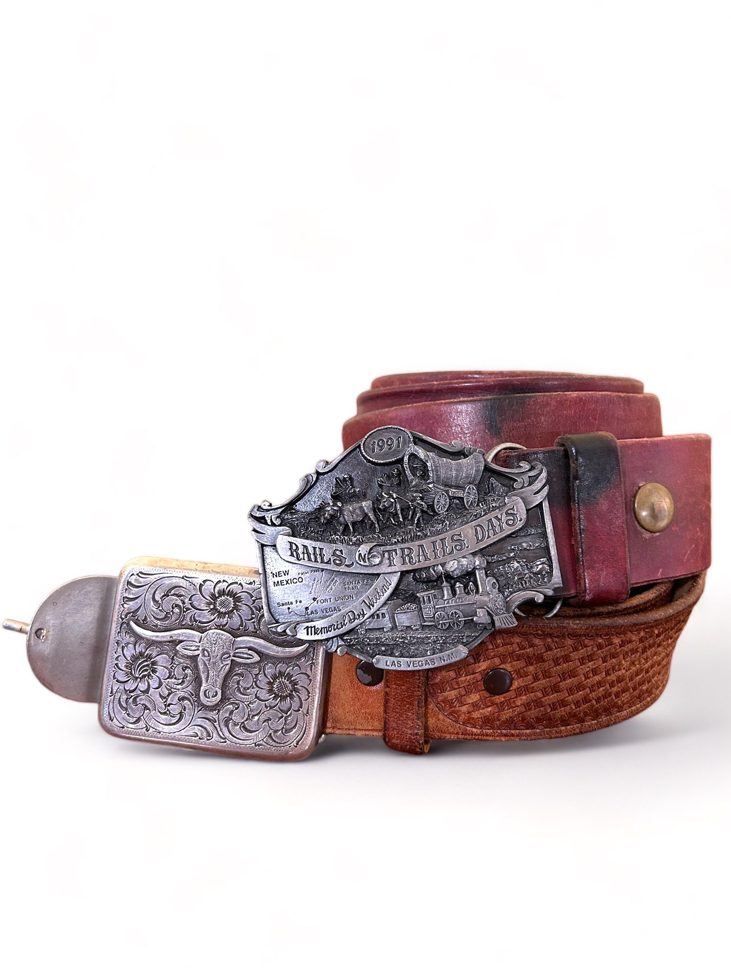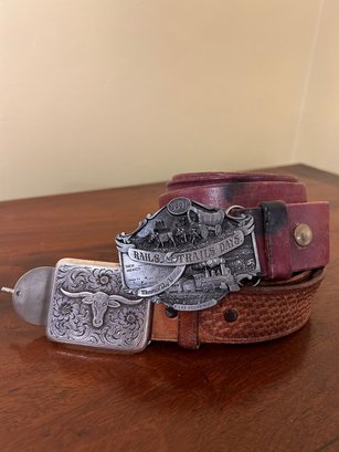 Two Vintage Belts With Silver Rustic Buckles, Americana. Good condition, slightly worn. Each are about 46 inches long with buckle.