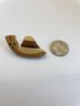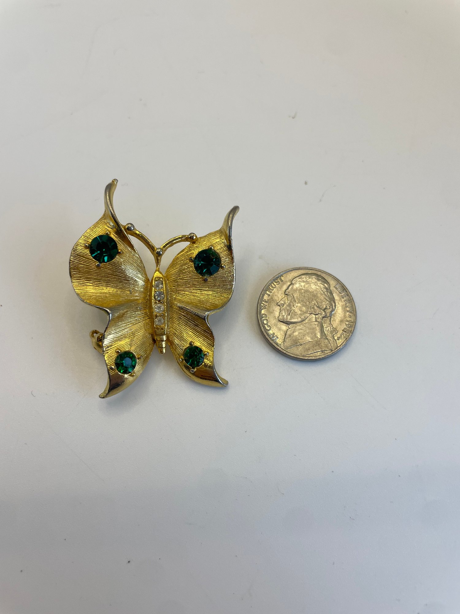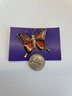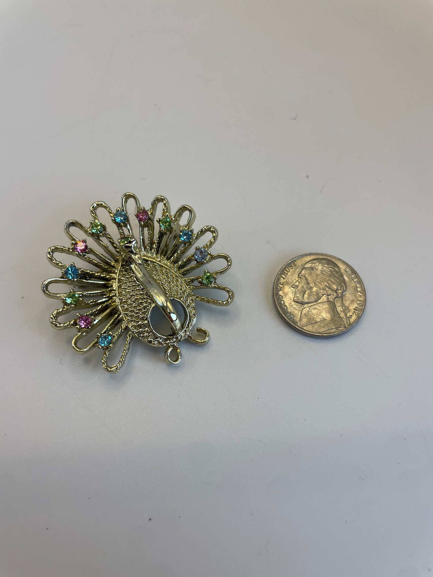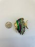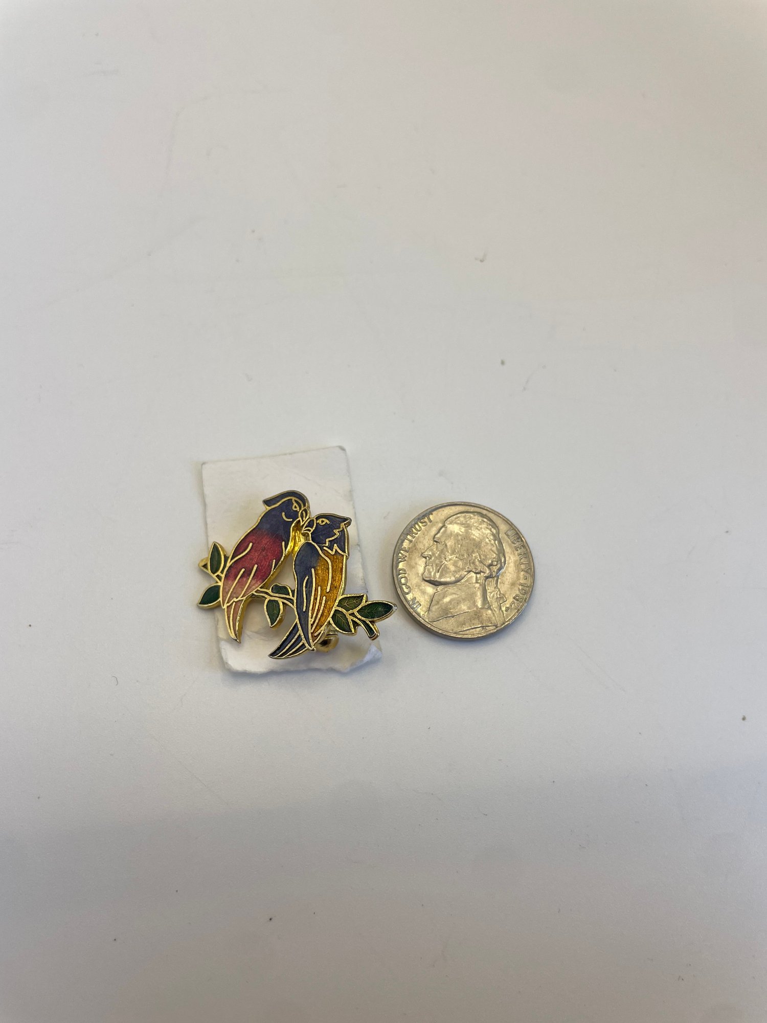 Each brooch photographed next to a nickel for size comparison