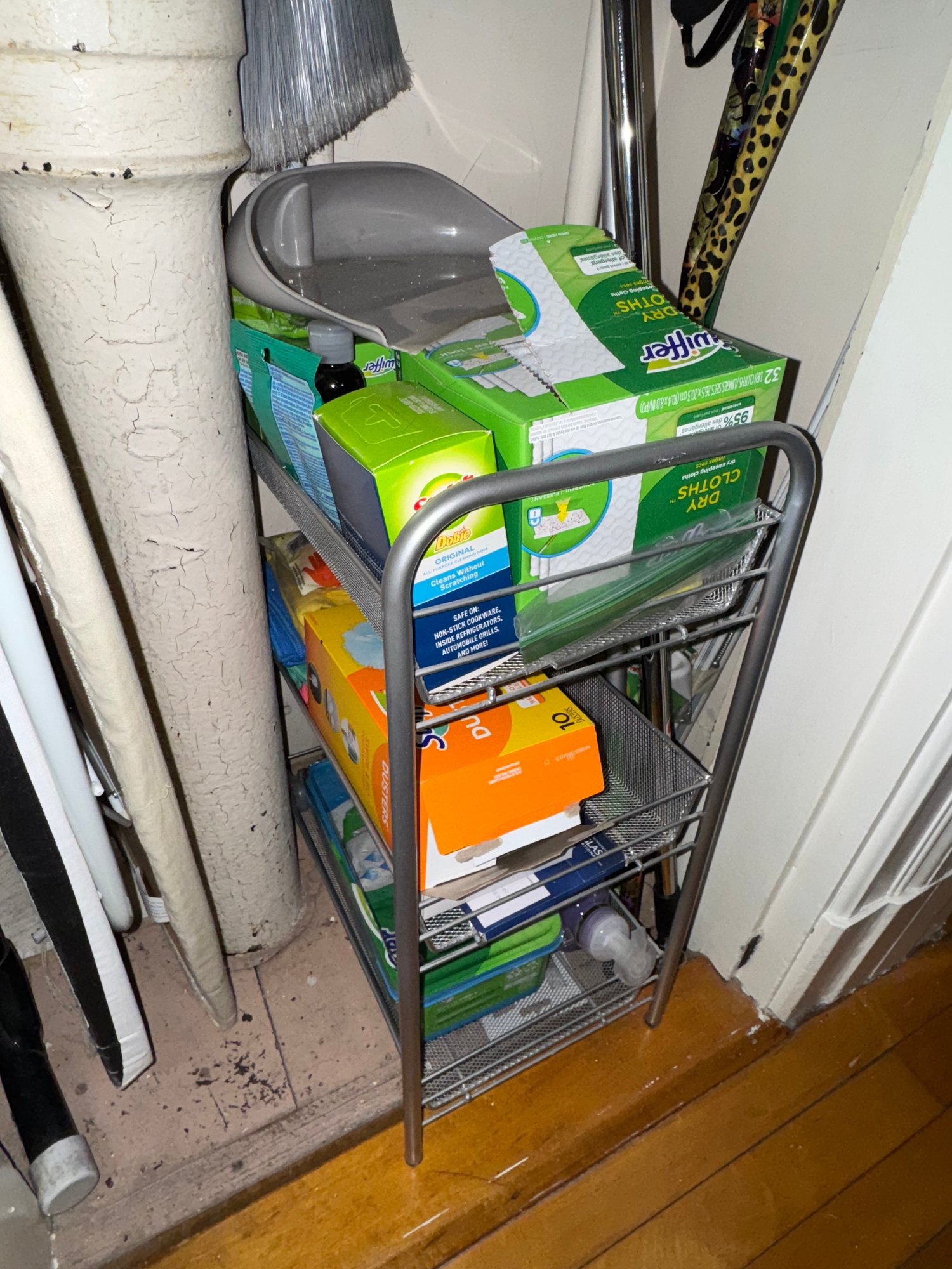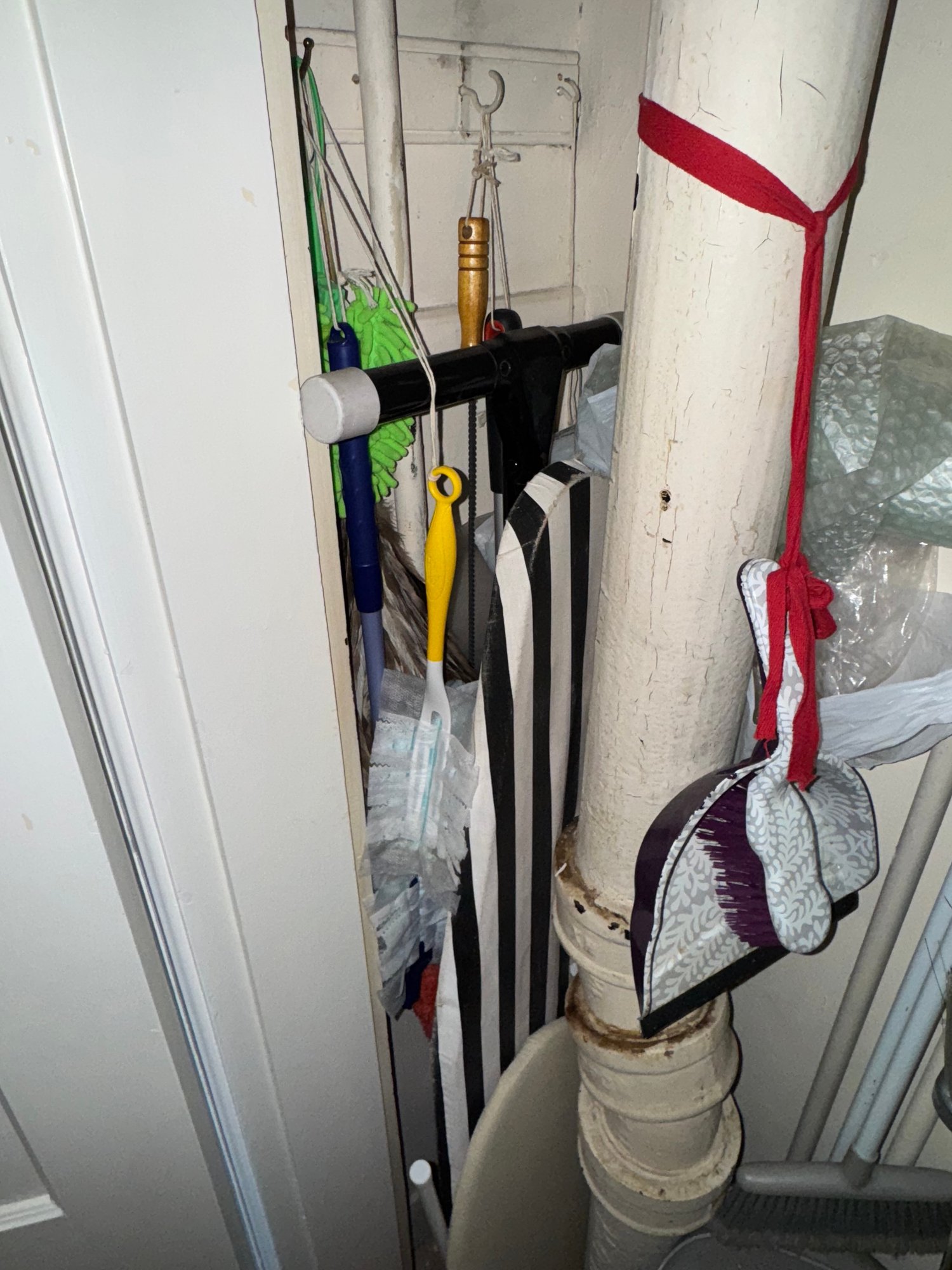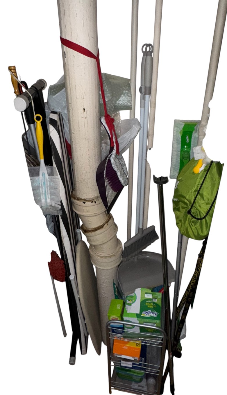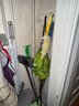 ironing boards, utility shelf, brooms etc