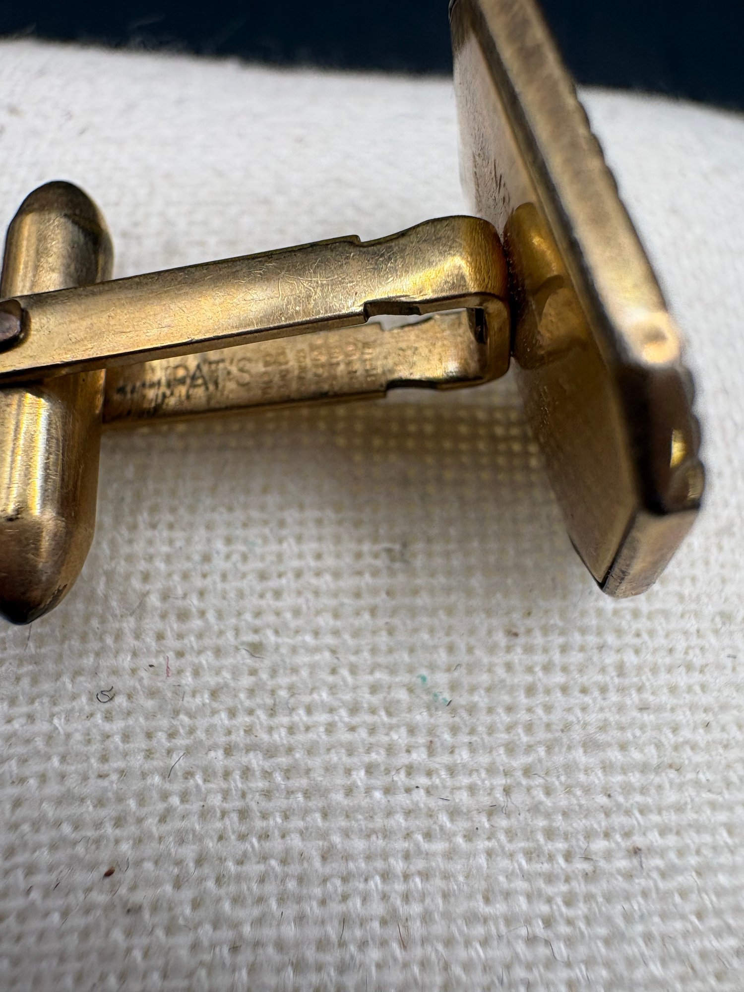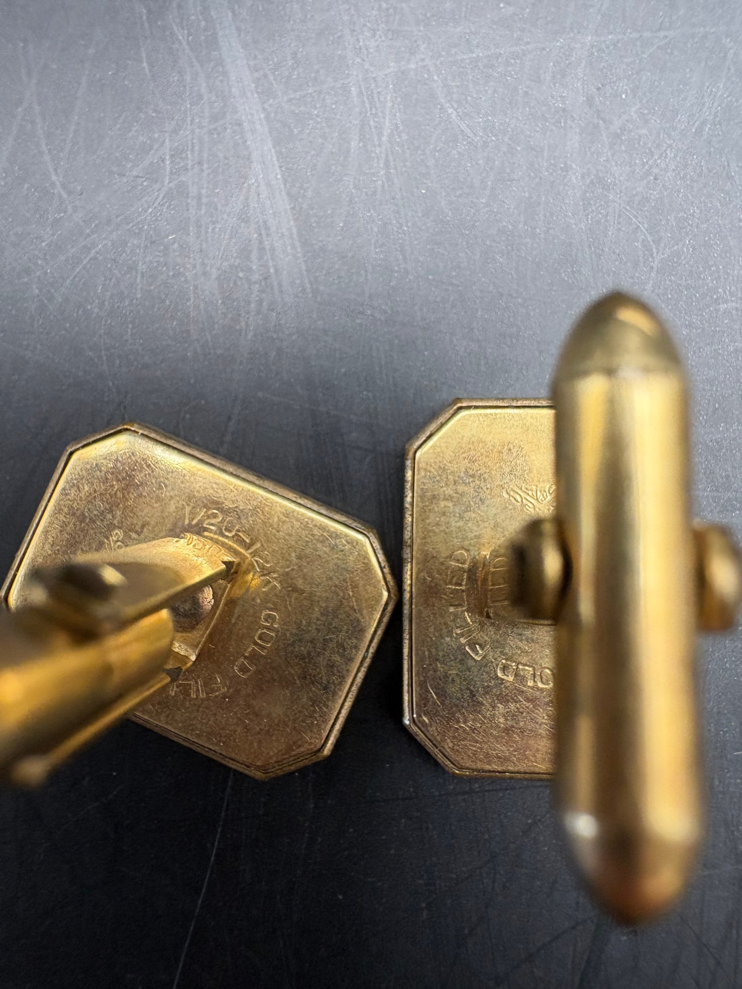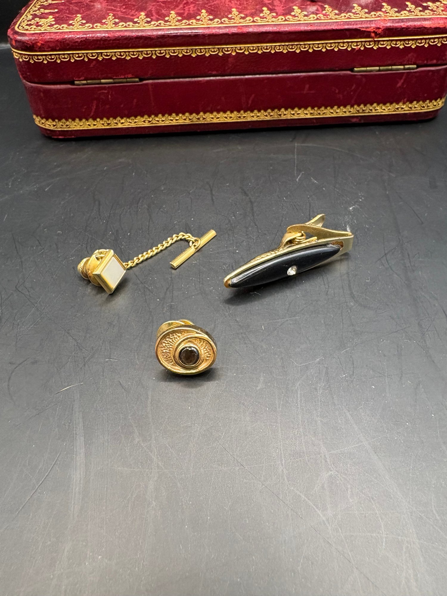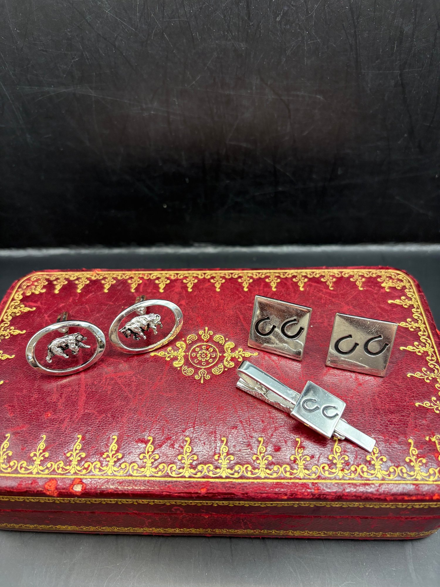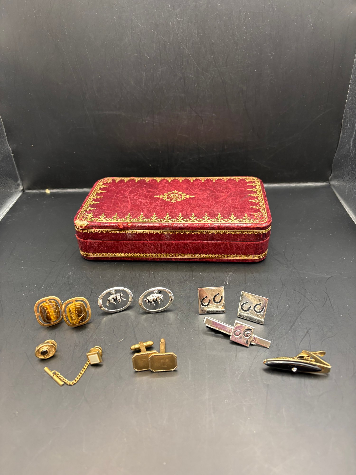One pair of 12k GF Initialed cufflinks; 1 pair of LaMode tigers eye 10k GF cufflinks; 1 pair of Anson silvertone horseshoe cufflinks and tie clip set.