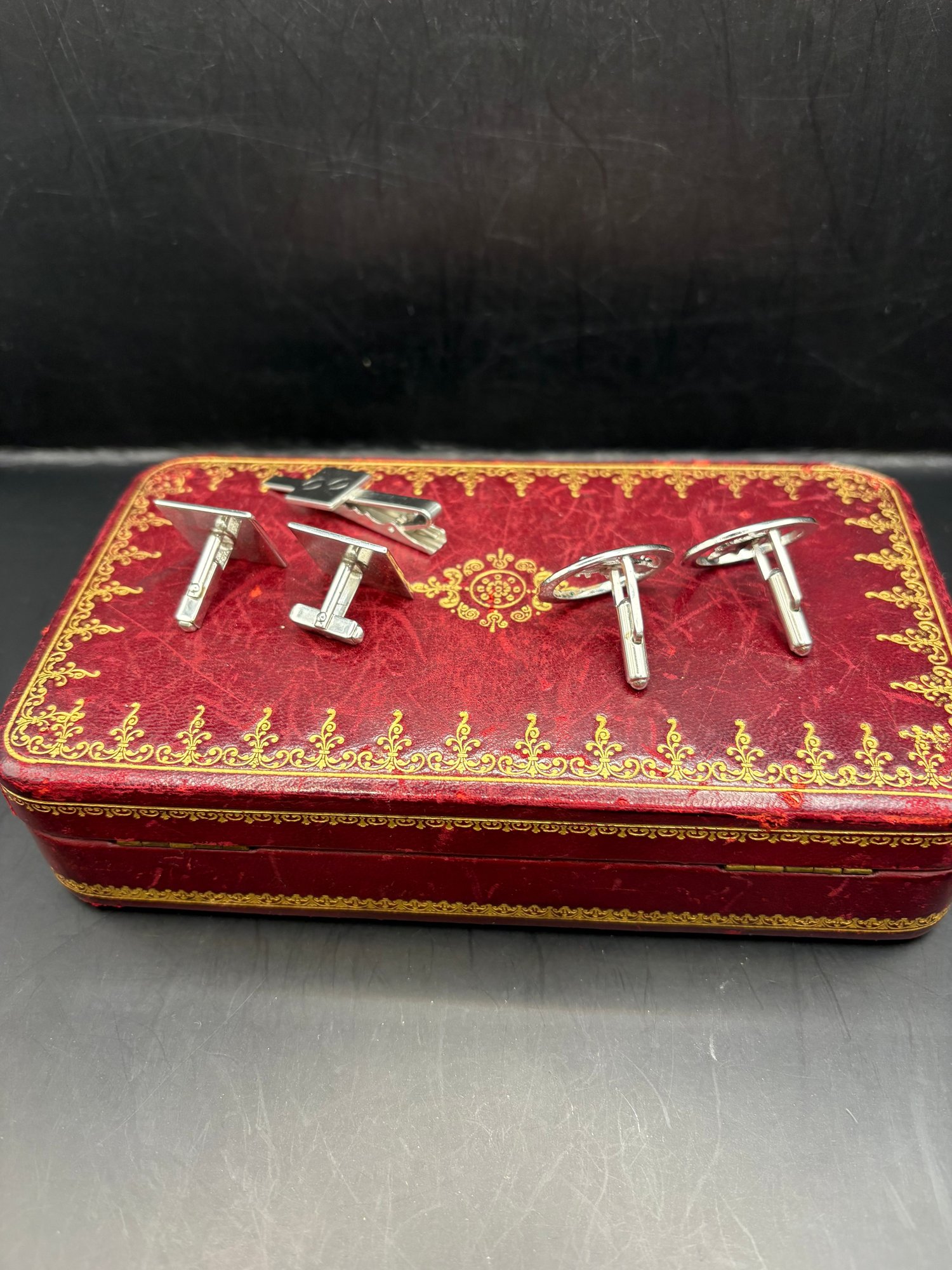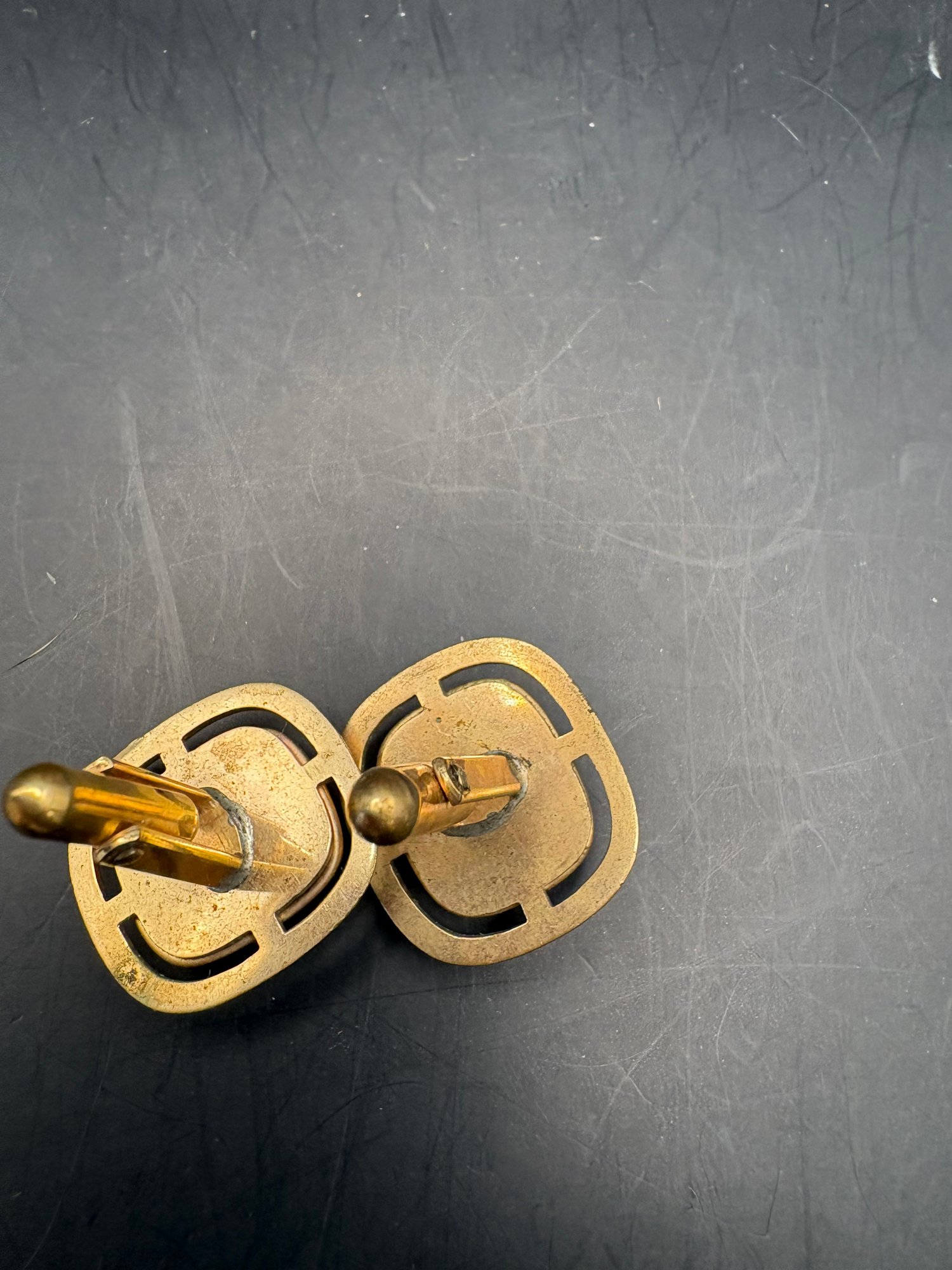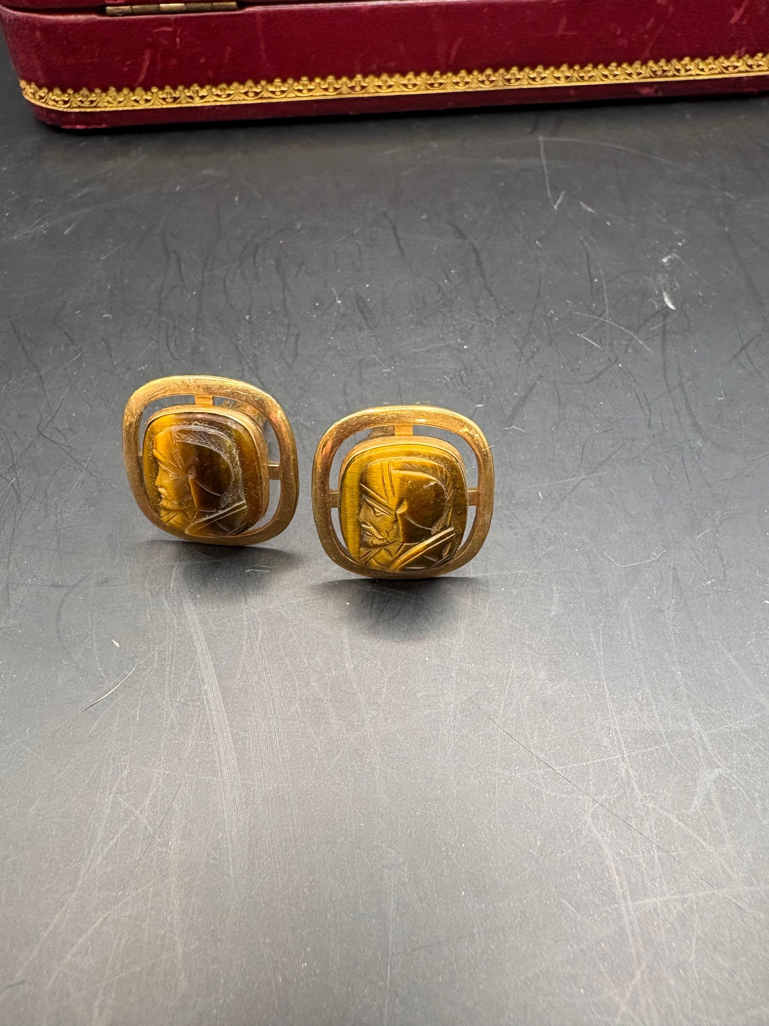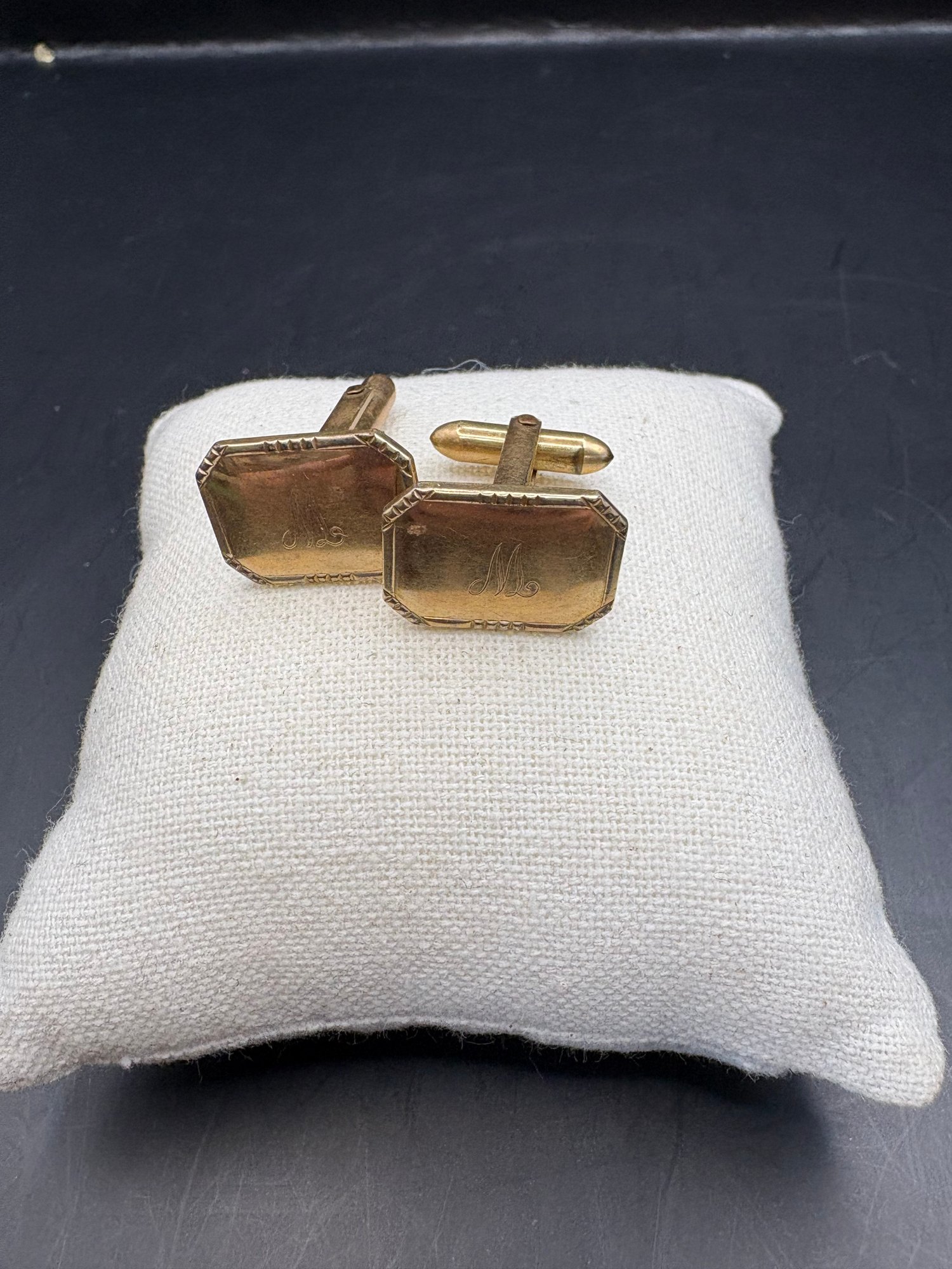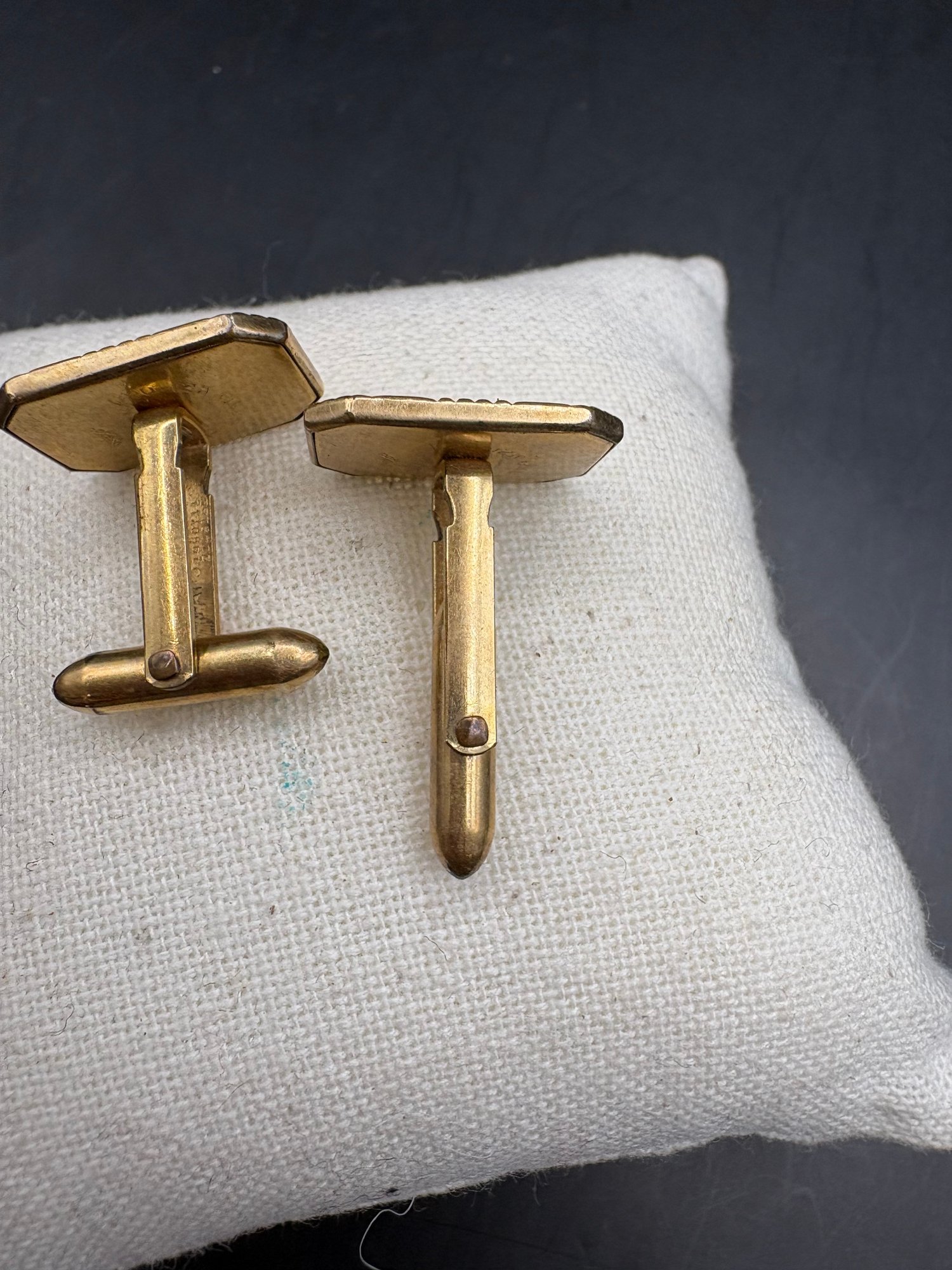 One pair of 12k GF Initialed cufflinks; 1 pair of LaMode tigers eye 10k GF cufflinks; 1 pair of Anson silvertone horseshoe cufflinks and tie clip set.