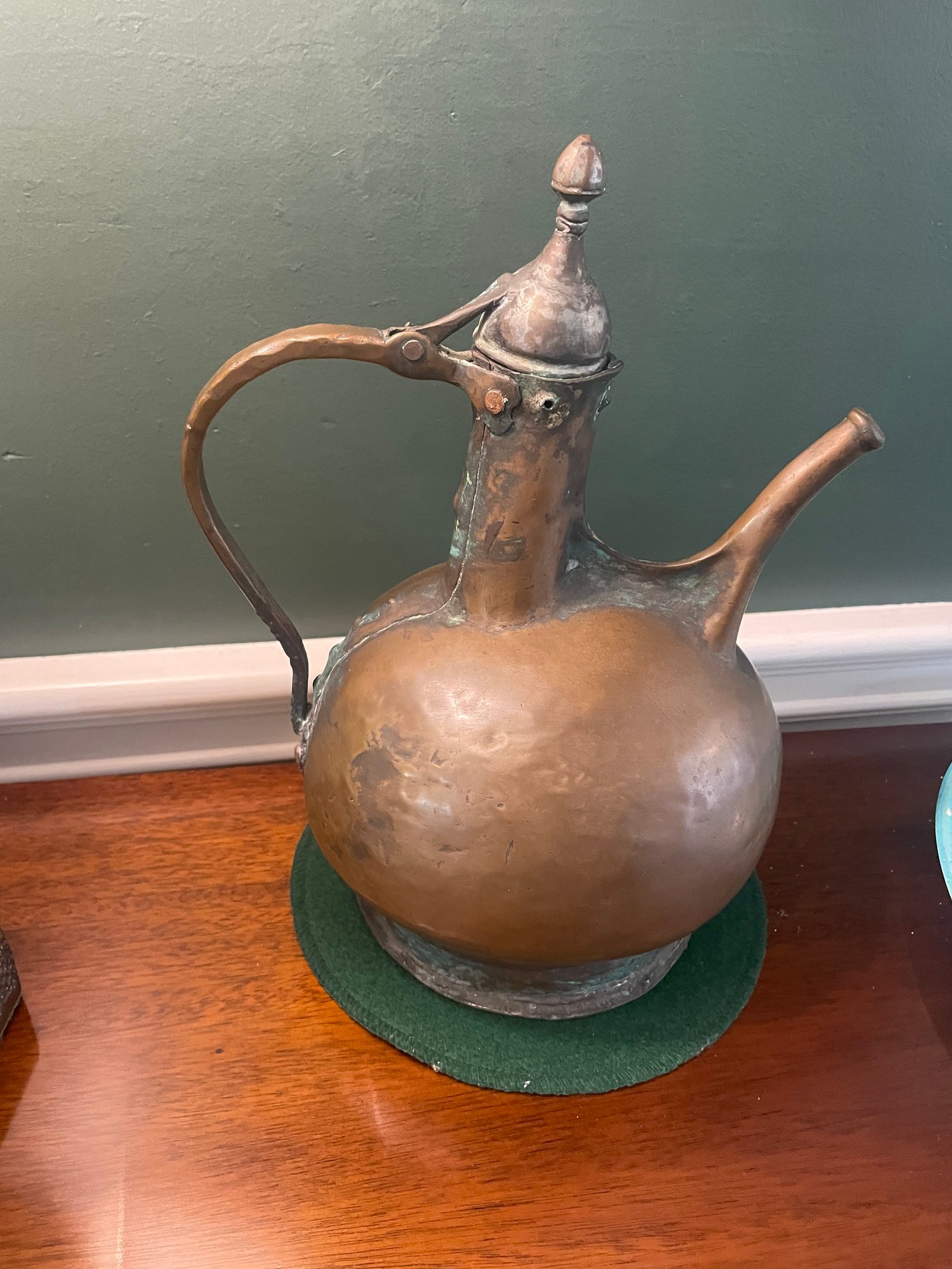 Vintage copper jug with attached lid and handle