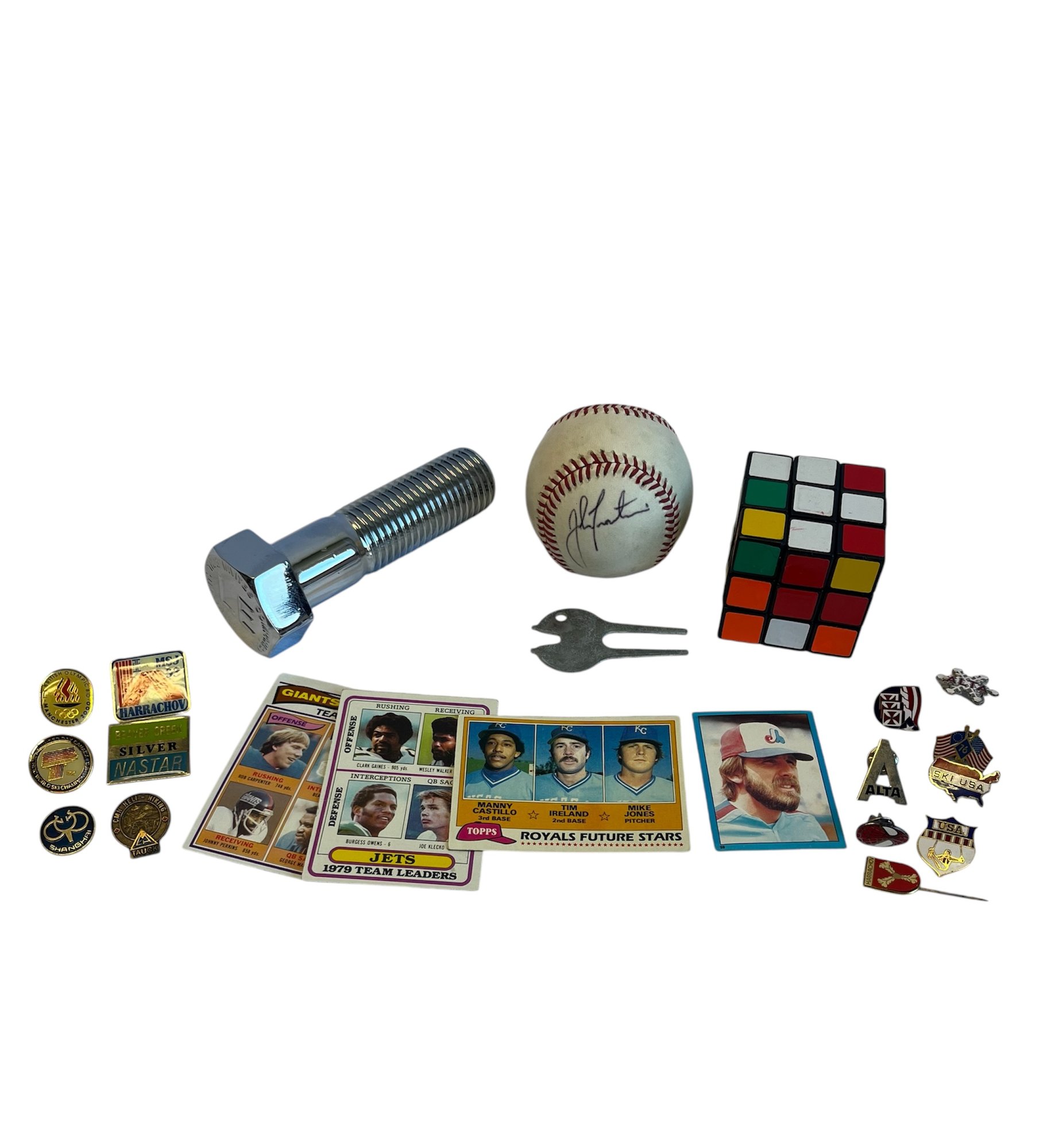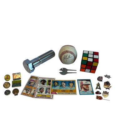 Vintage Golf Divot Tool, Signed Baseball, Football And Baseball Cards, Rubix Cube, LE Screw & Assorted Pins