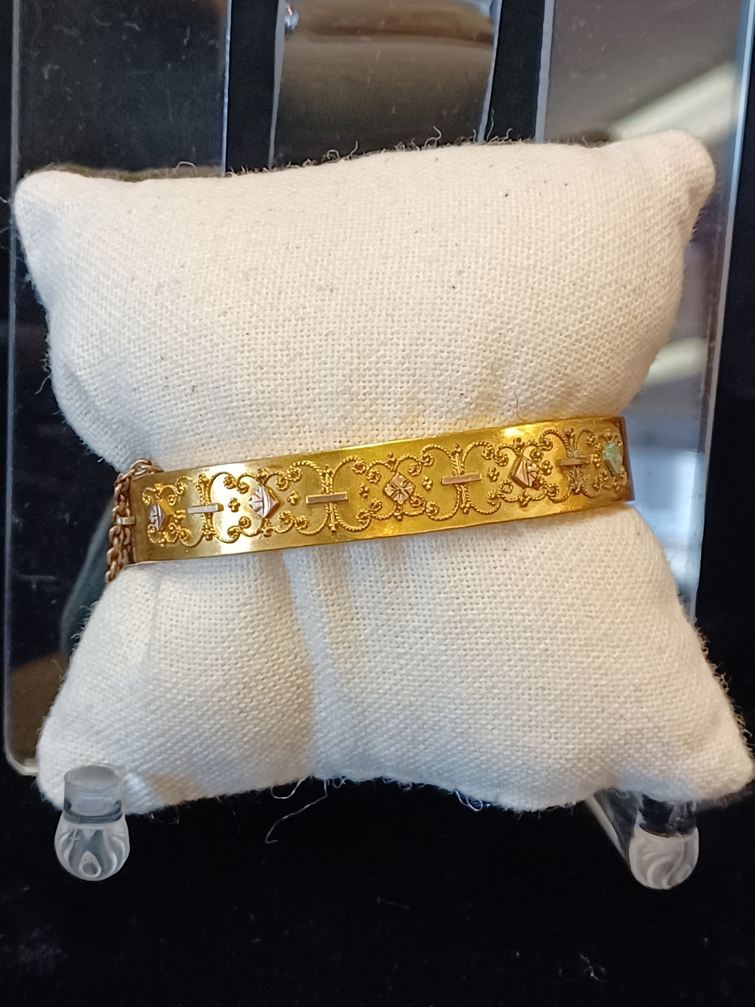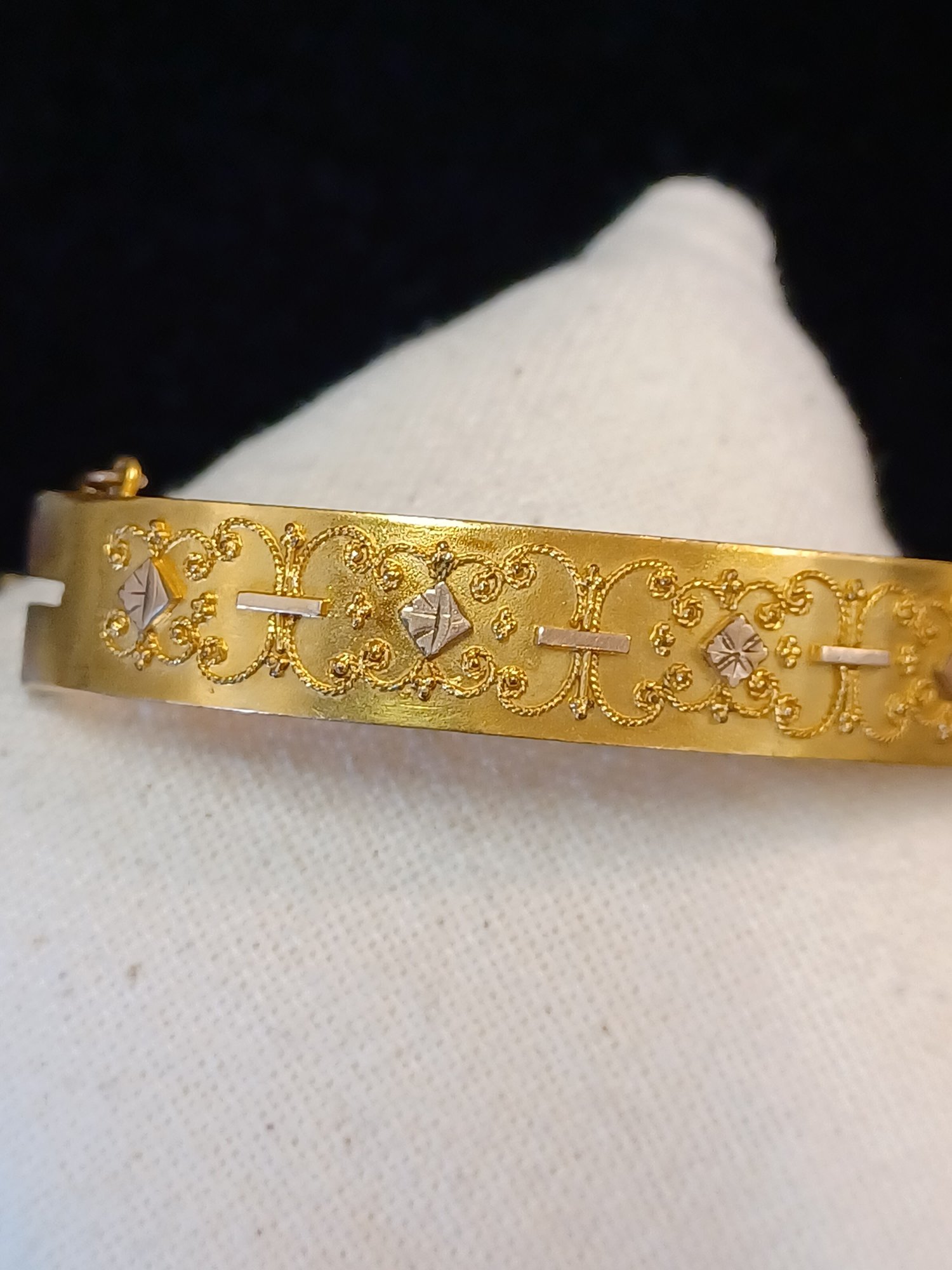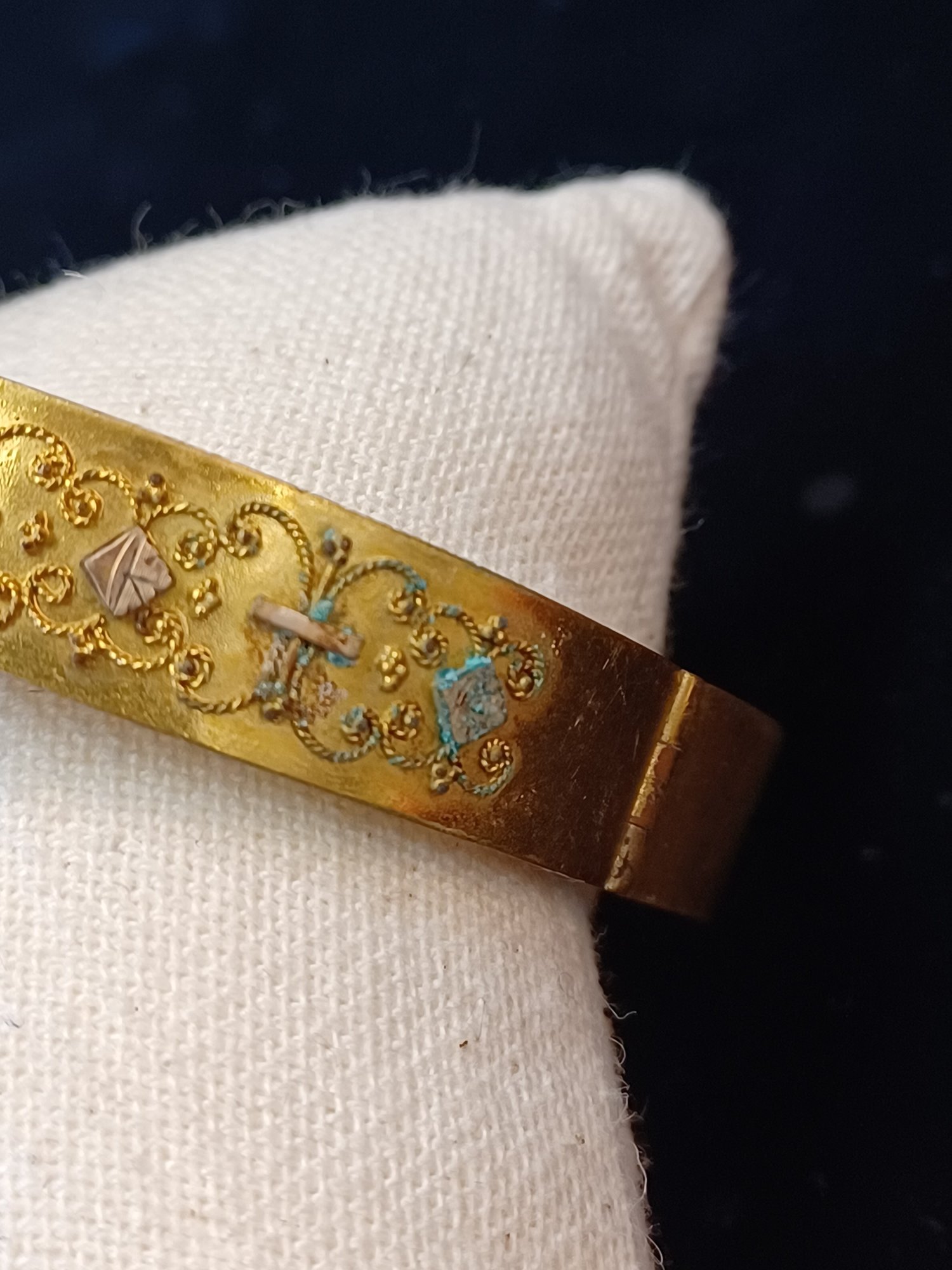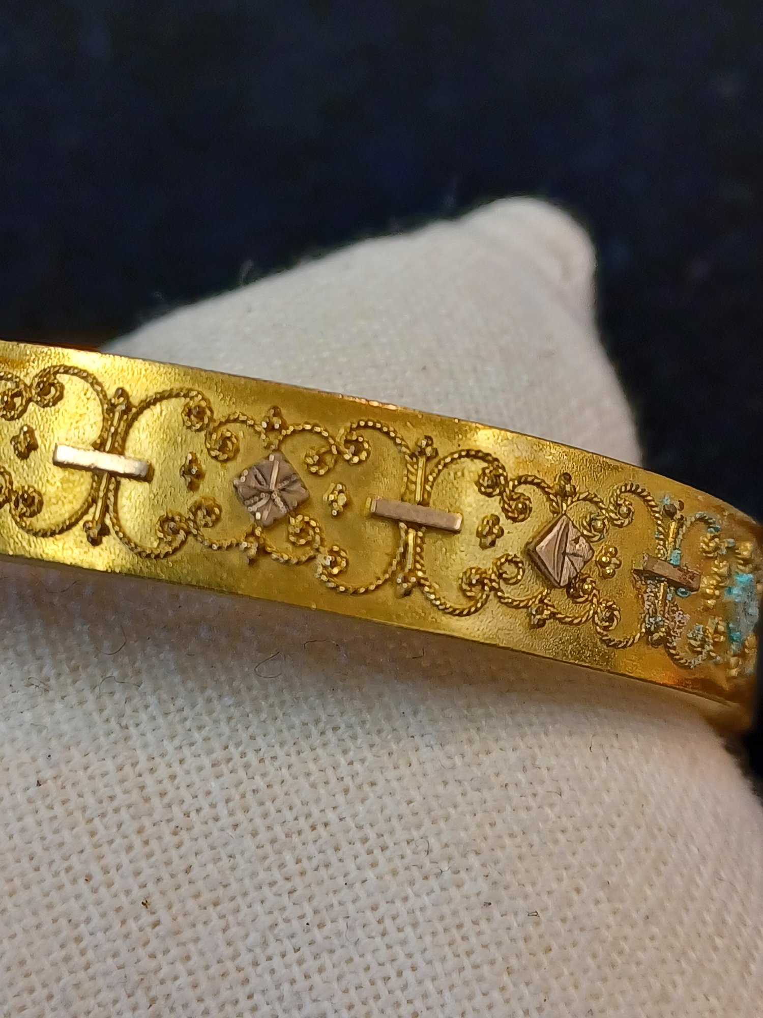 Some wear and scuffs; shows some corrosion; beautiful filigree work on topside of cuff; * needs cleaning