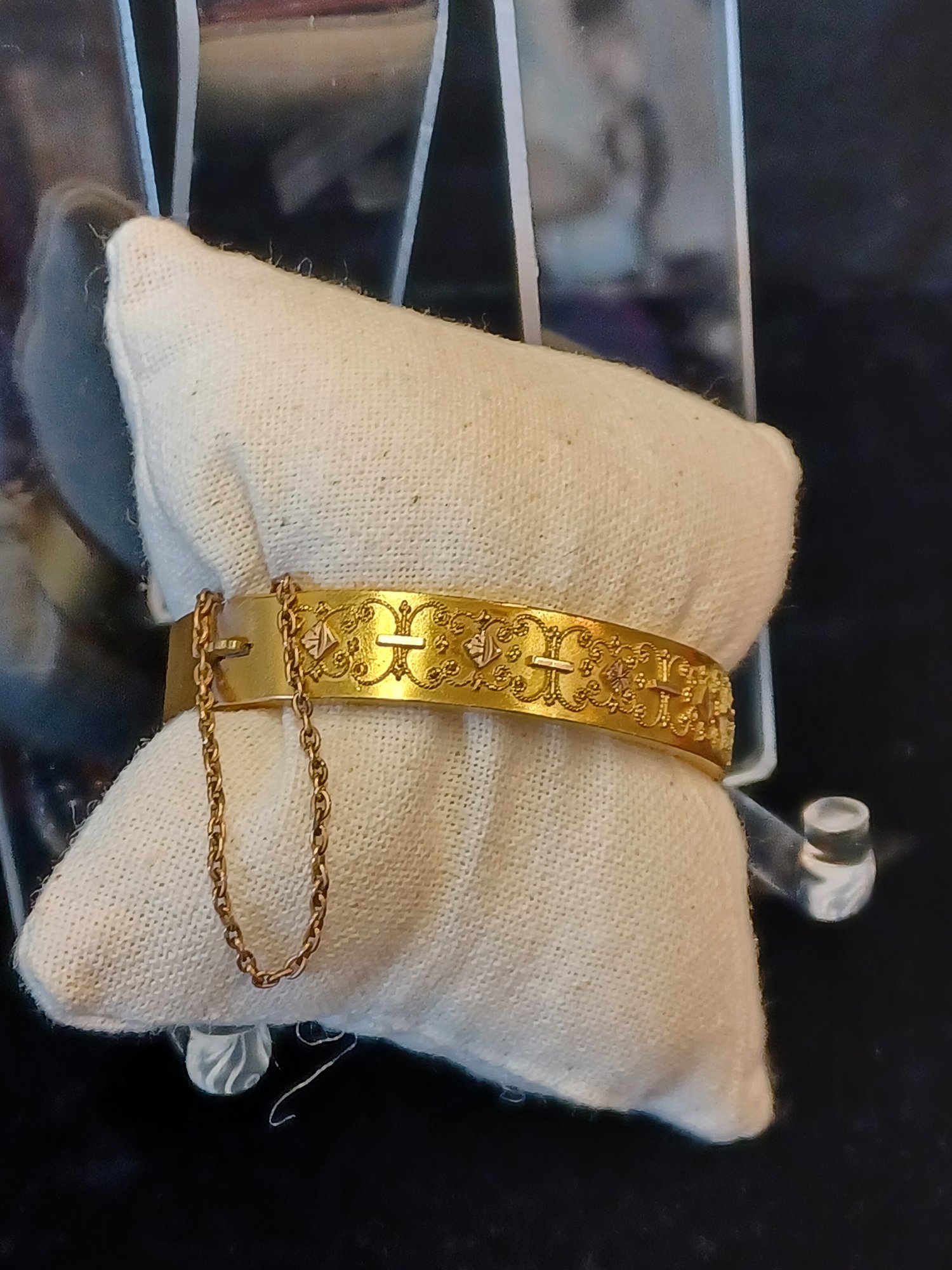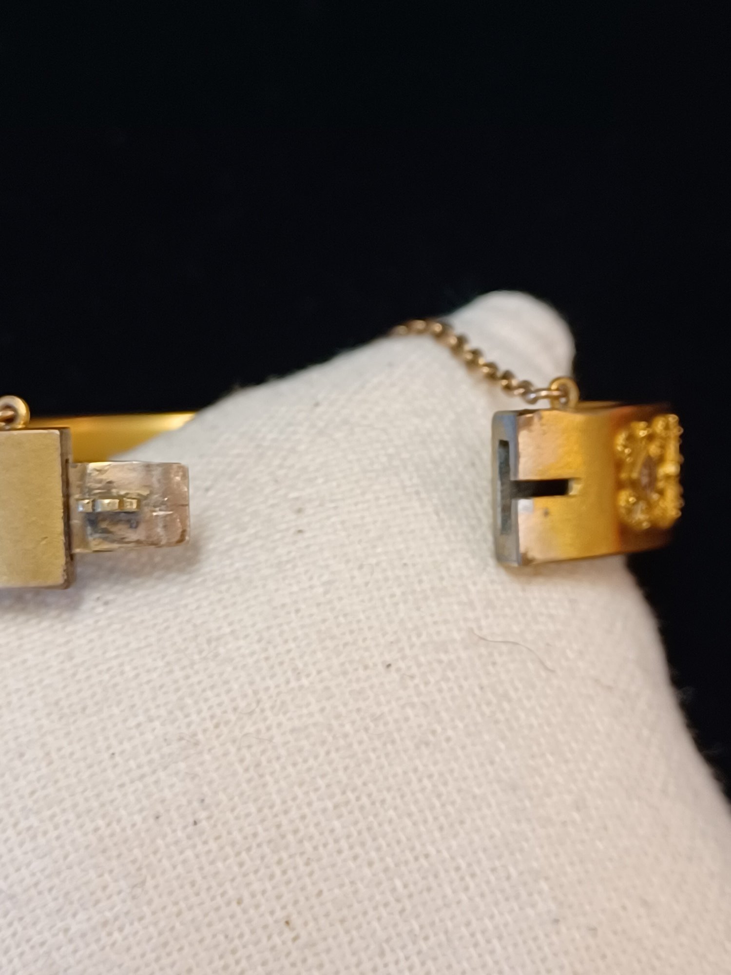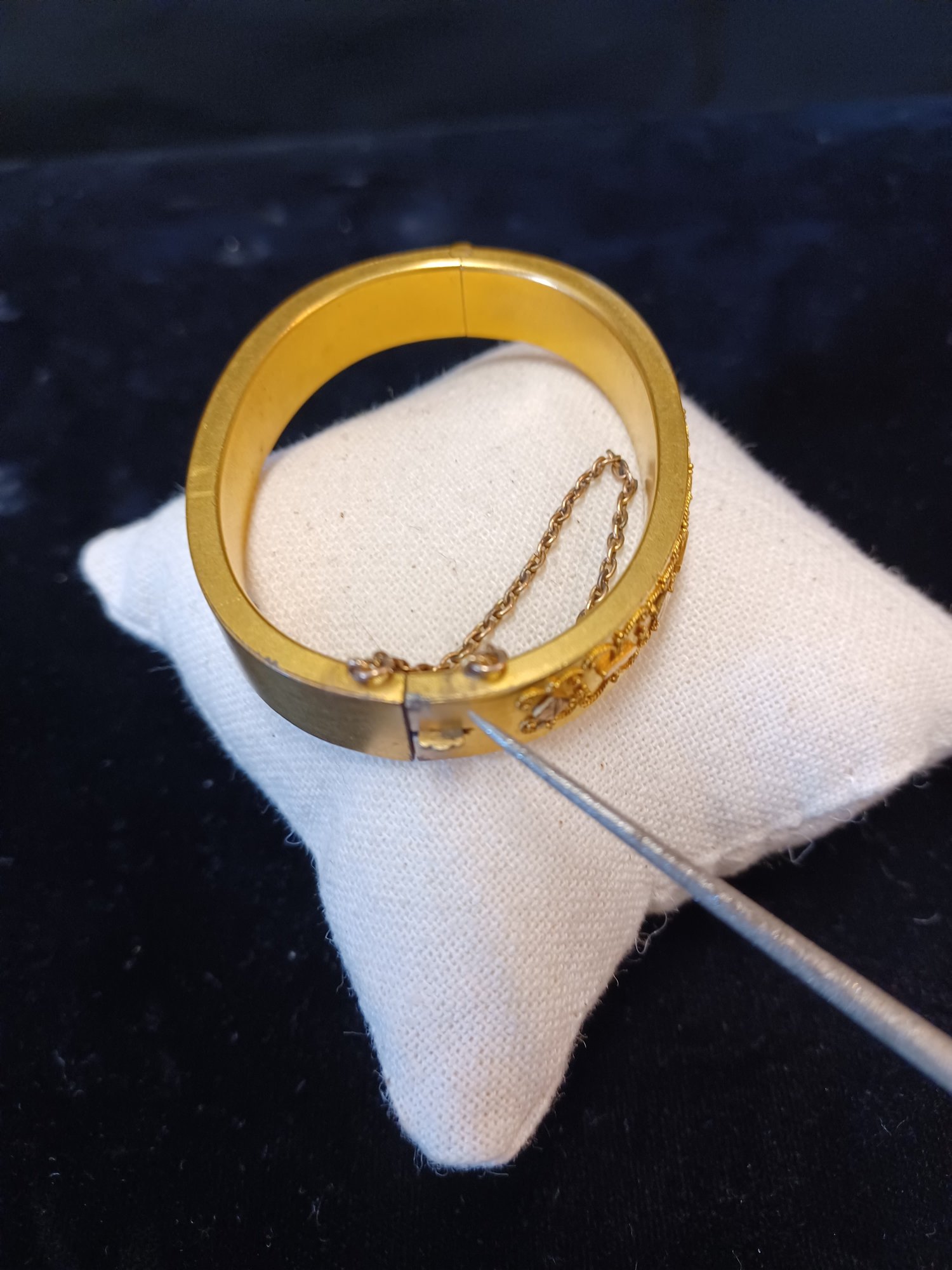 Some wear and scuffs; shows some corrosion; beautiful filigree work on topside of cuff; * needs cleaning