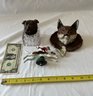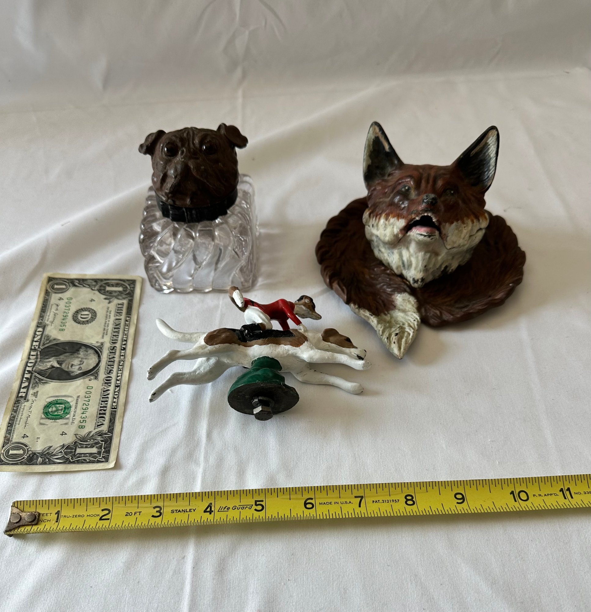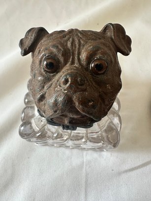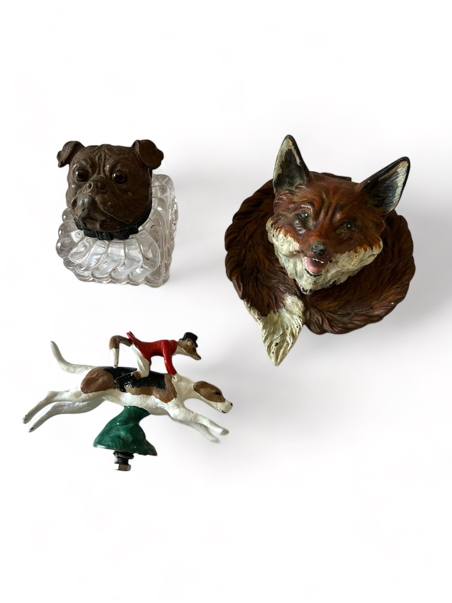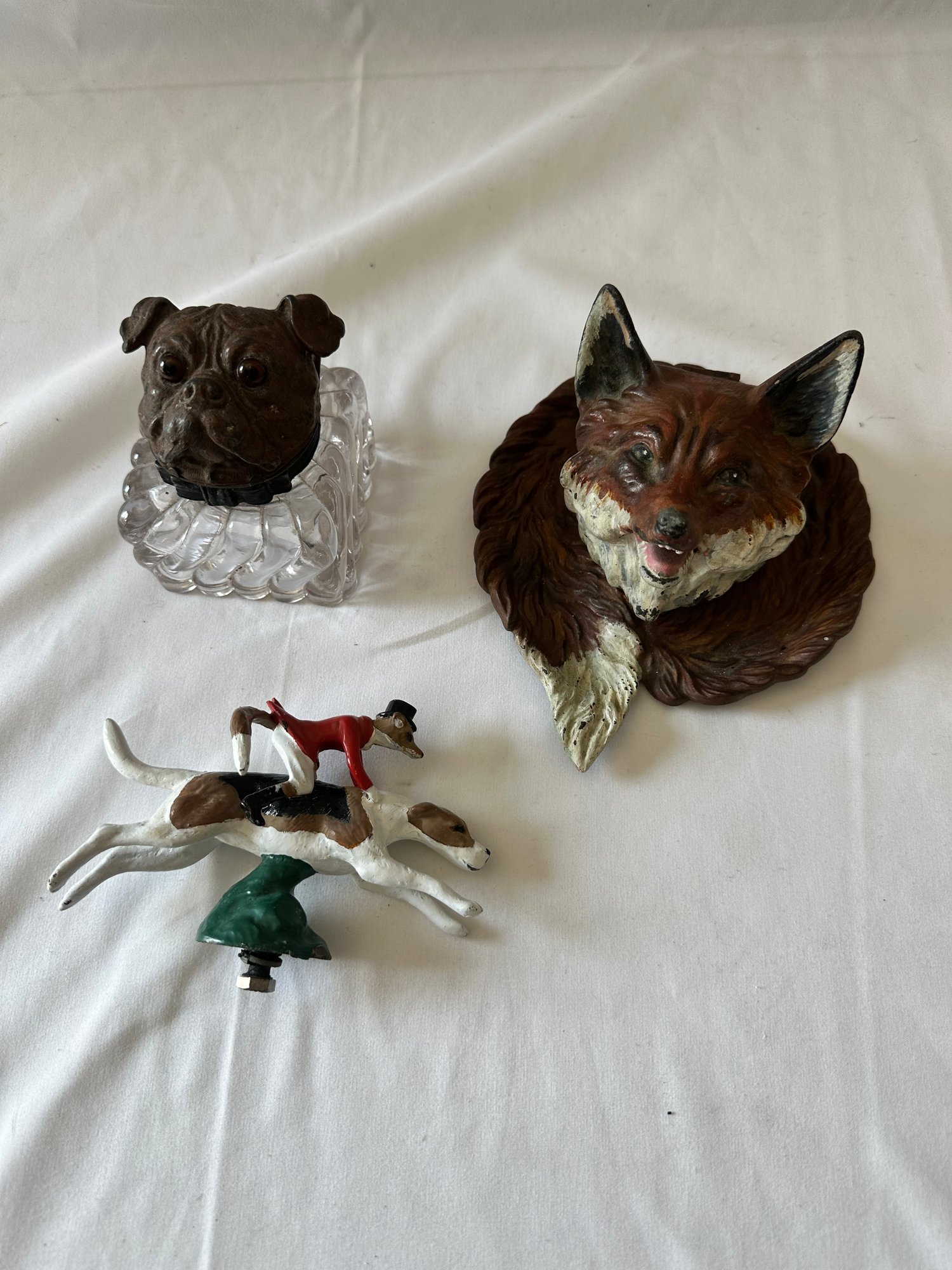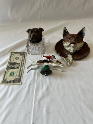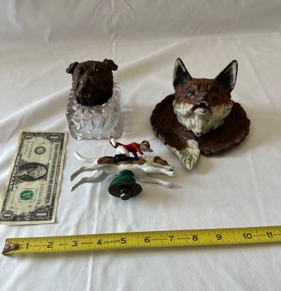 Vintage Inkwells and Metal Fox and Dog (2 inkwells 1 metal dog)