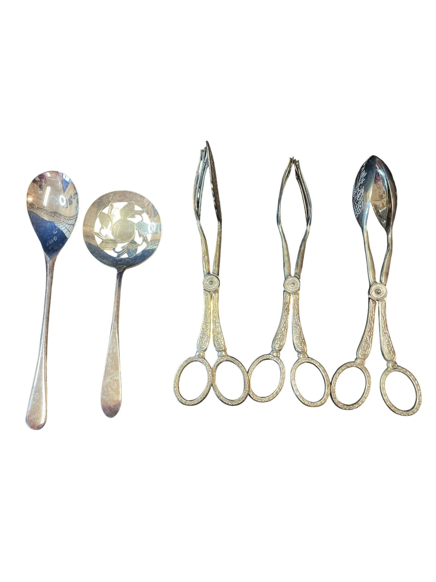 Assoeted lot of serving utensils including a solid spoon, a slotted berry or casserole spoon with a decorative cut-out, and three pairs of scissor-style serving tongs.