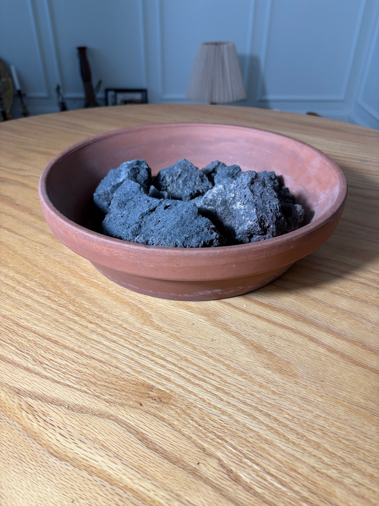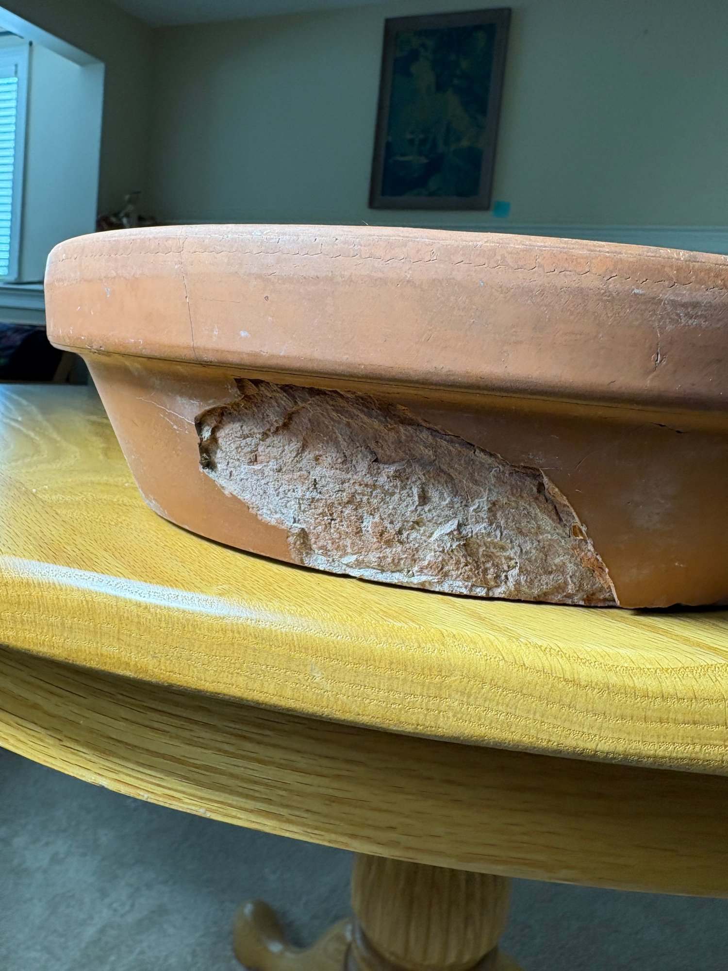 Dimensions for terracotta bowl approximately 13 inches in diameter. 3 inches tall