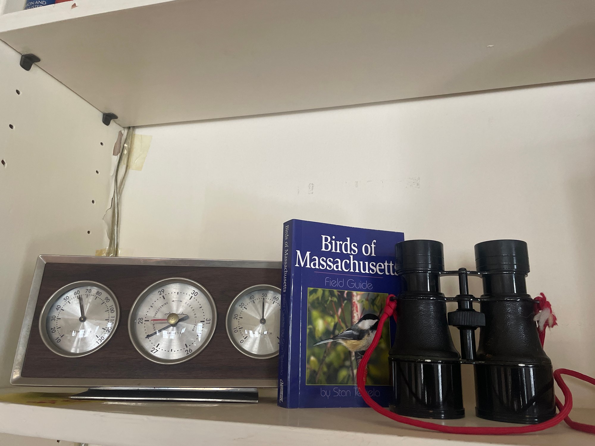Airguide barometer, binoculars no markings, ‘Birds of Massachusetts’ paperback
