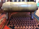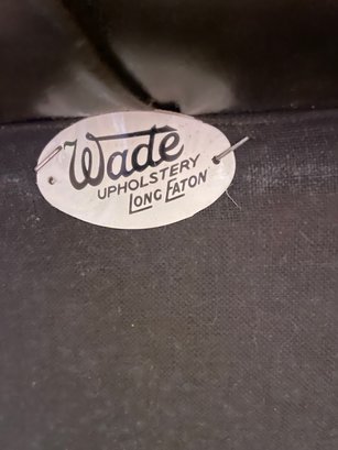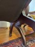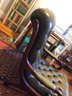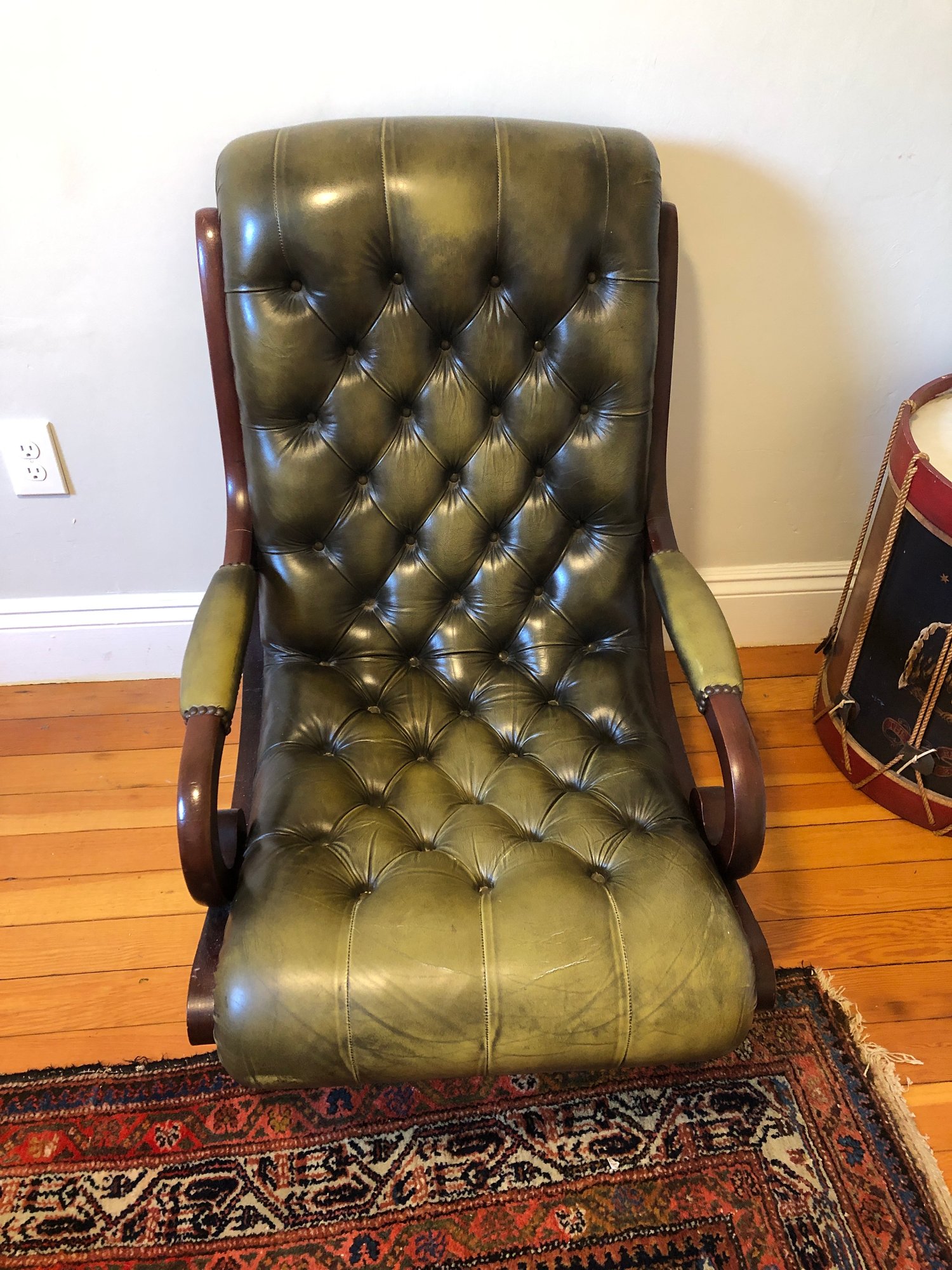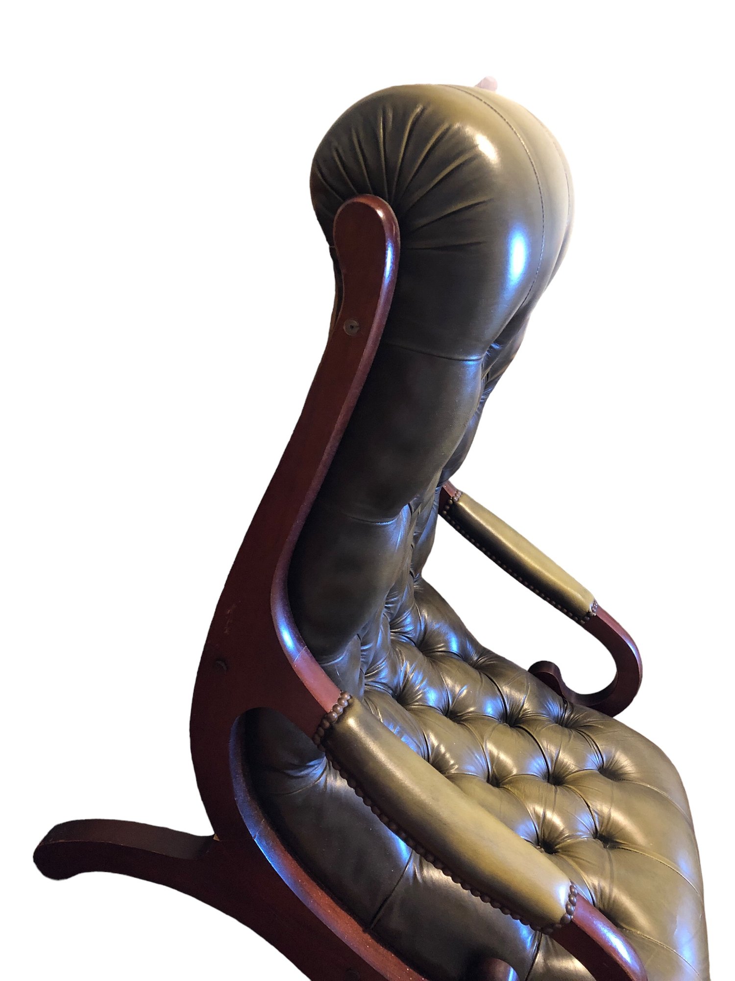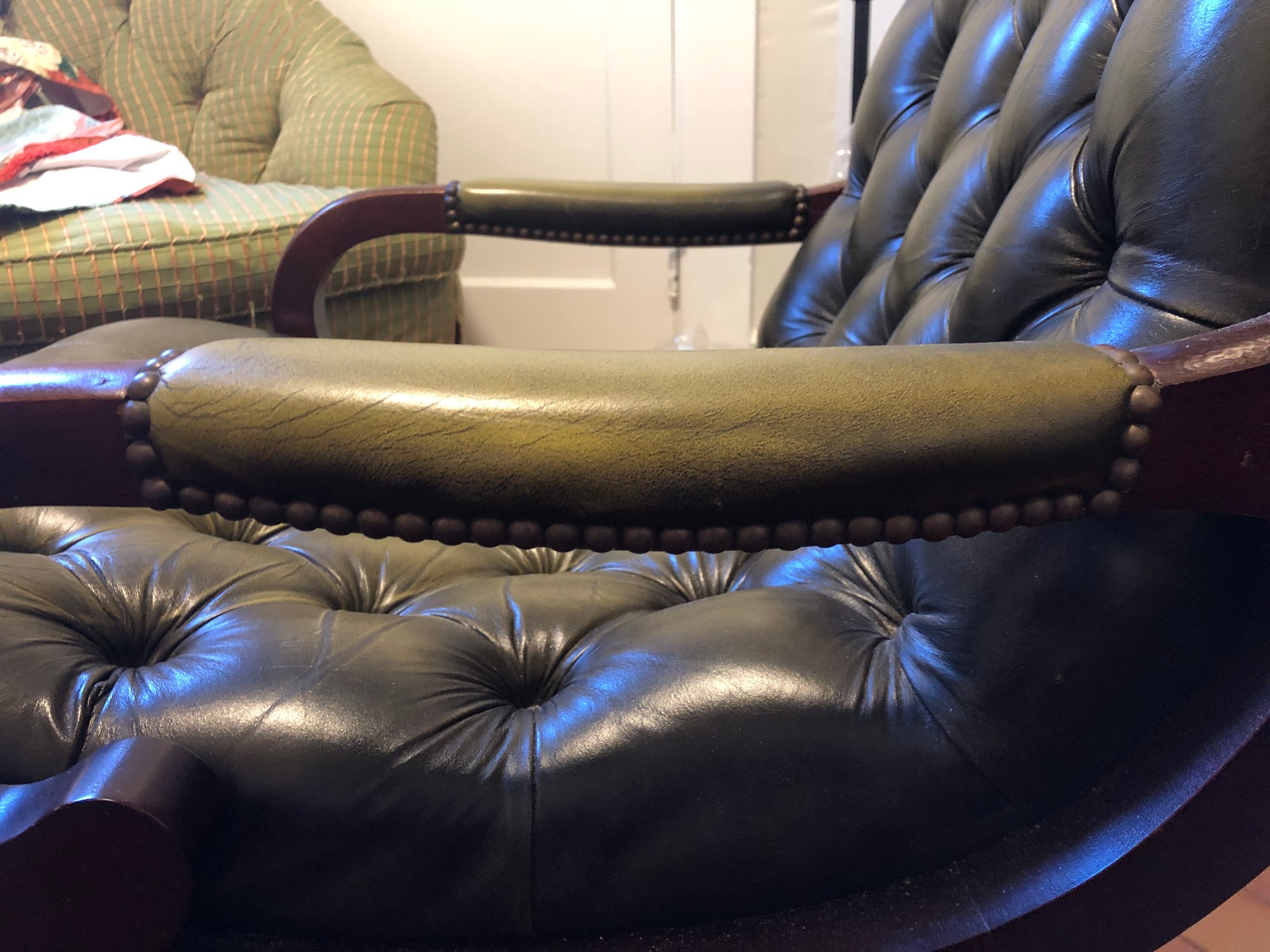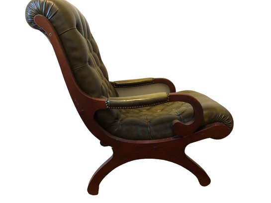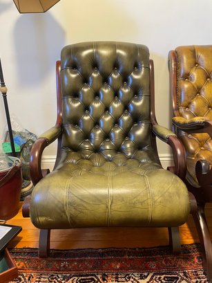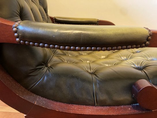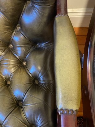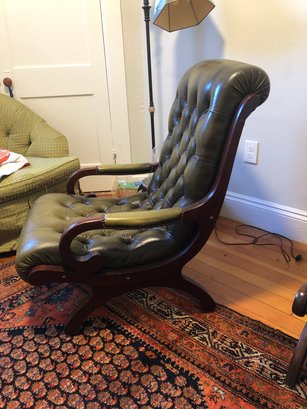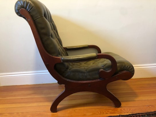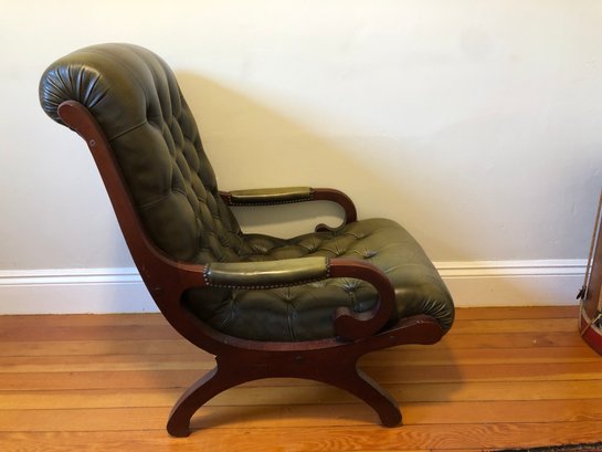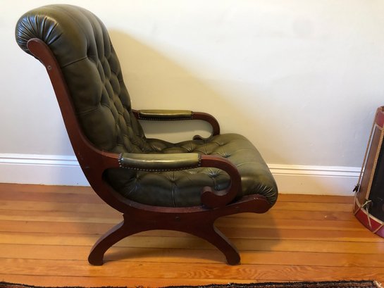 green upholstered leather chair with mahogany wood backing and legs, tufted seat & back, nailheads on leather arms