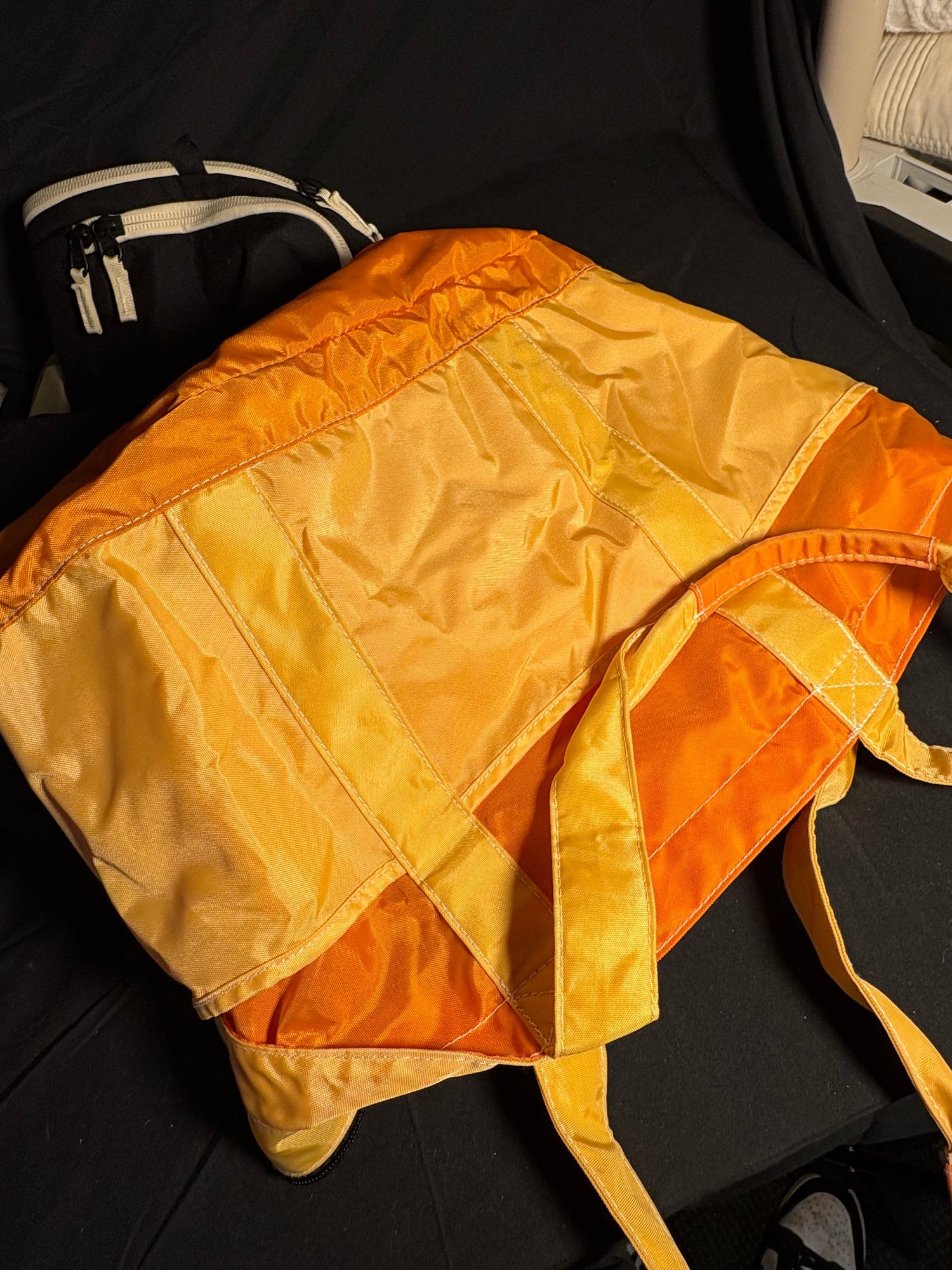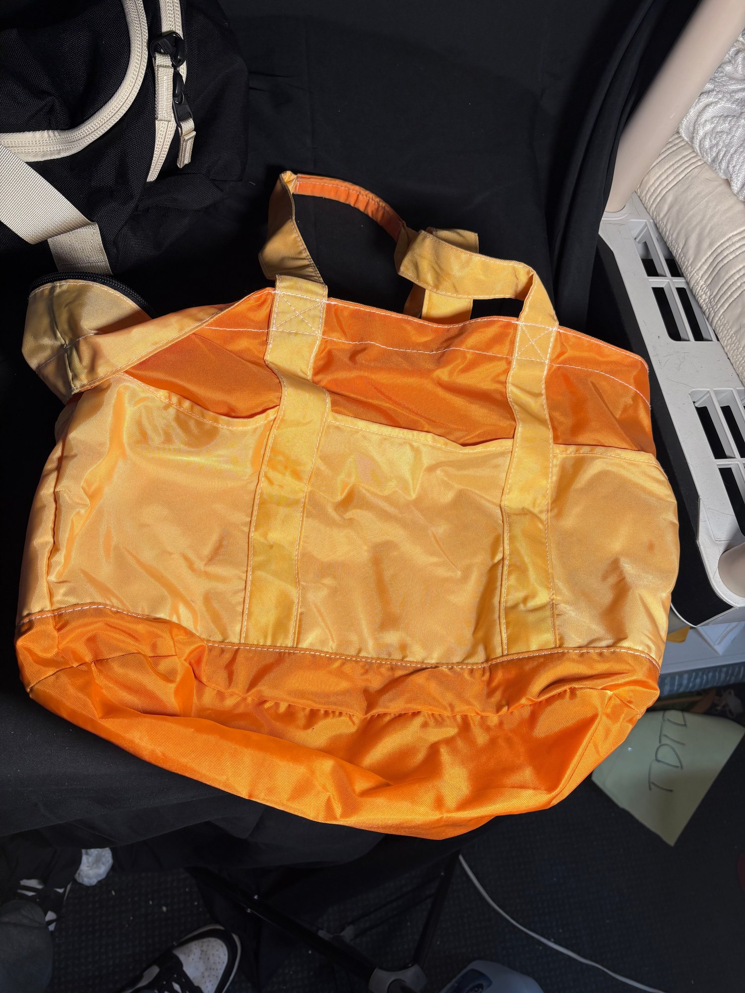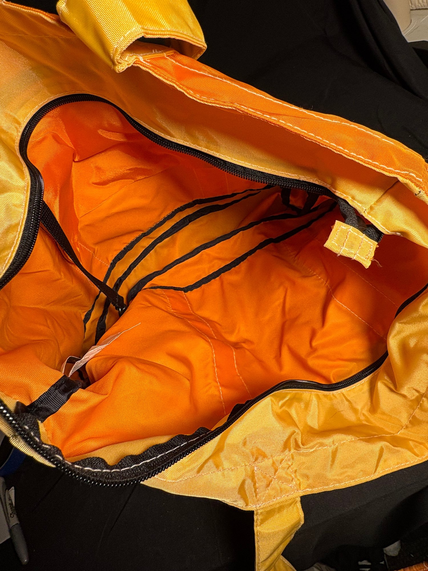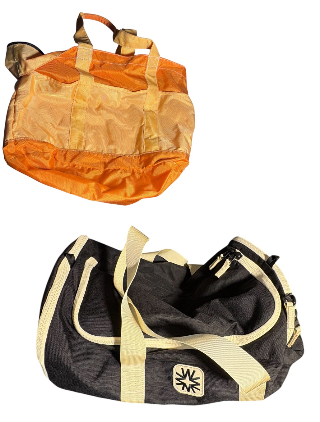 Dimensions black duffel bag approximately 17.5 by 6.25 inches tall. Orange handbag approximately 16 by 13 inches tall