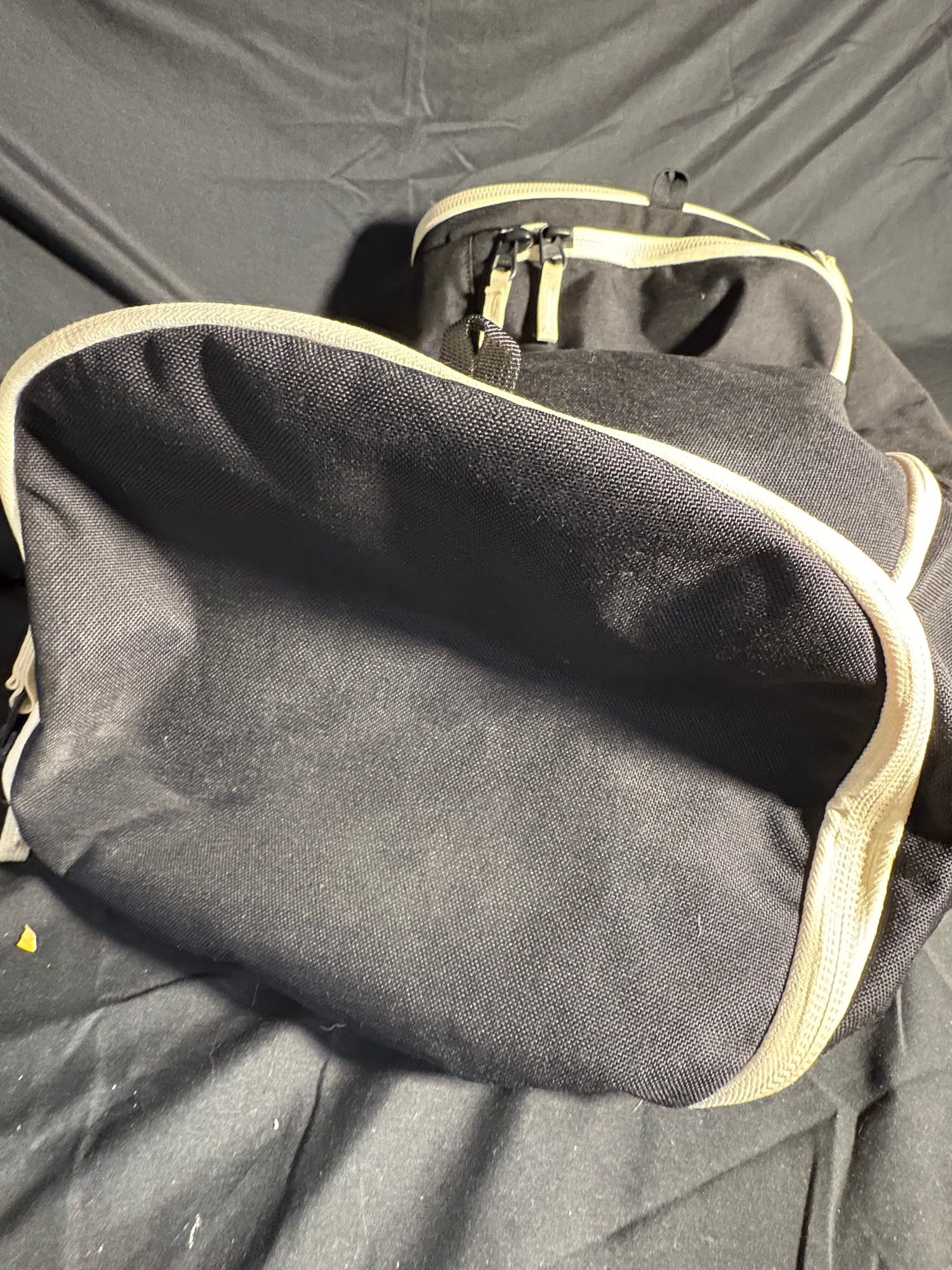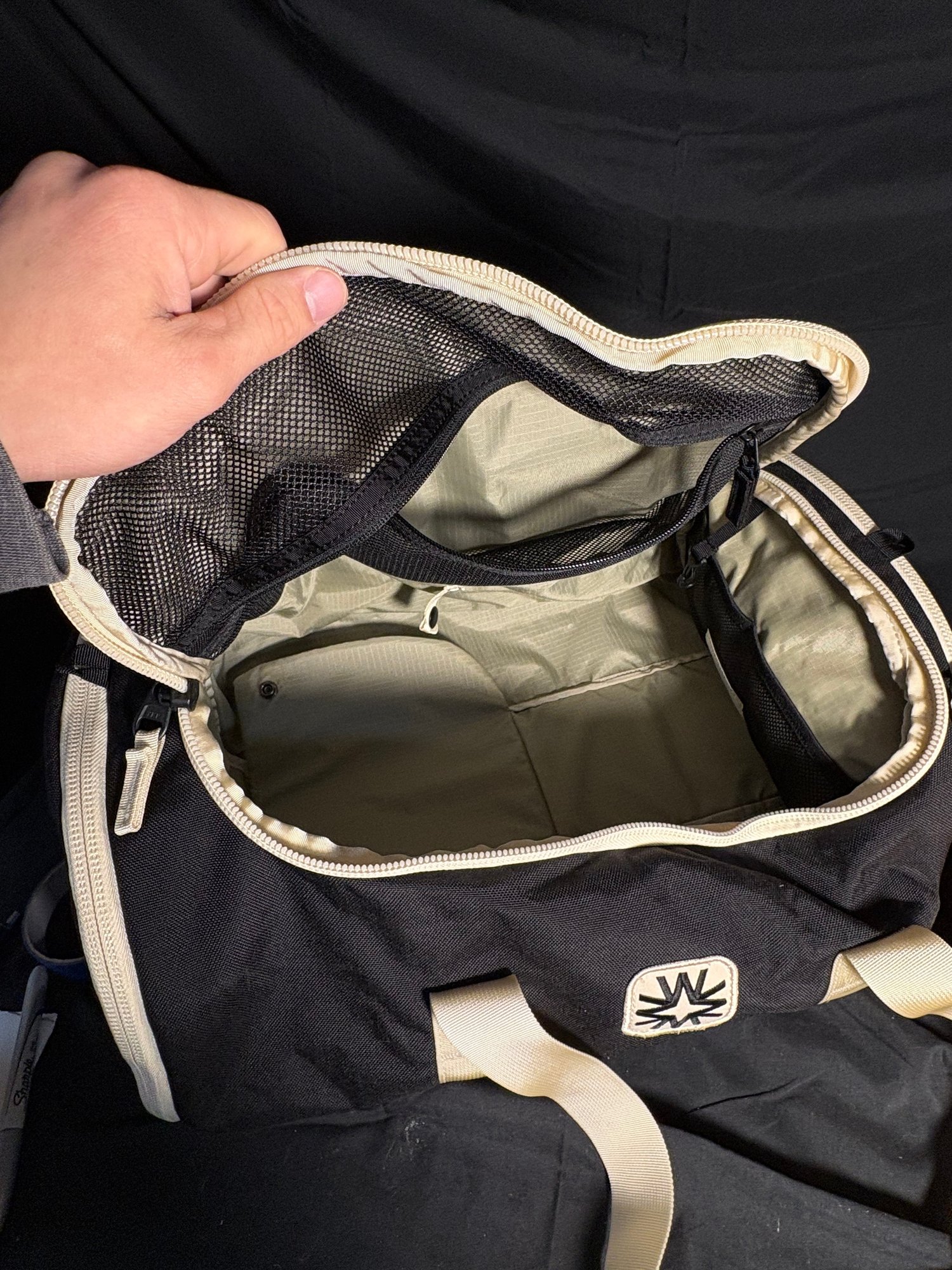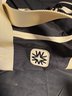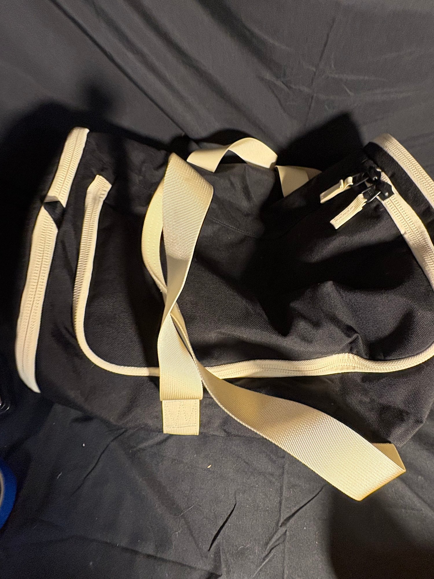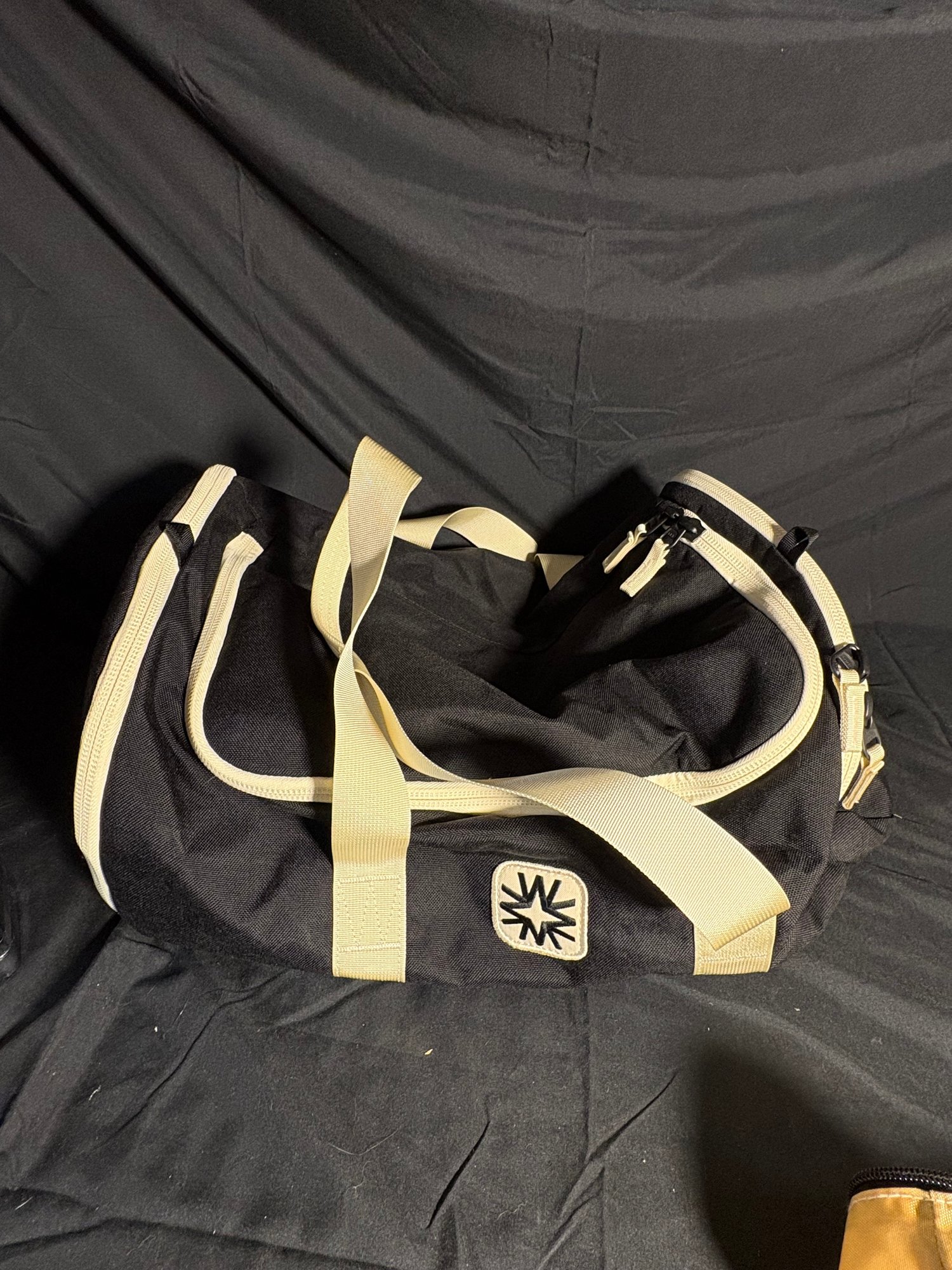 Dimensions black duffel bag approximately 17.5 by 6.25 inches tall. Orange handbag approximately 16 by 13 inches tall