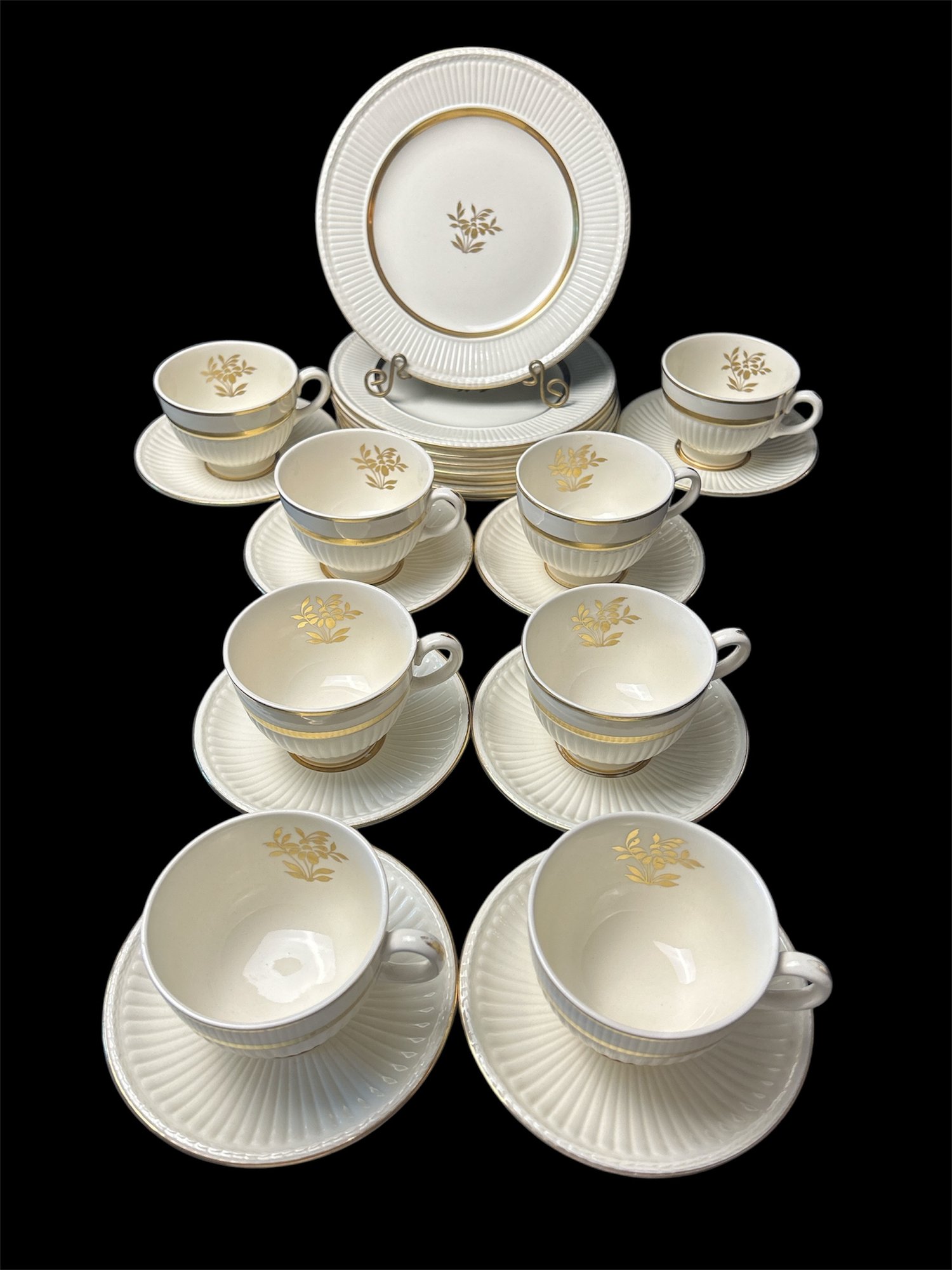There are a few chips on dishes, pictured, one on a teacup, others on bottoms of plates, cup bases. Everything otherwise is in relatively good condition despite there being some wear on the gold trim on plates.