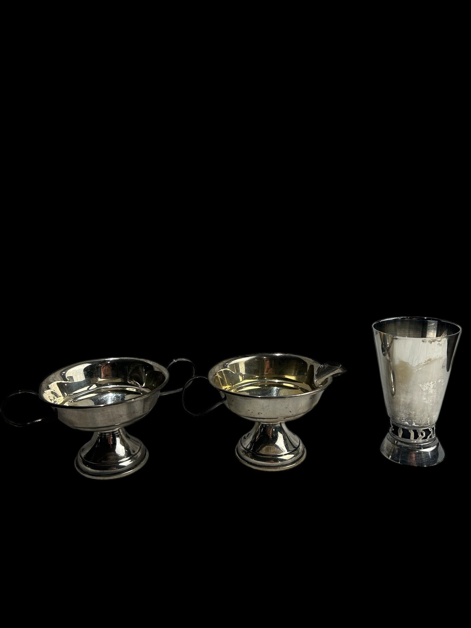 3 piece nickel silver cups, 2 tea, 1 kiddush