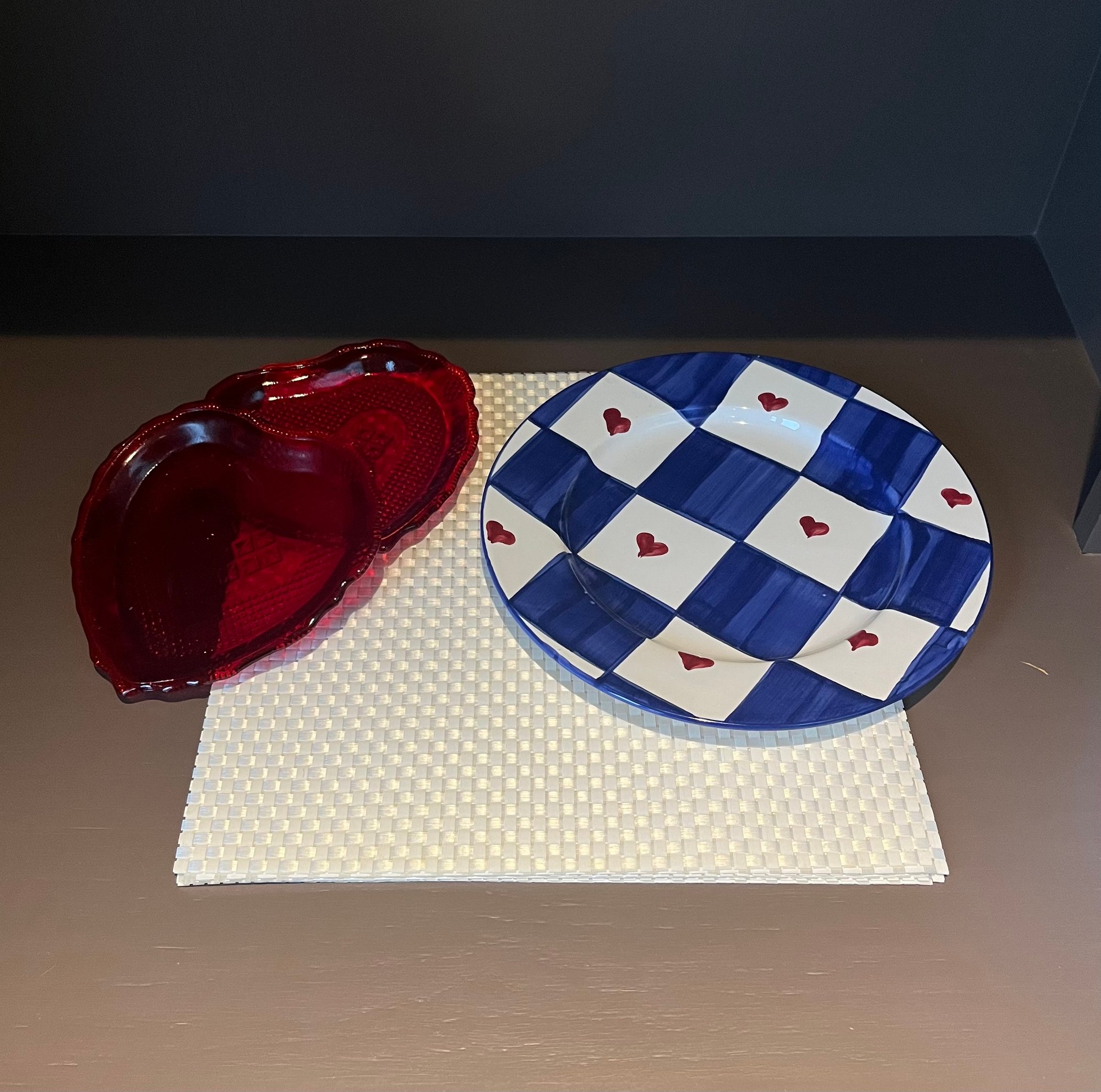 White Plastic Woven Placemats (6x), William Sonoma Blue White Plate, Red, Blue And White Heart