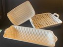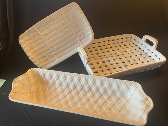 Three White serving trays. Asparagus server with bows 8x12 inches, basket weave tray with handles 11x14inches, basket weave bread tray, 6x19 inches.
