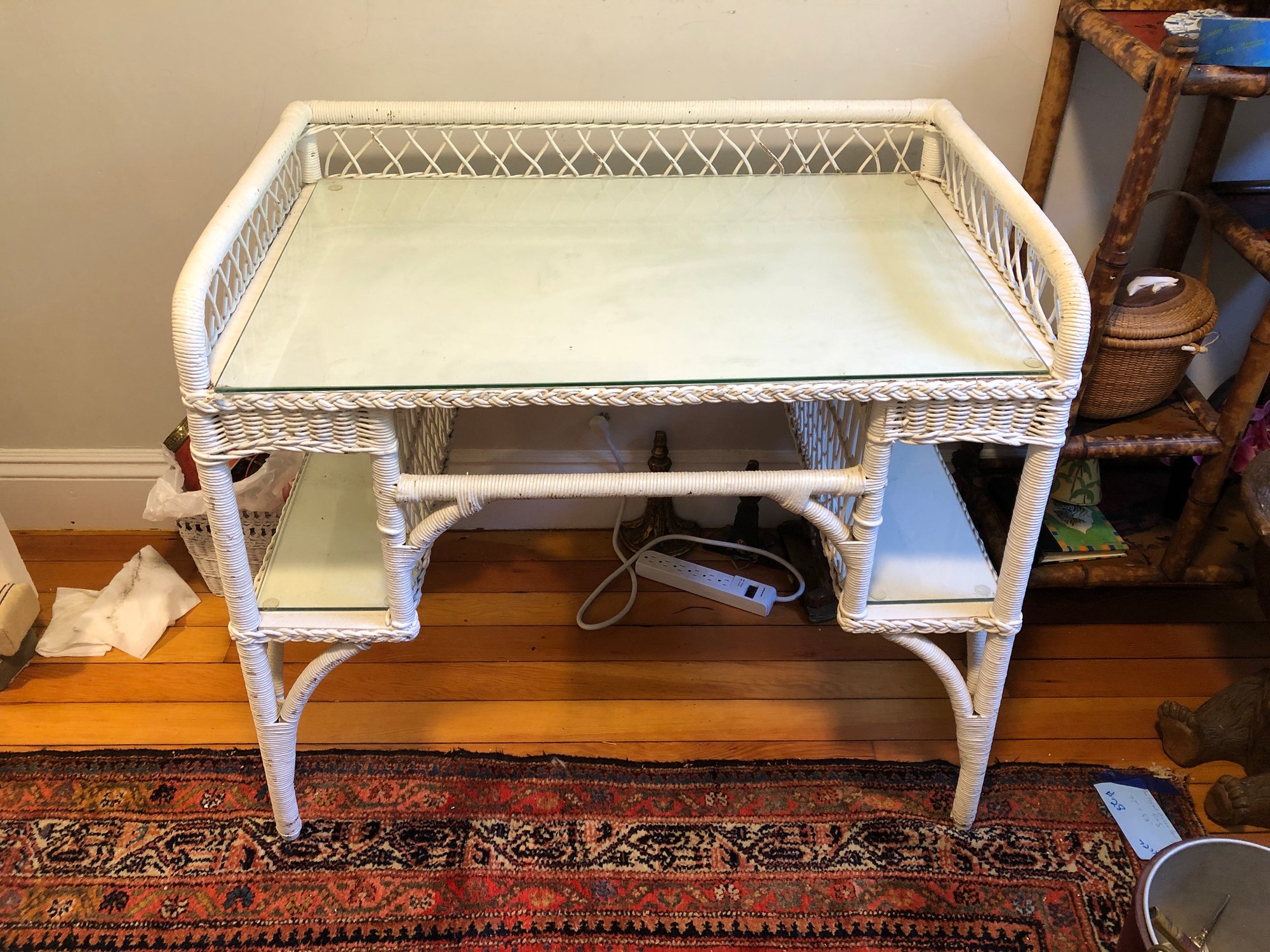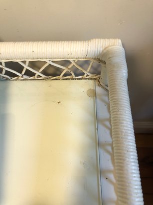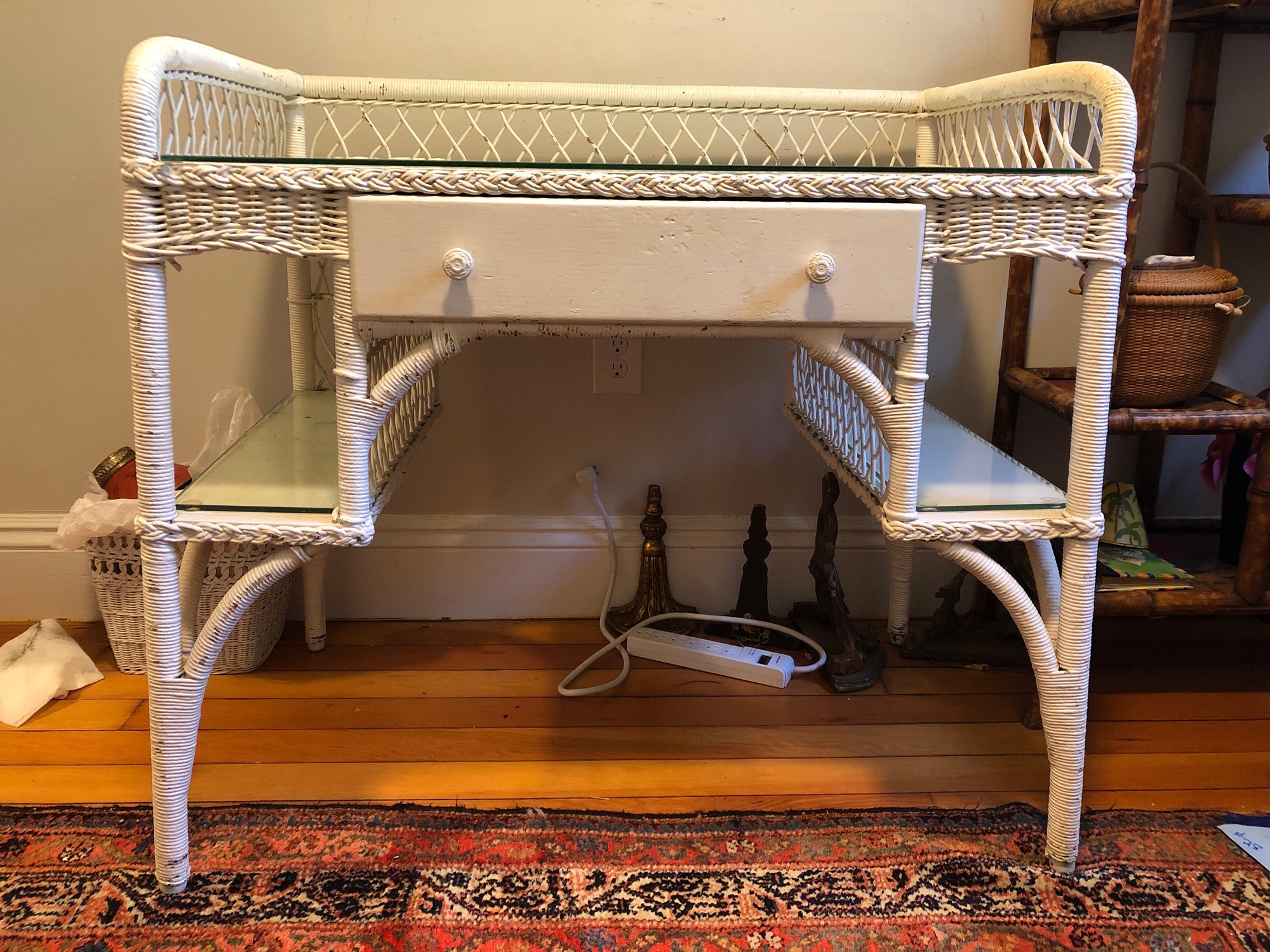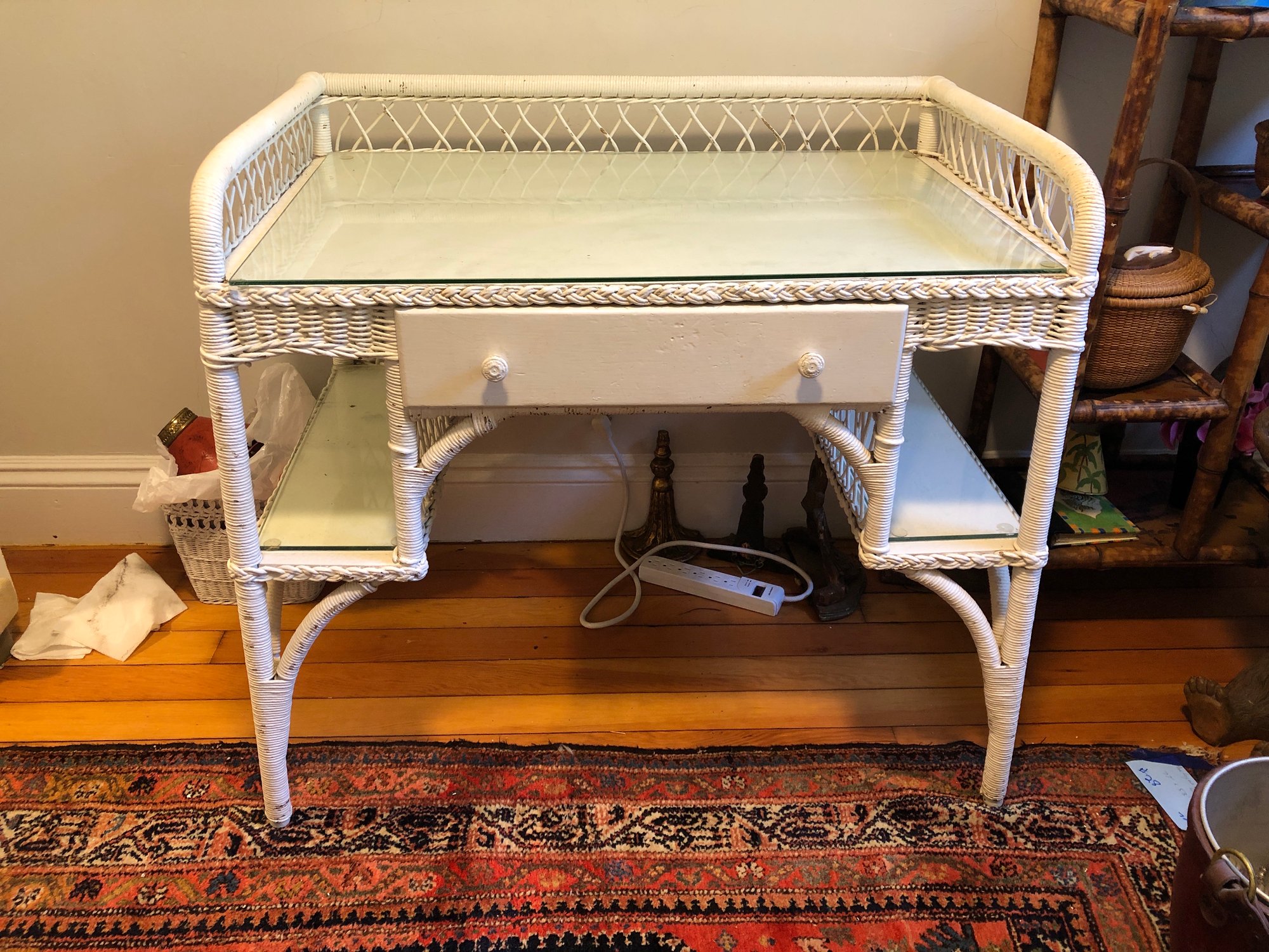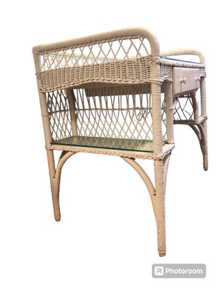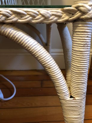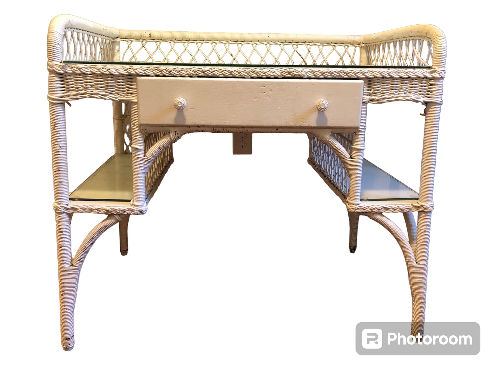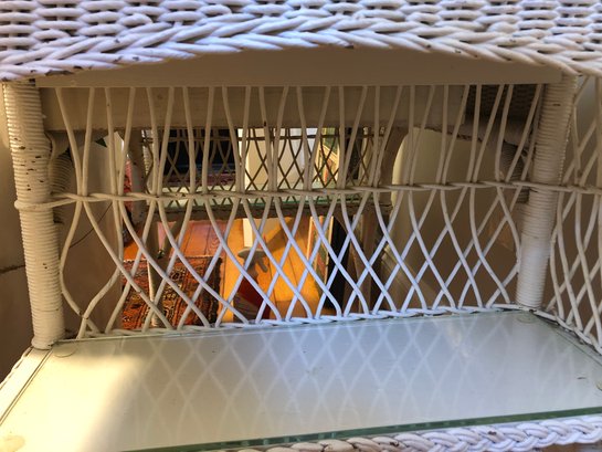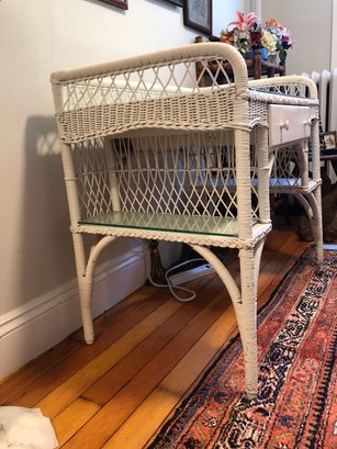 White wicker desk with glass top; small center wooden drawer and two compartments on either side for easy access storage