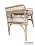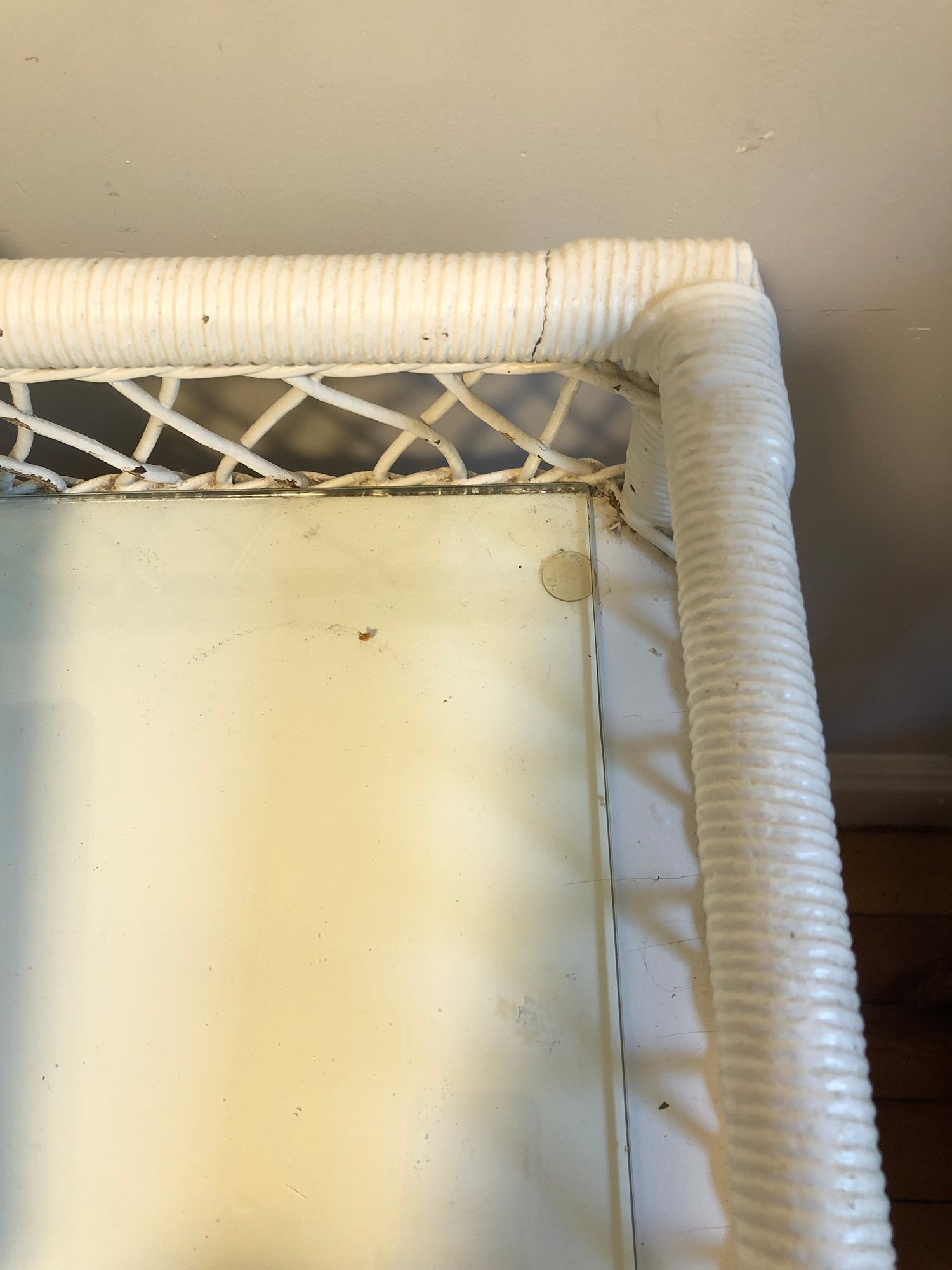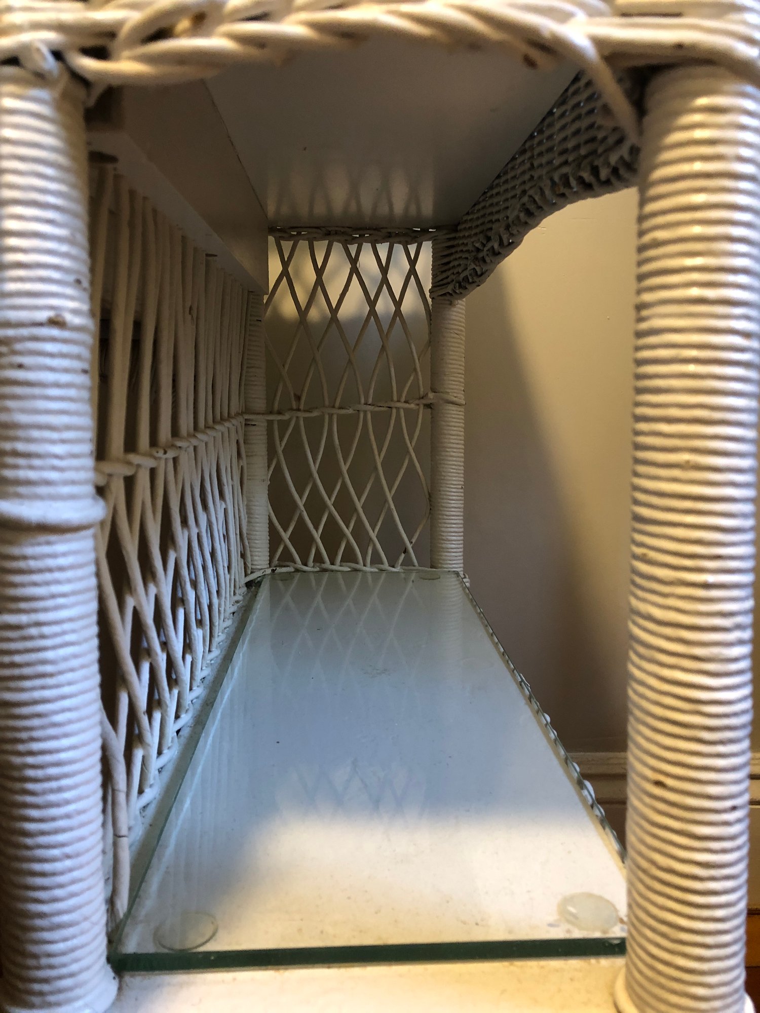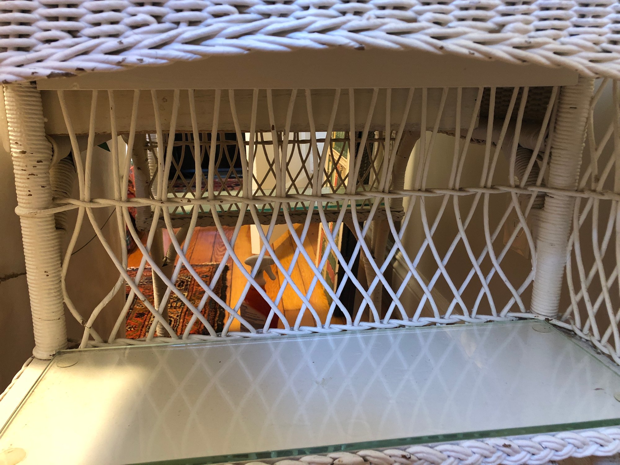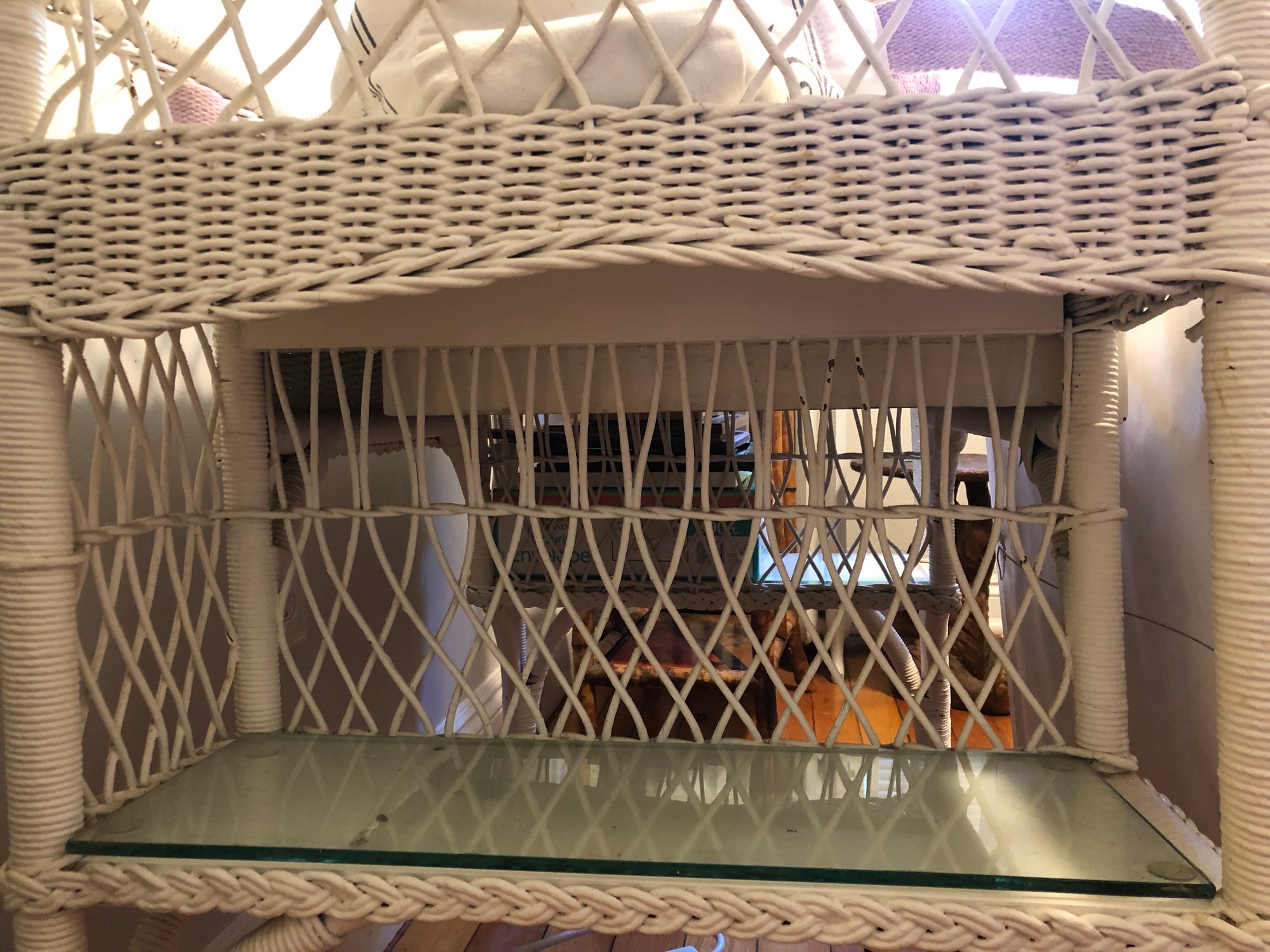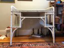 White wicker desk with glass top; small center wooden drawer and two compartments on either side for easy access storage