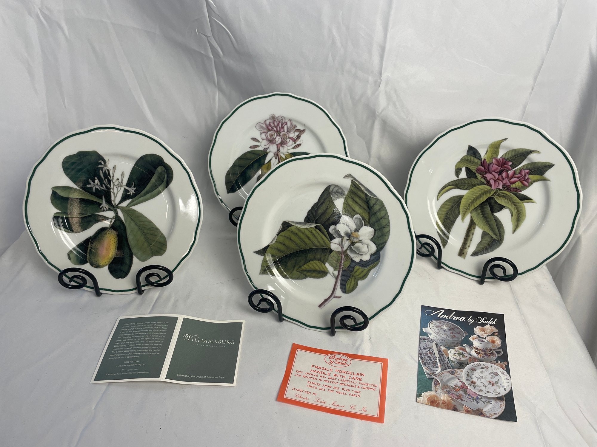 4 porcelain plates with stands and box