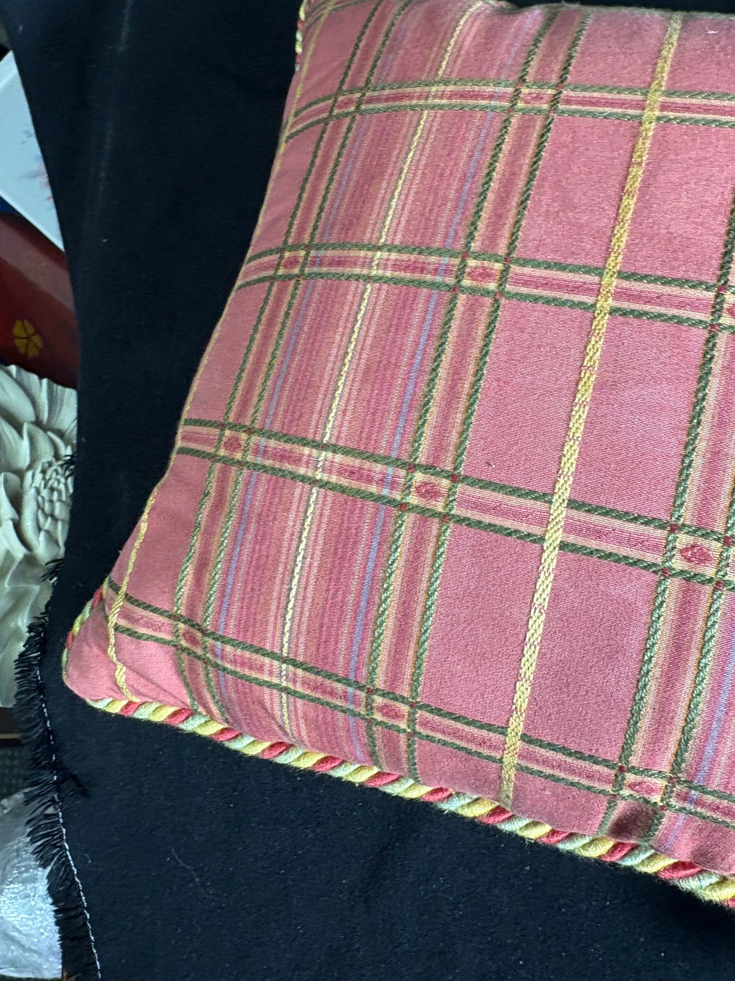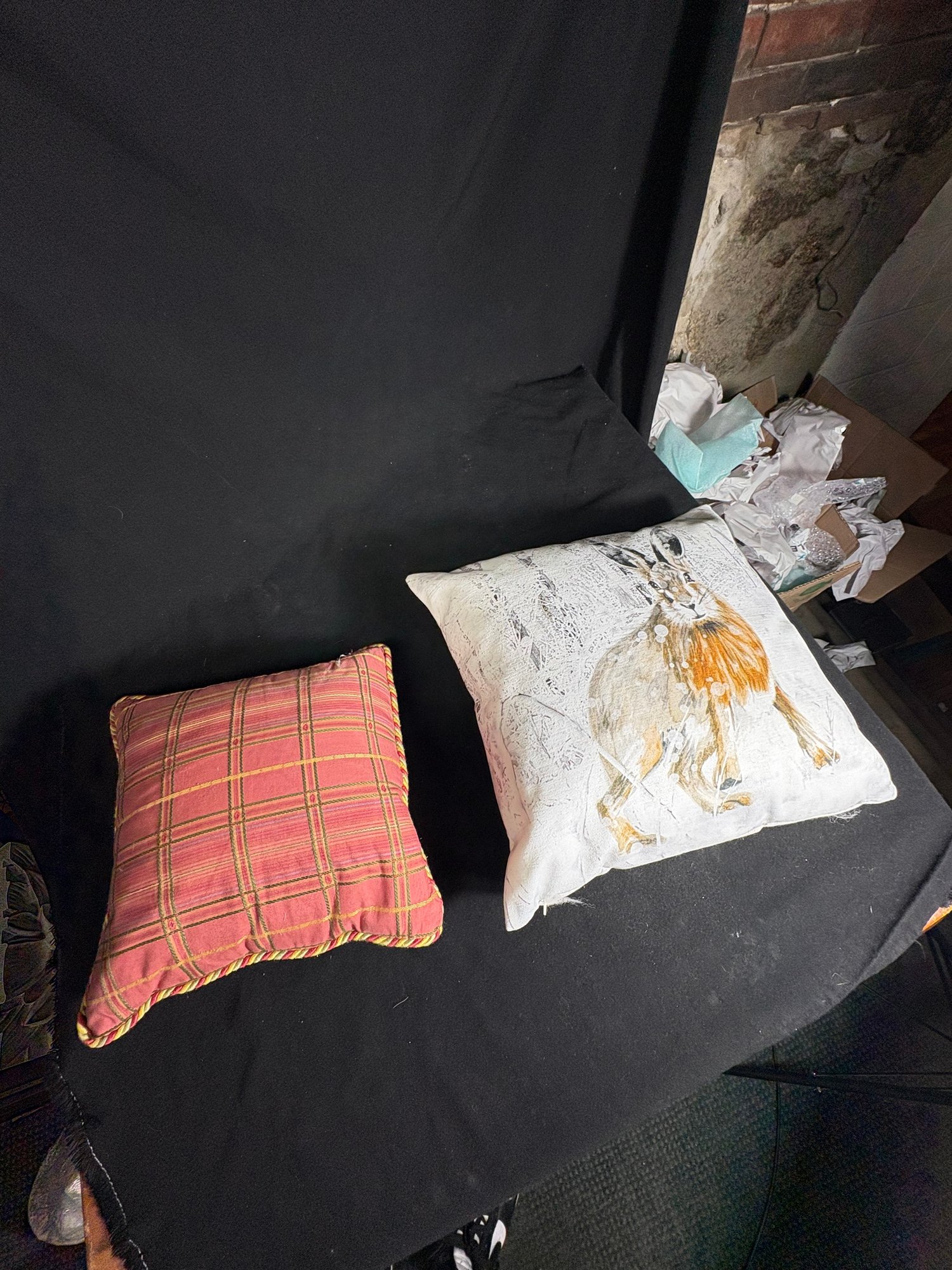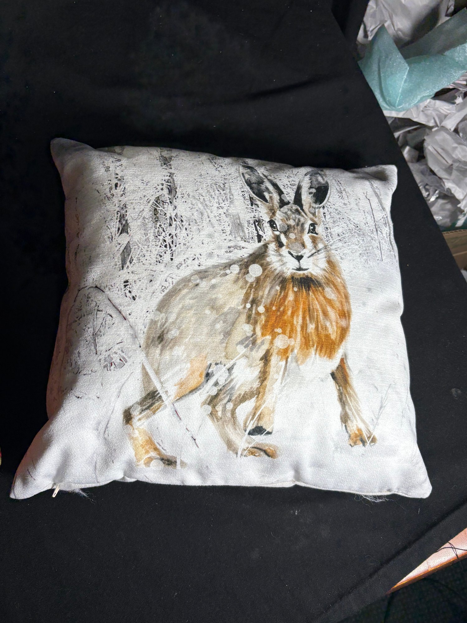 White pillow approximately 16 by 16 inches. Approximately 12 by 15 inches
