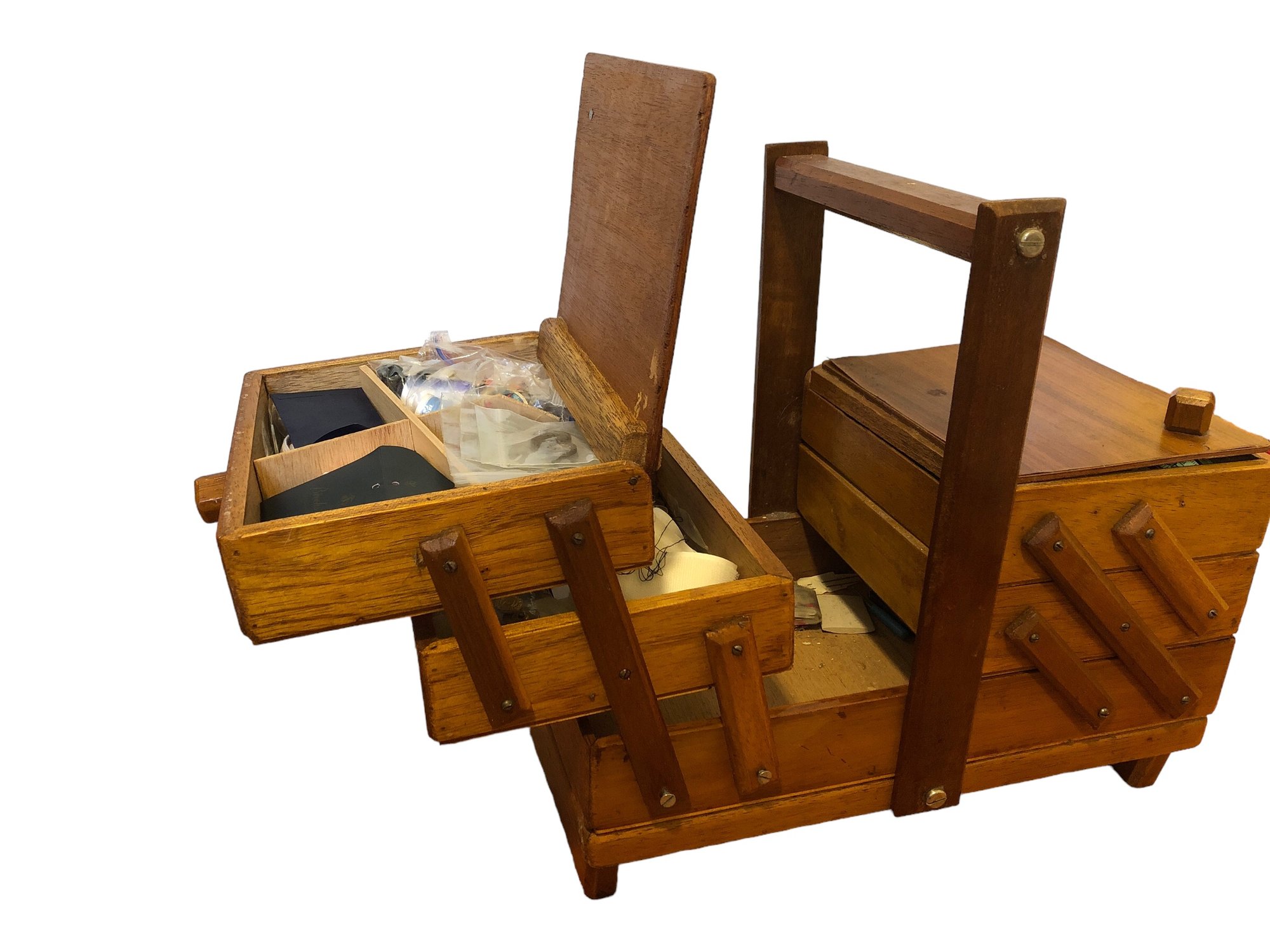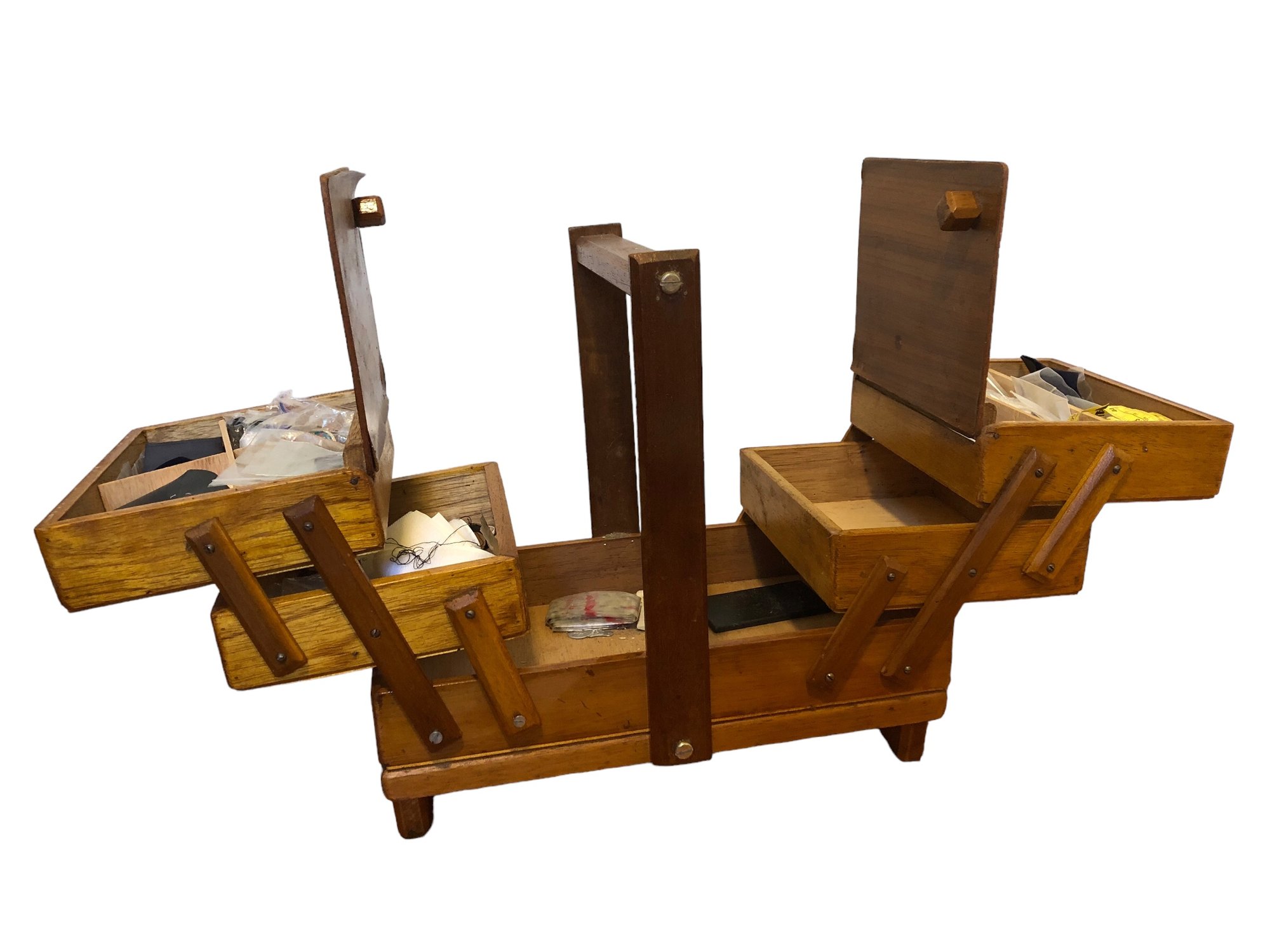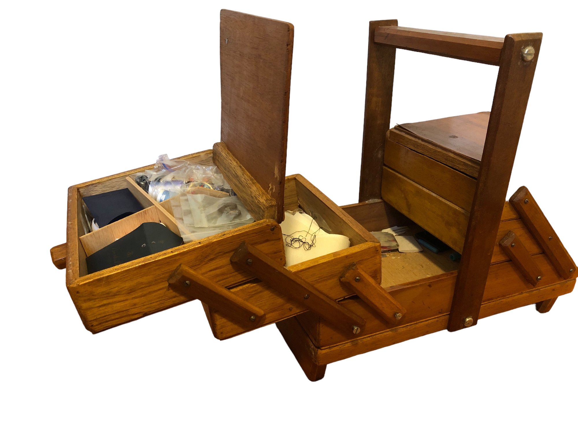linden wood light brown sewing box with extending 3 tiered sewing storage