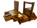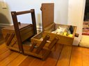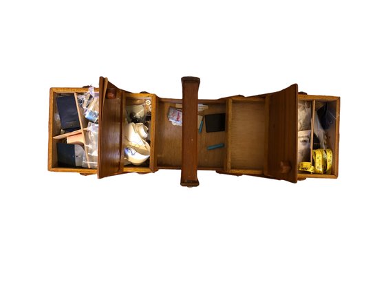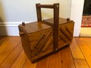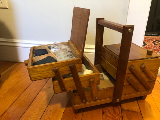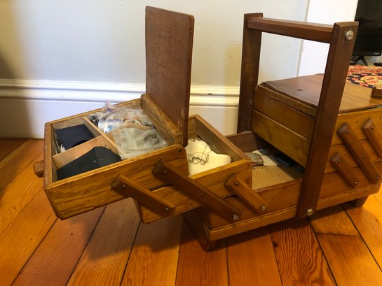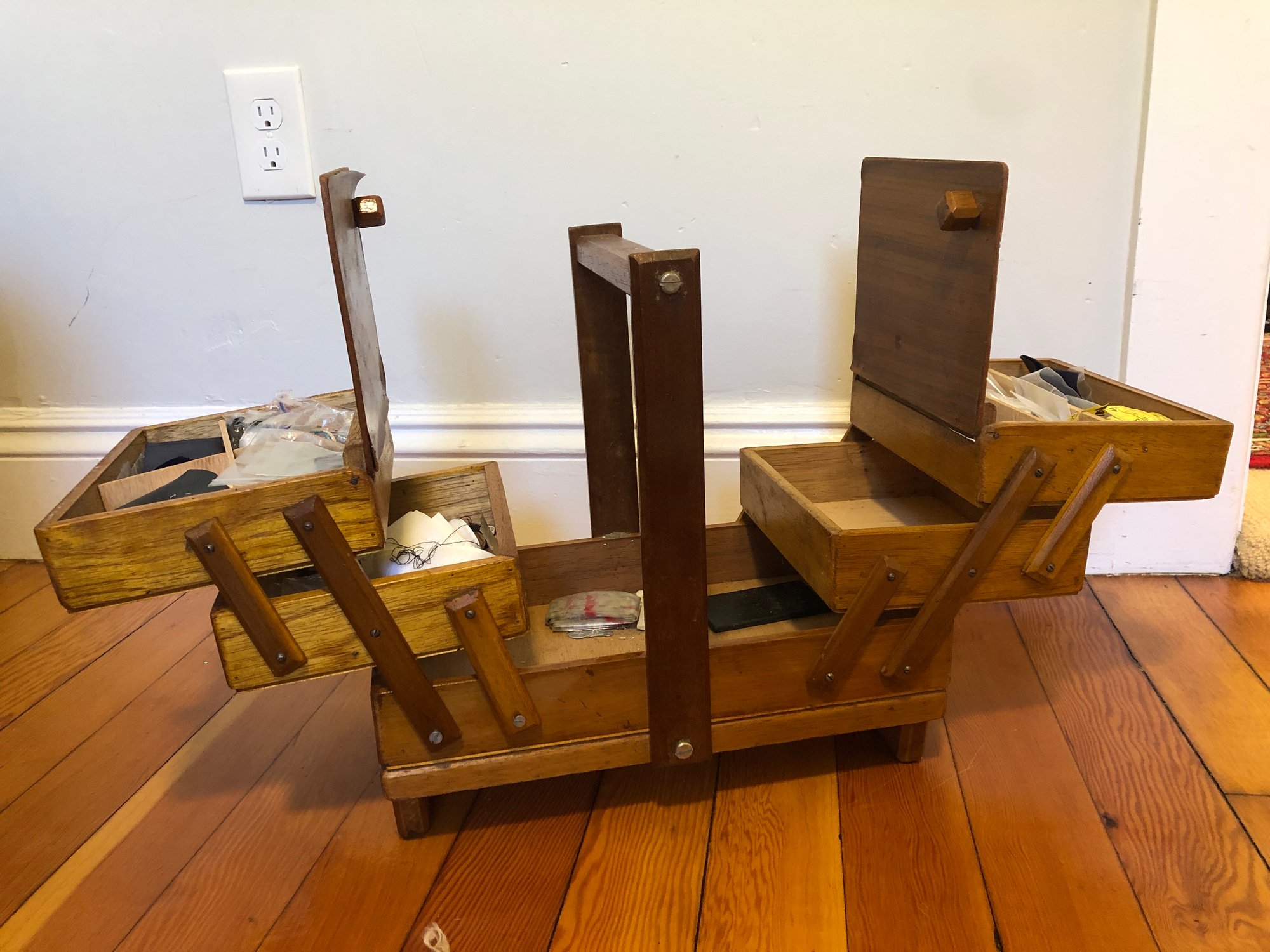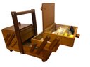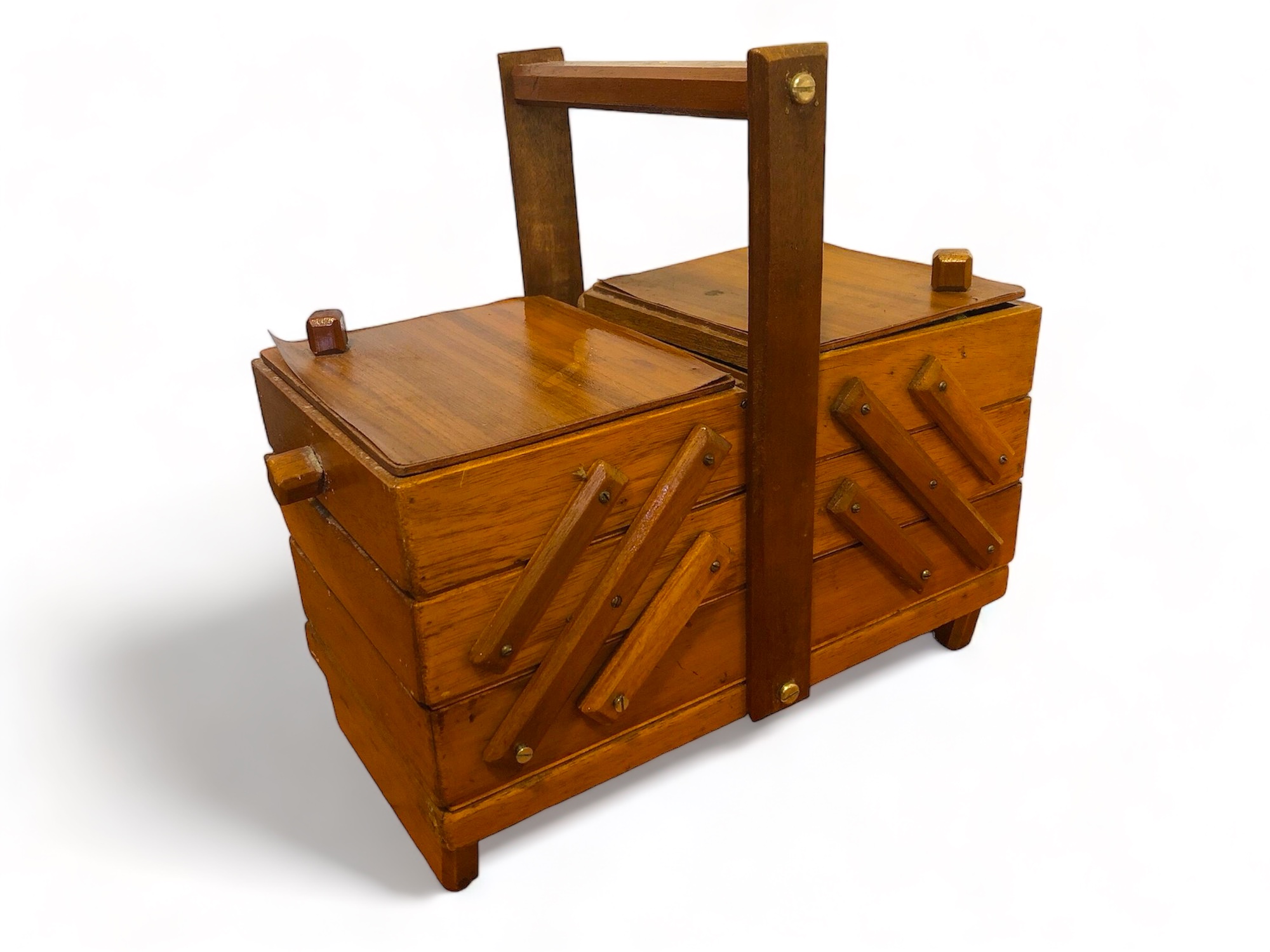 linden wood light brown sewing box with extending 3 tiered sewing storage
