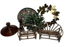 wreaths, wooden benches, metal monkey tray