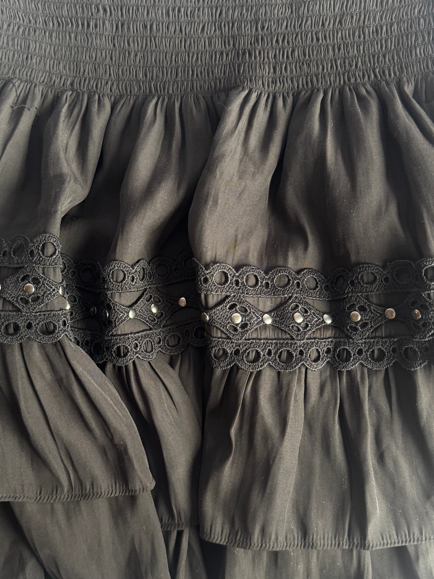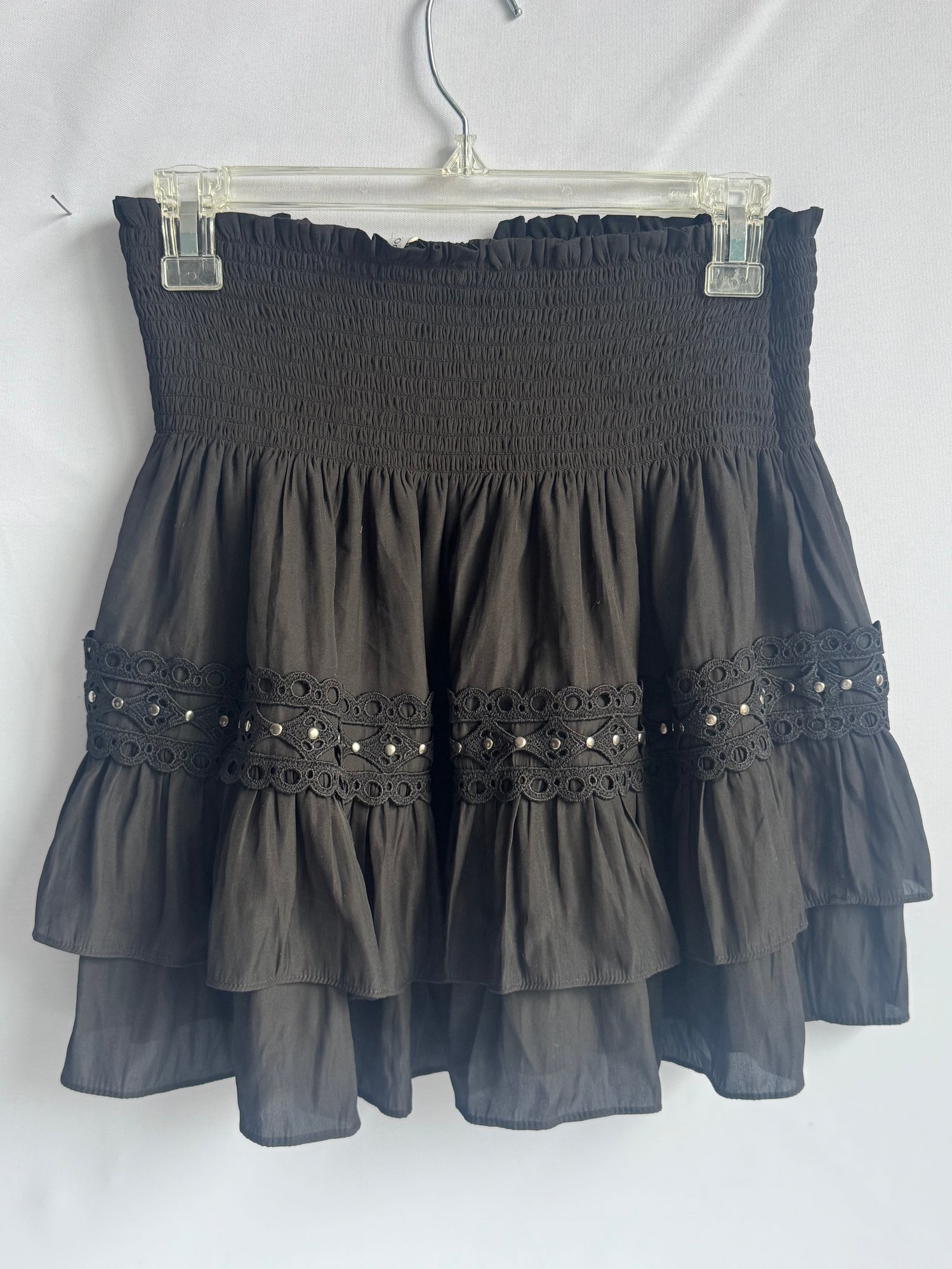 Style: Black, ruffle mini skirt, with metal stud details