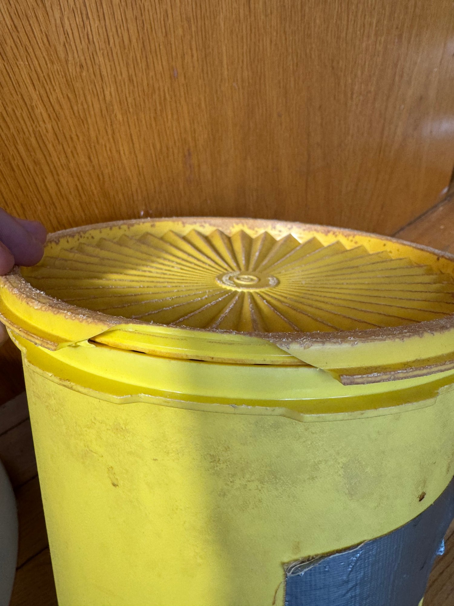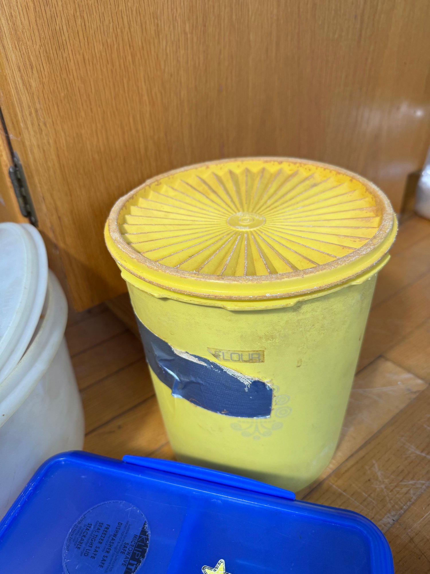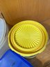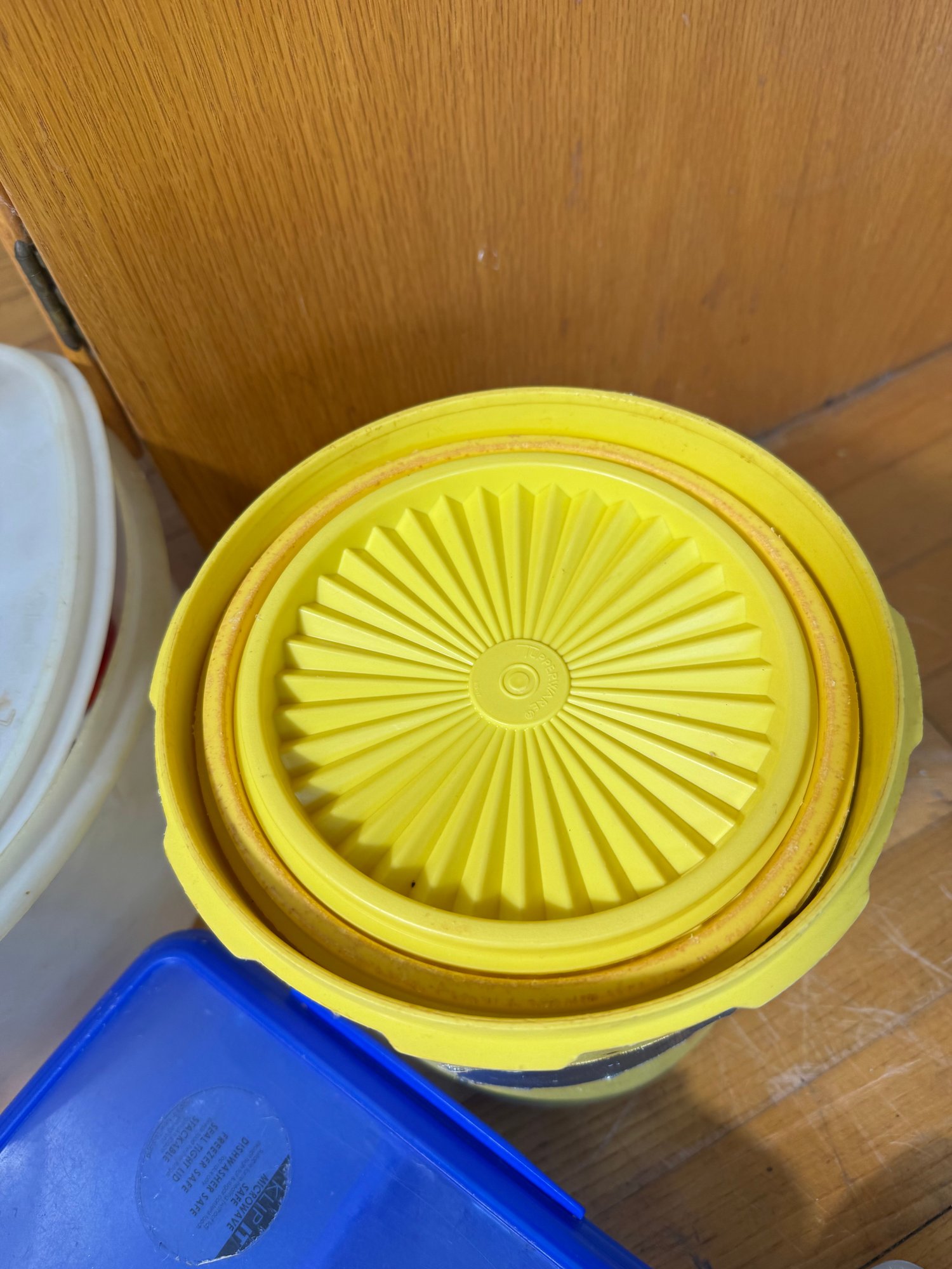 yellow tupperware is damaged, large tupperware storage has a hard time closing