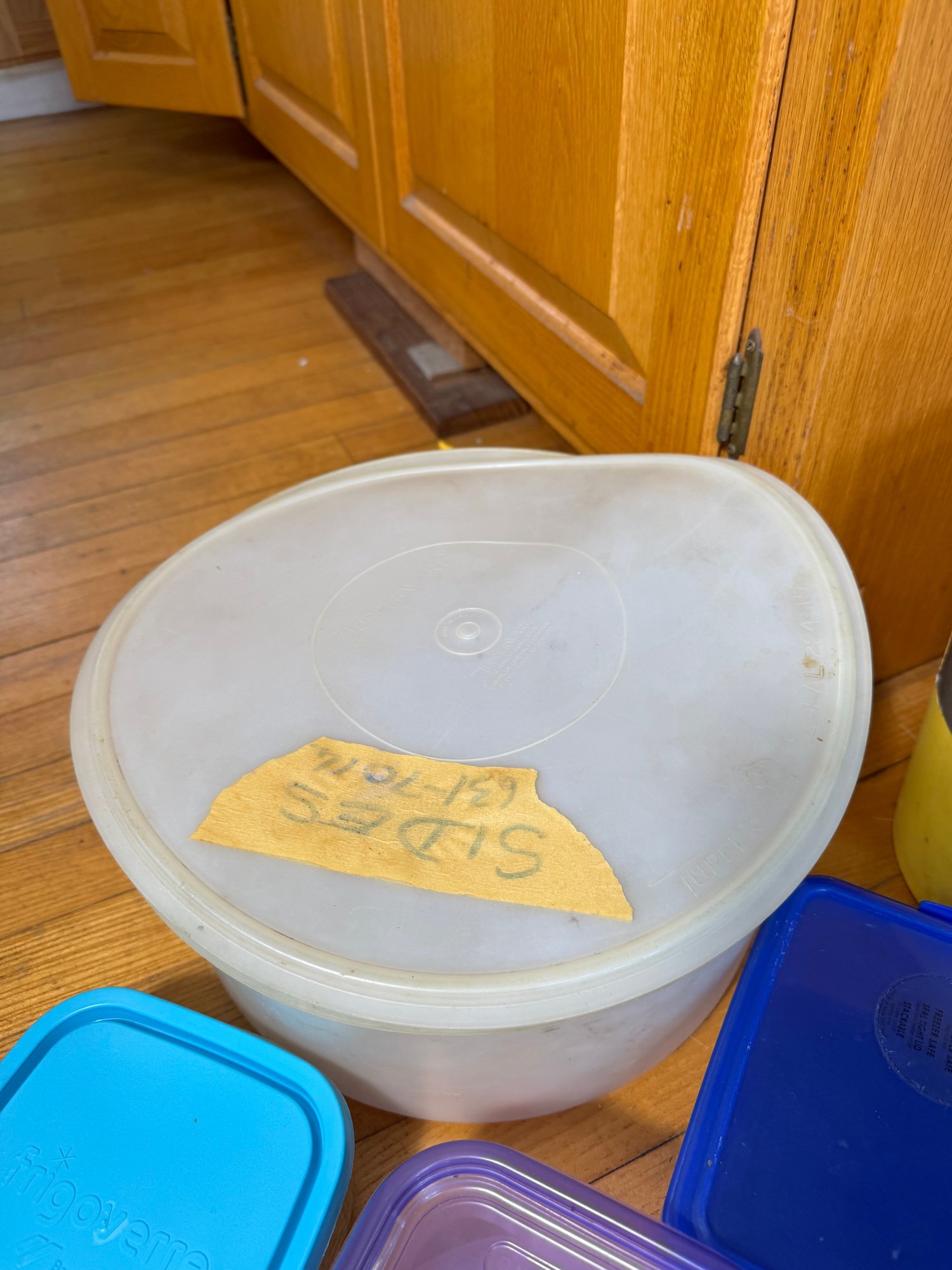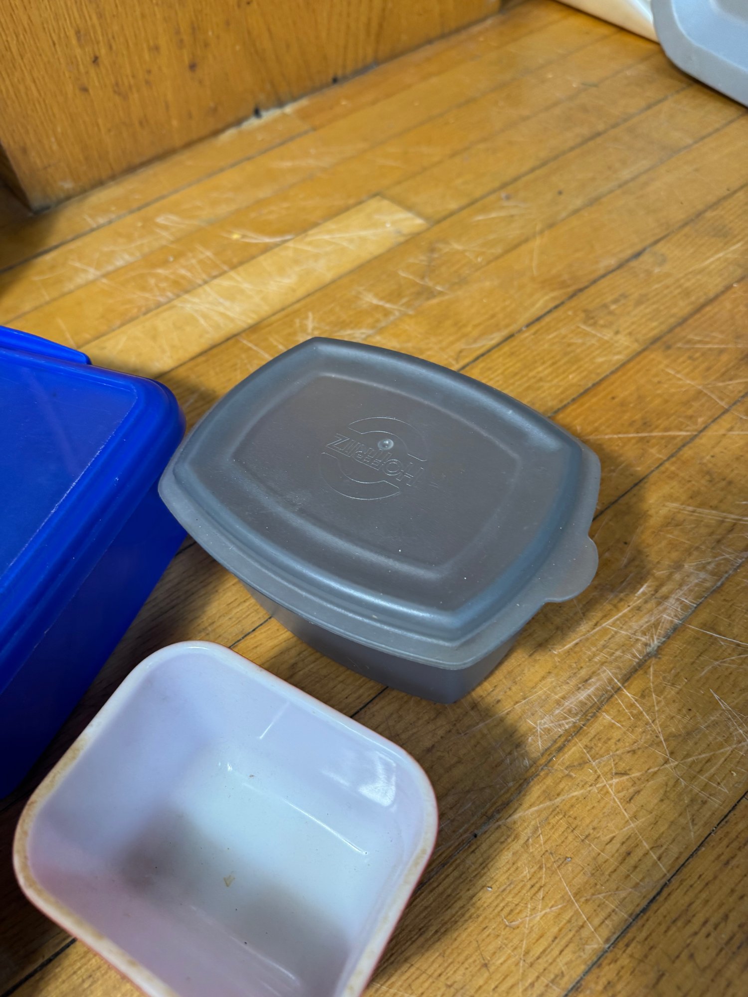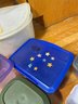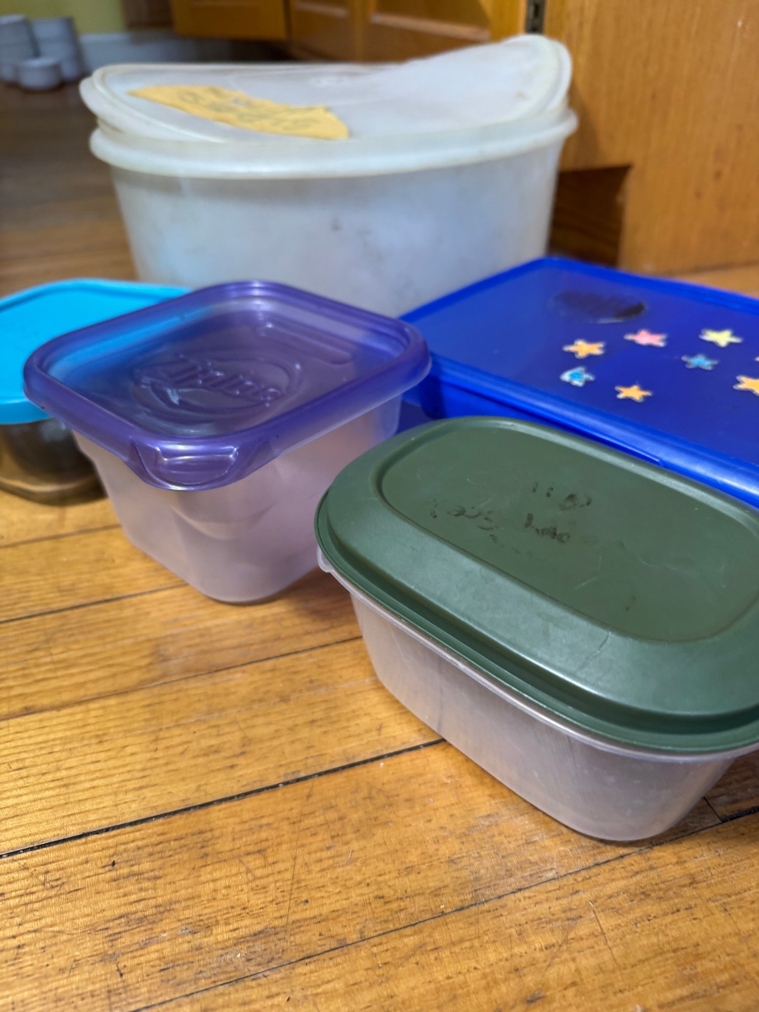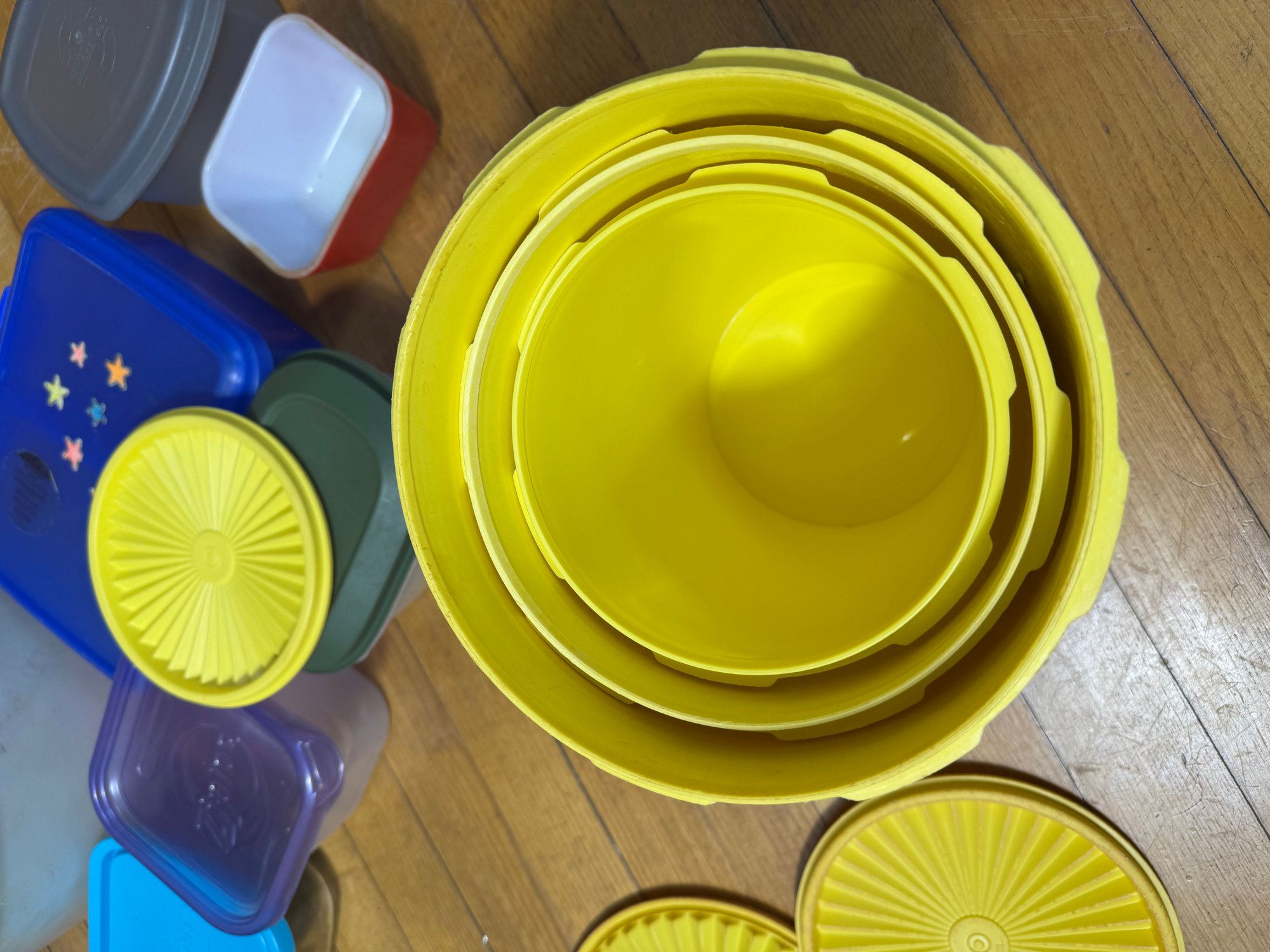 yellow tupperware is damaged, large tupperware storage has a hard time closing