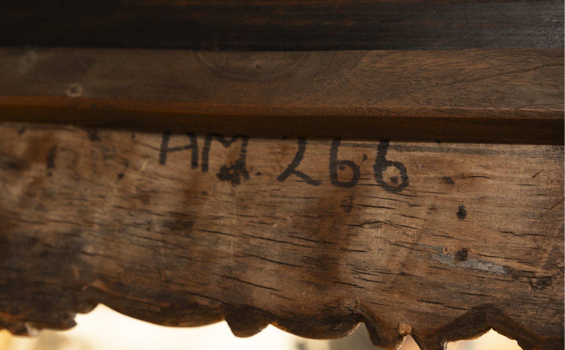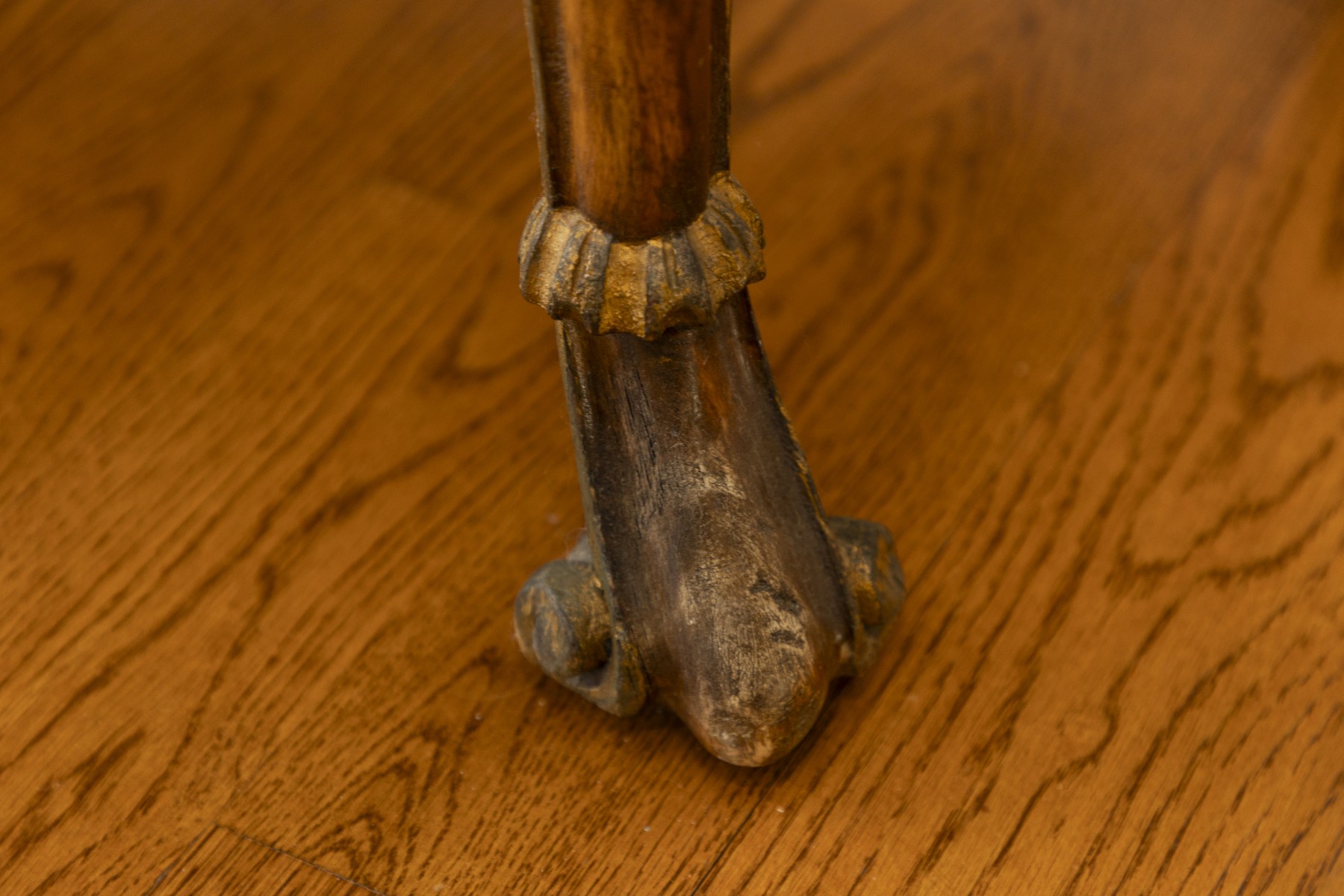 Surface wear to the top including scratches and areas of finish loss consistent with age and use. Carved base shows general wear with minor scuffs. Structurally stable and presents well.