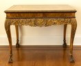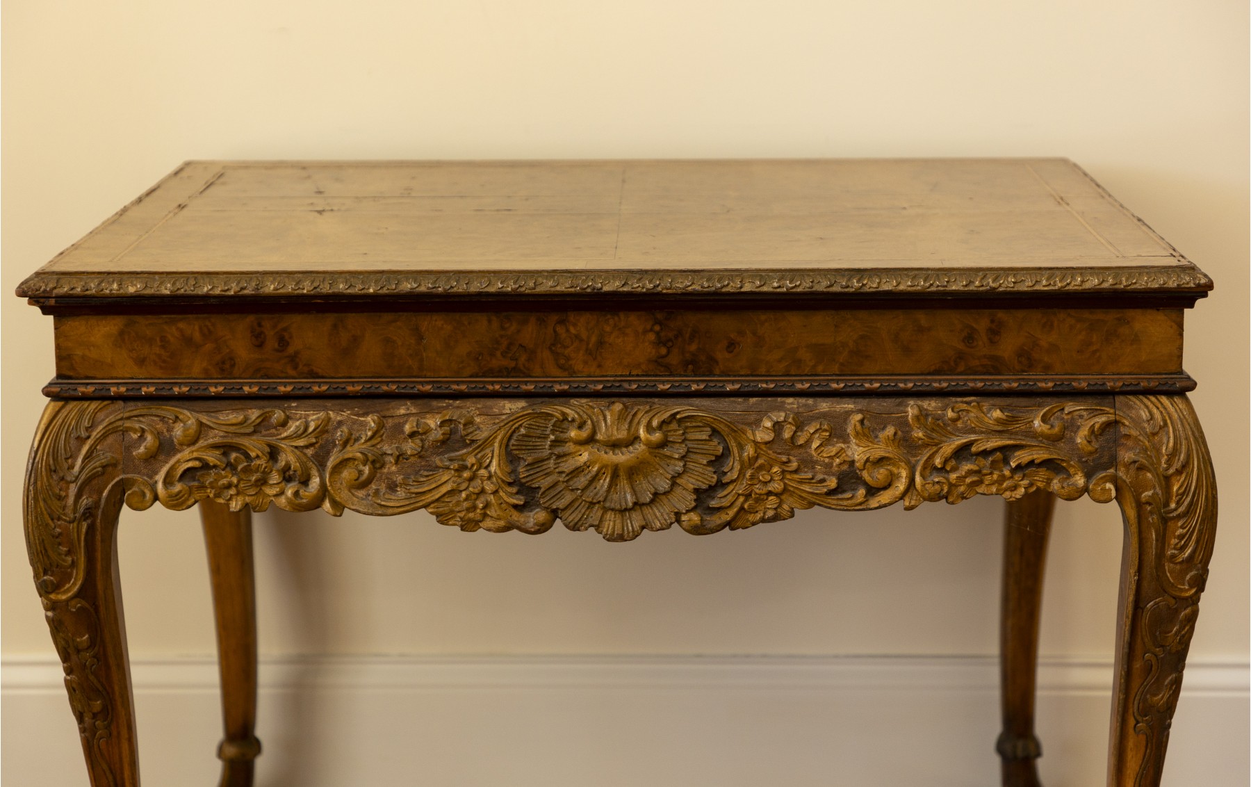 Rectangular table in the Louis XV style, featuring a shaped top above a richly carved apron with scrolling acanthus and shell motifs. The table is raised on cabriole legs with carved detailing terminating in scroll feet. The top appears to be veneered, likely walnut burl, complementing the solid carved base. The overall design reflects Rococo influence typical of 18th century French furniture.