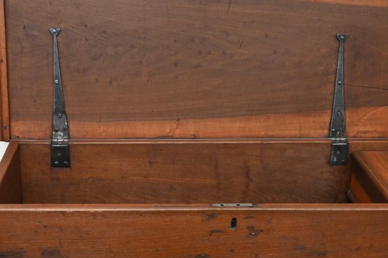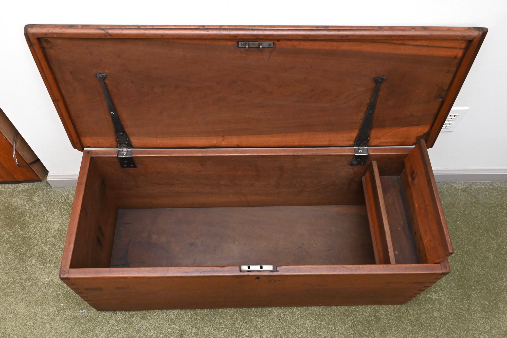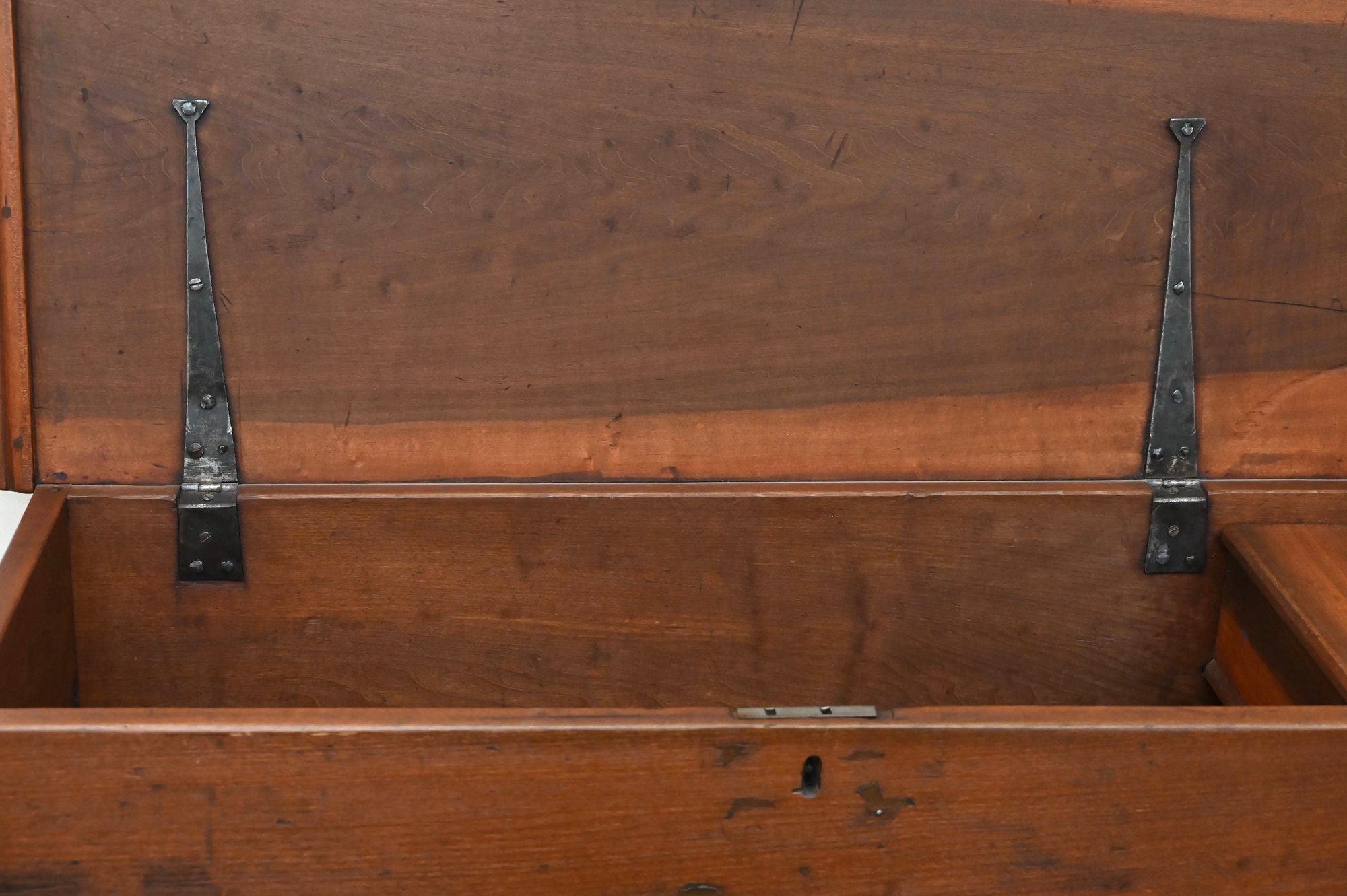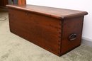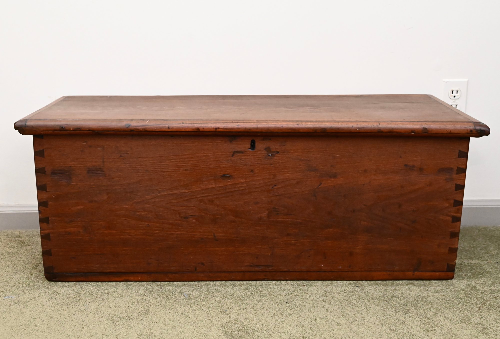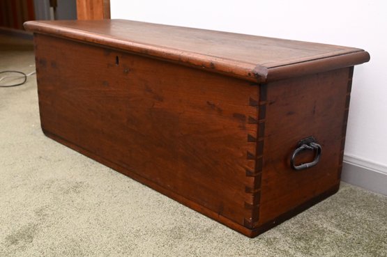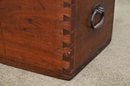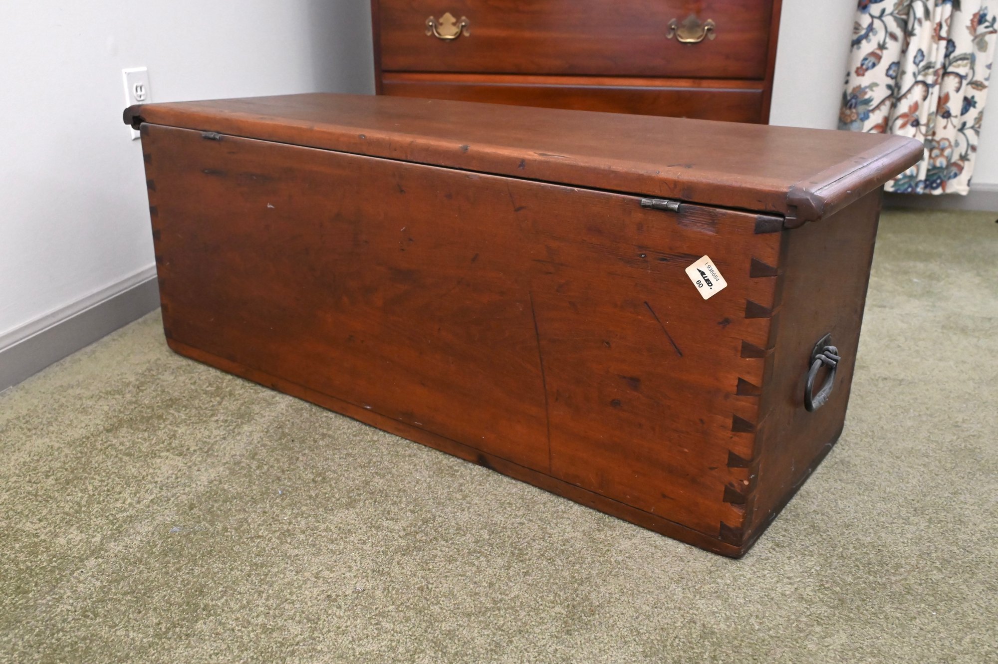 Antique American blanket chest crafted in pine, dating to the 19th century. Rectangular form with a hinged lift-top lid, dovetail joinery visible at the case corners, and a warm, aged finish. Features iron side carry handles and a simple, utilitarian design typical of the period. Interior includes a small lidded compartment for storage of smaller items.