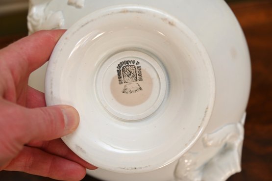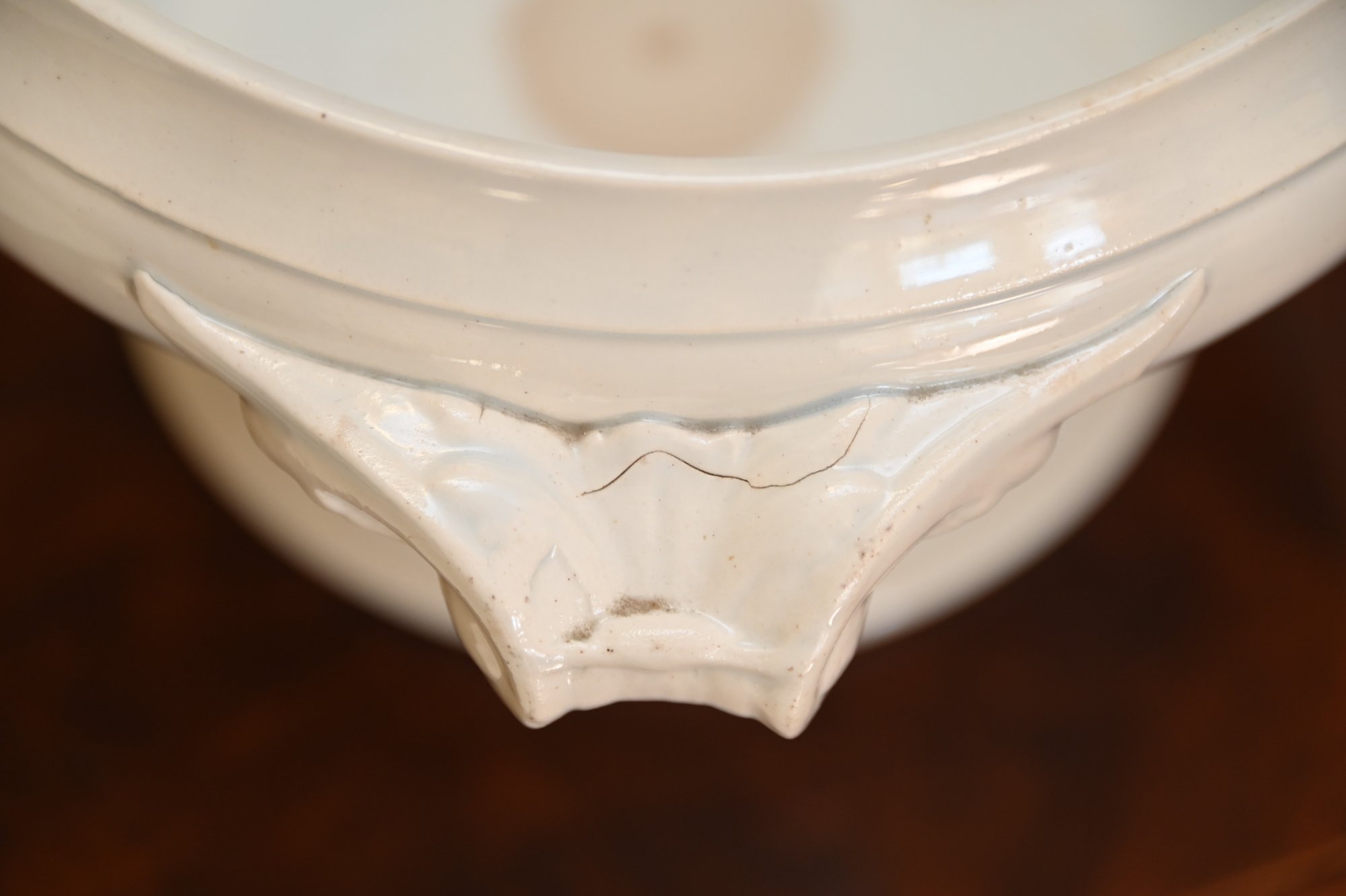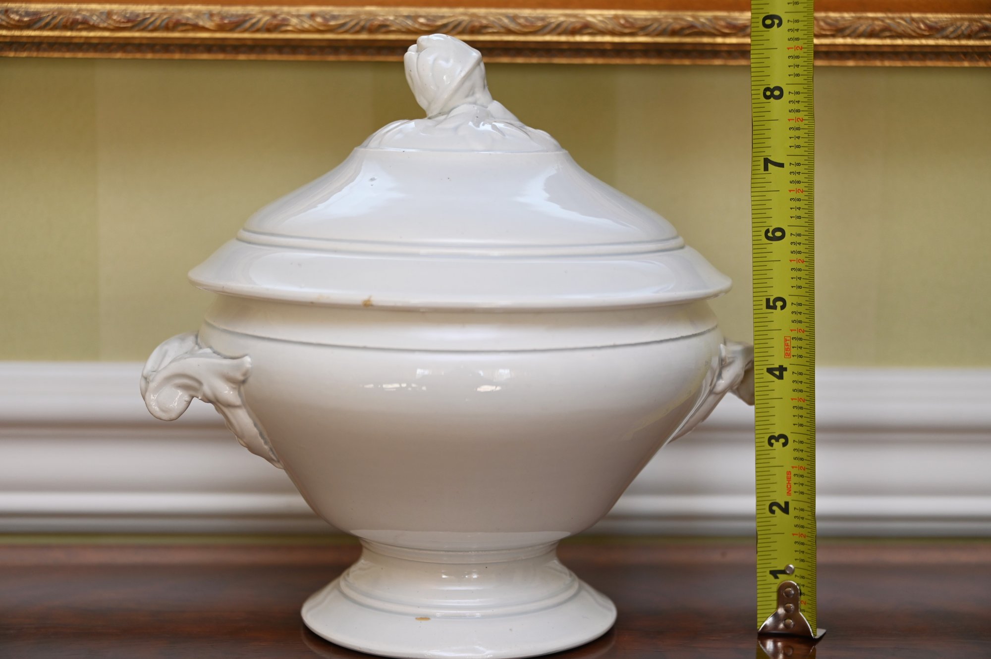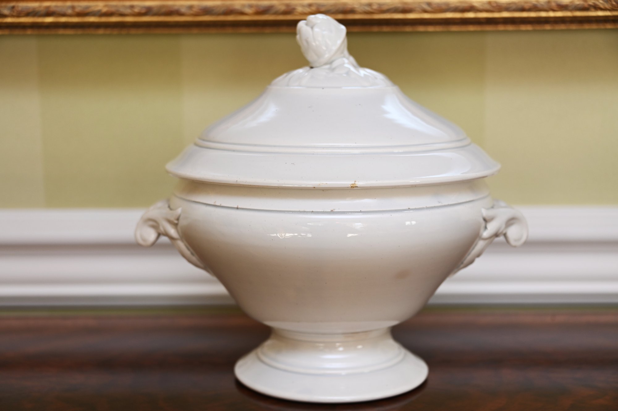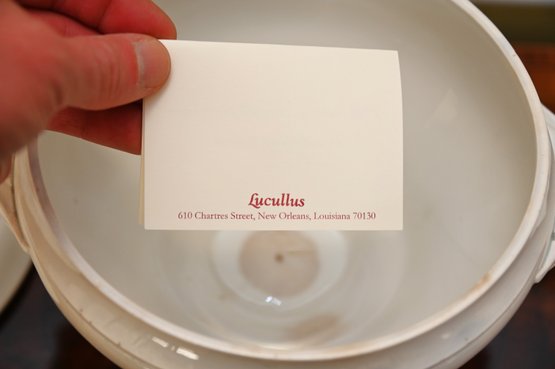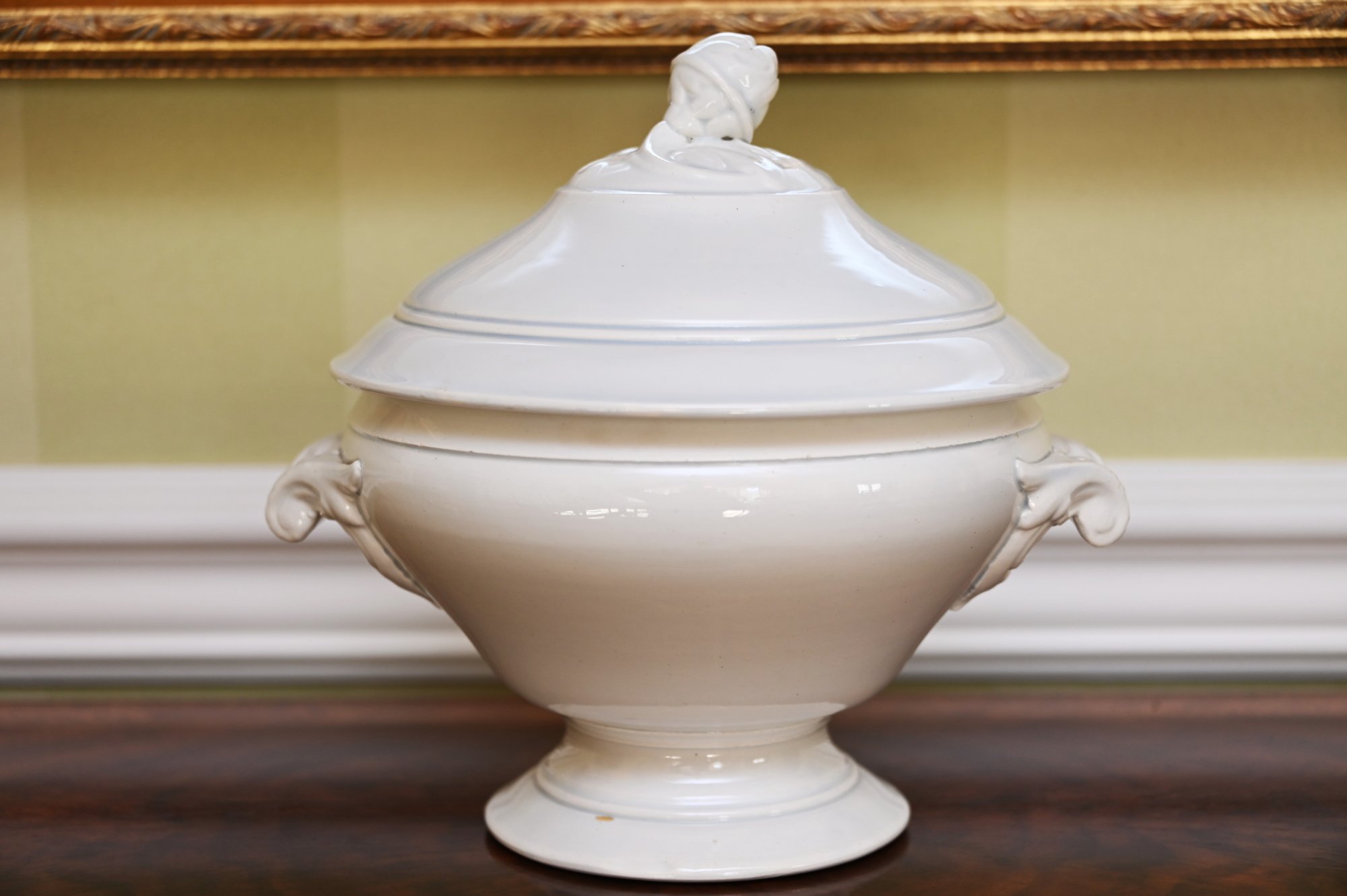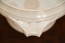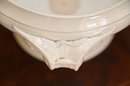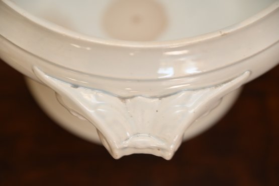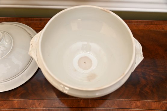 This 19th-century French porcelain soup tureen is a fine example of classic European tableware. Made from white porcelain, it features a gracefully curved, rounded body that sits atop a pedestal base, giving it a stately and elegant presence. The tureen has a domed lid with a sculpted handle, likely inspired by natural motifs such as foliage or fruit, which was a common design element in 19th-century French ceramics. Ornate, scrolling handles on either side add to its decorative appeal while also serving a functional purpose.