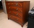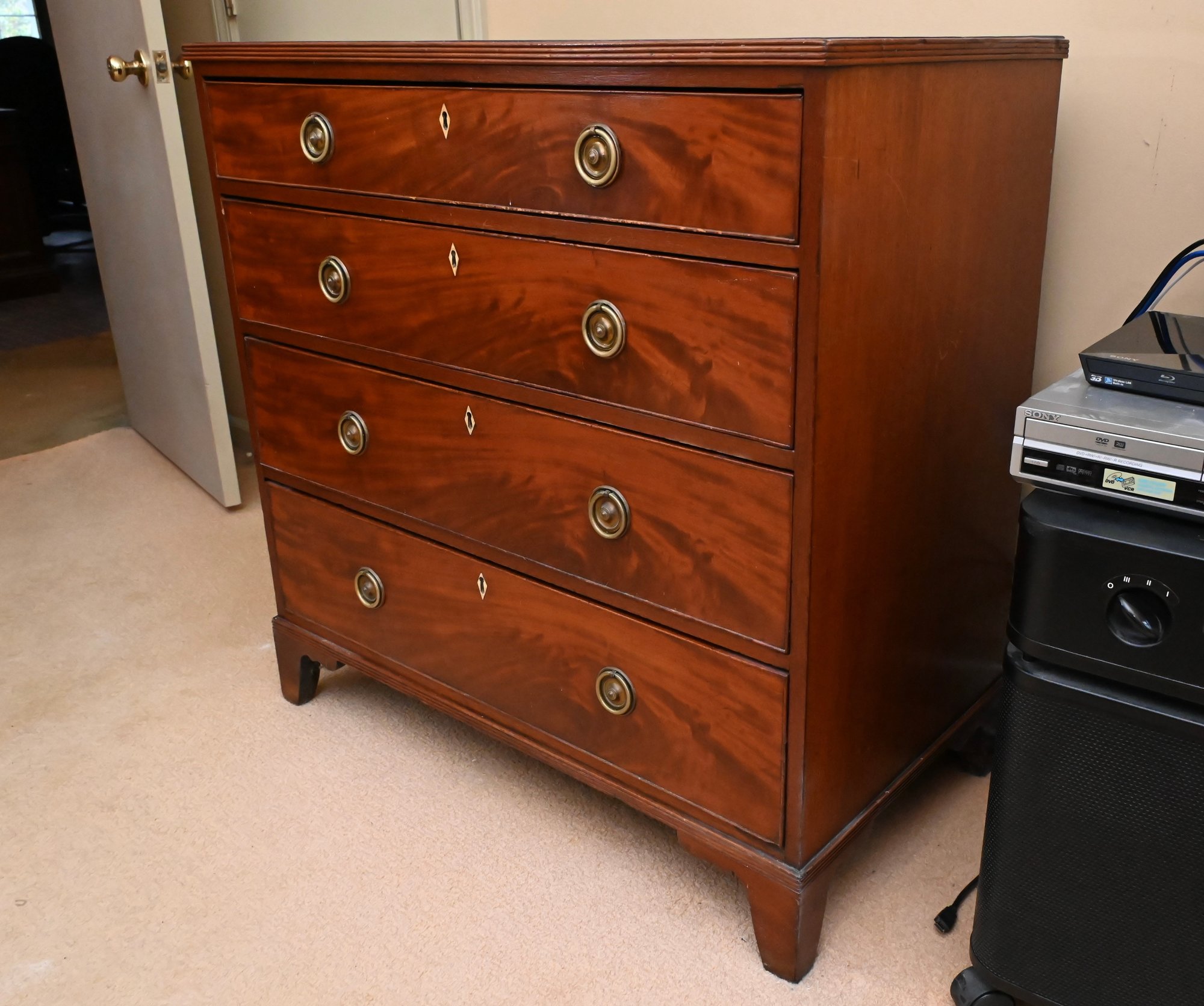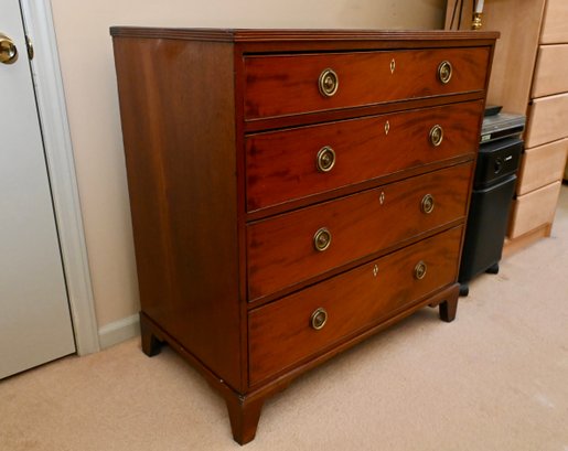 George III style mahogany chest featuring four graduated drawers with richly figured grain across the fronts, set within a clean, rectangular case with molded edges and bracket-style feet. Each drawer is fitted with matching round brass pulls and centered escutcheons, reflecting the symmetry and restrained detailing associated with the period.
