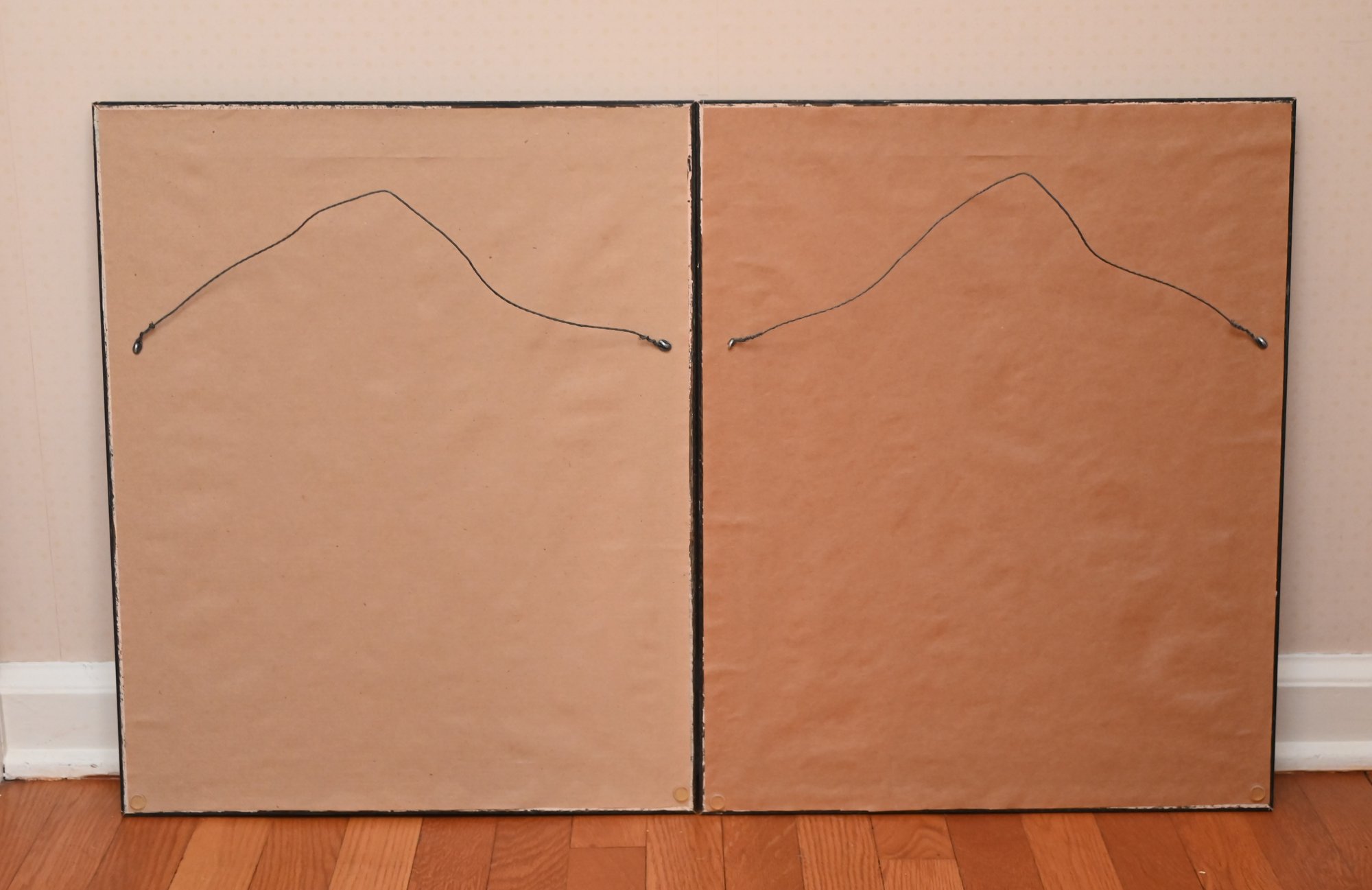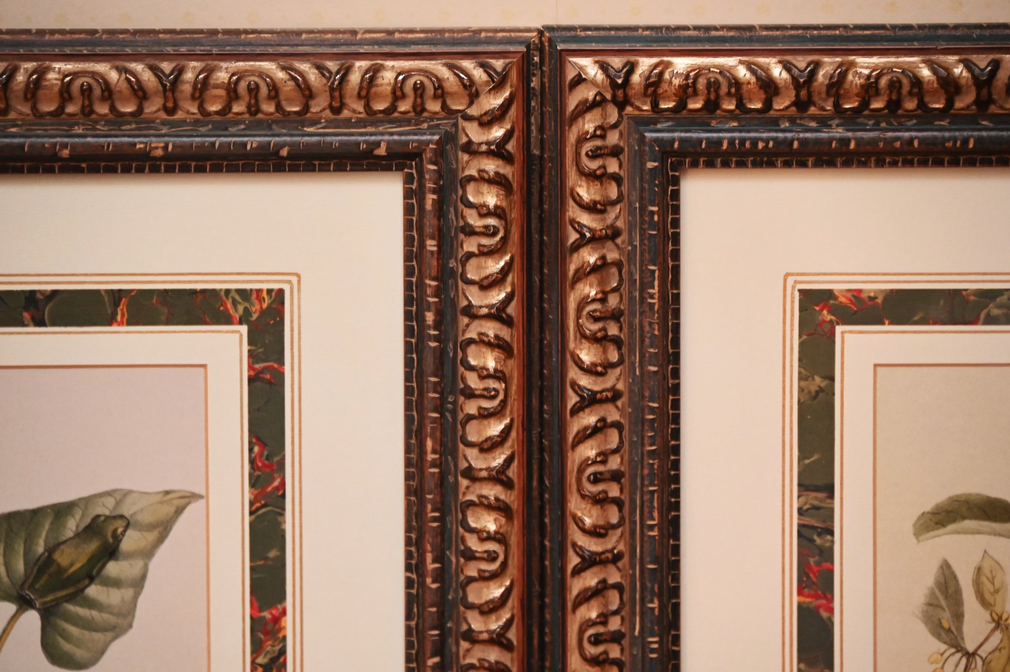 Each print is set within a double-matted border, with an outer mat featuring a subtle botanical pattern that complements the subject matter. The frames are ornate, with a dark antique gold finish and intricate scrolling designs, adding a sophisticated and traditional touch.