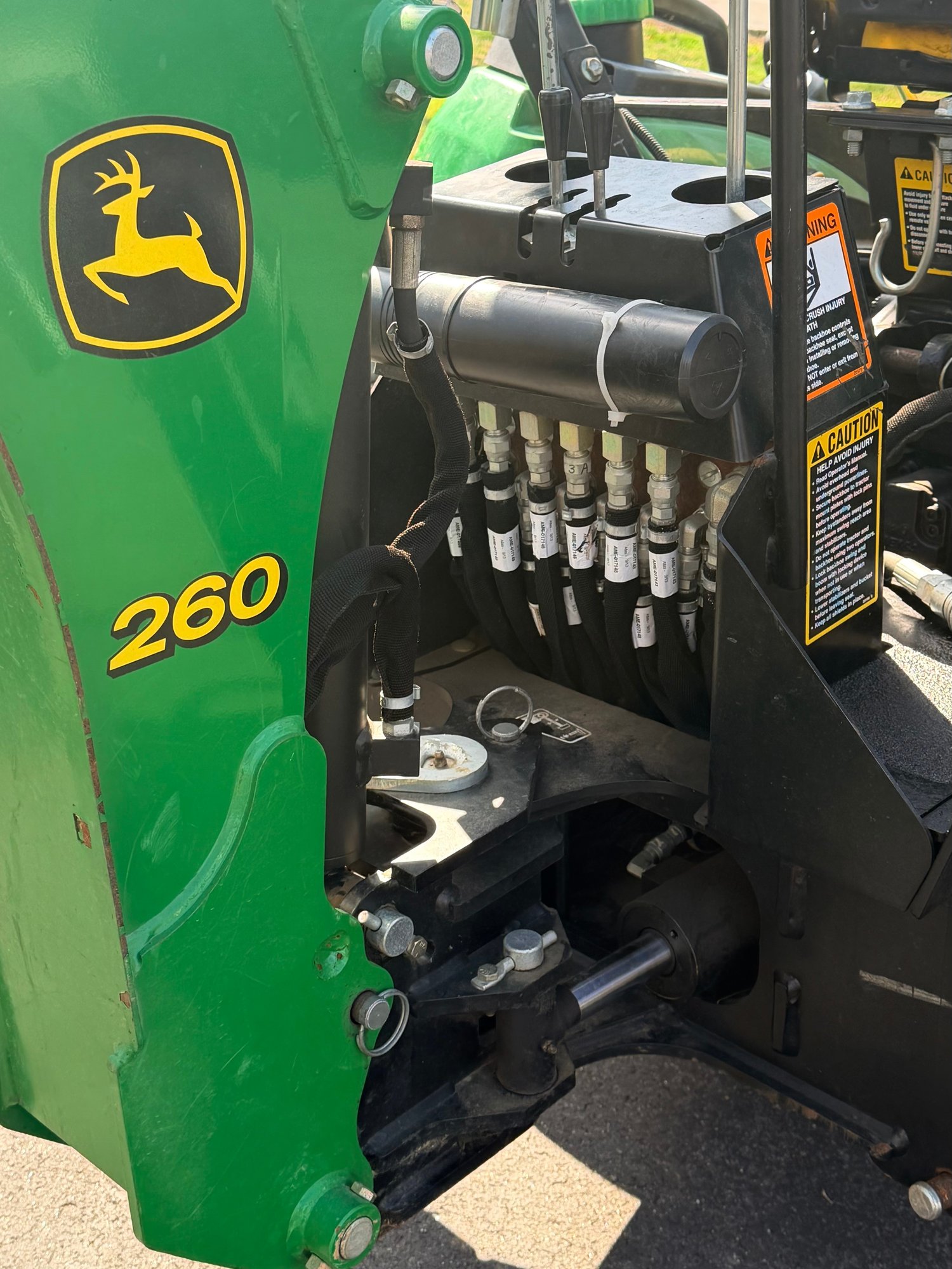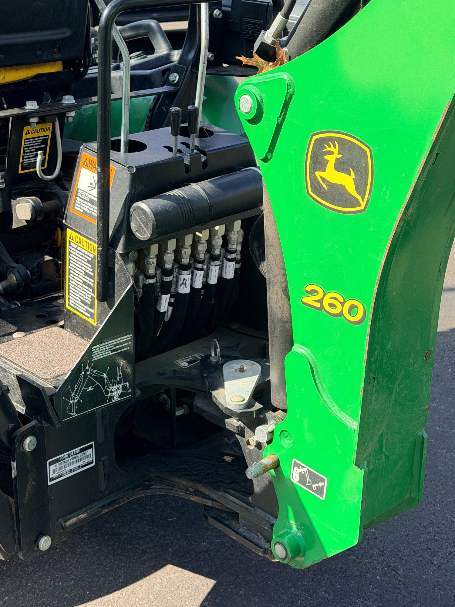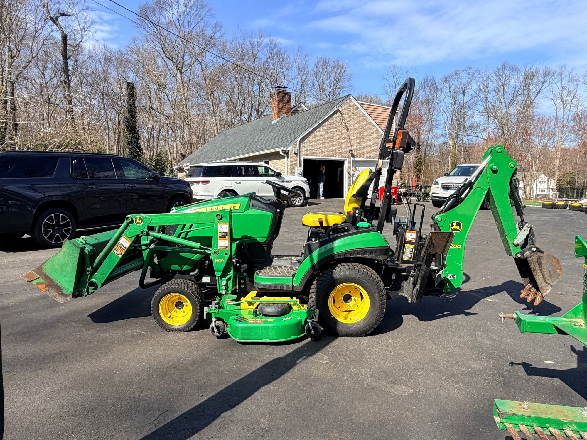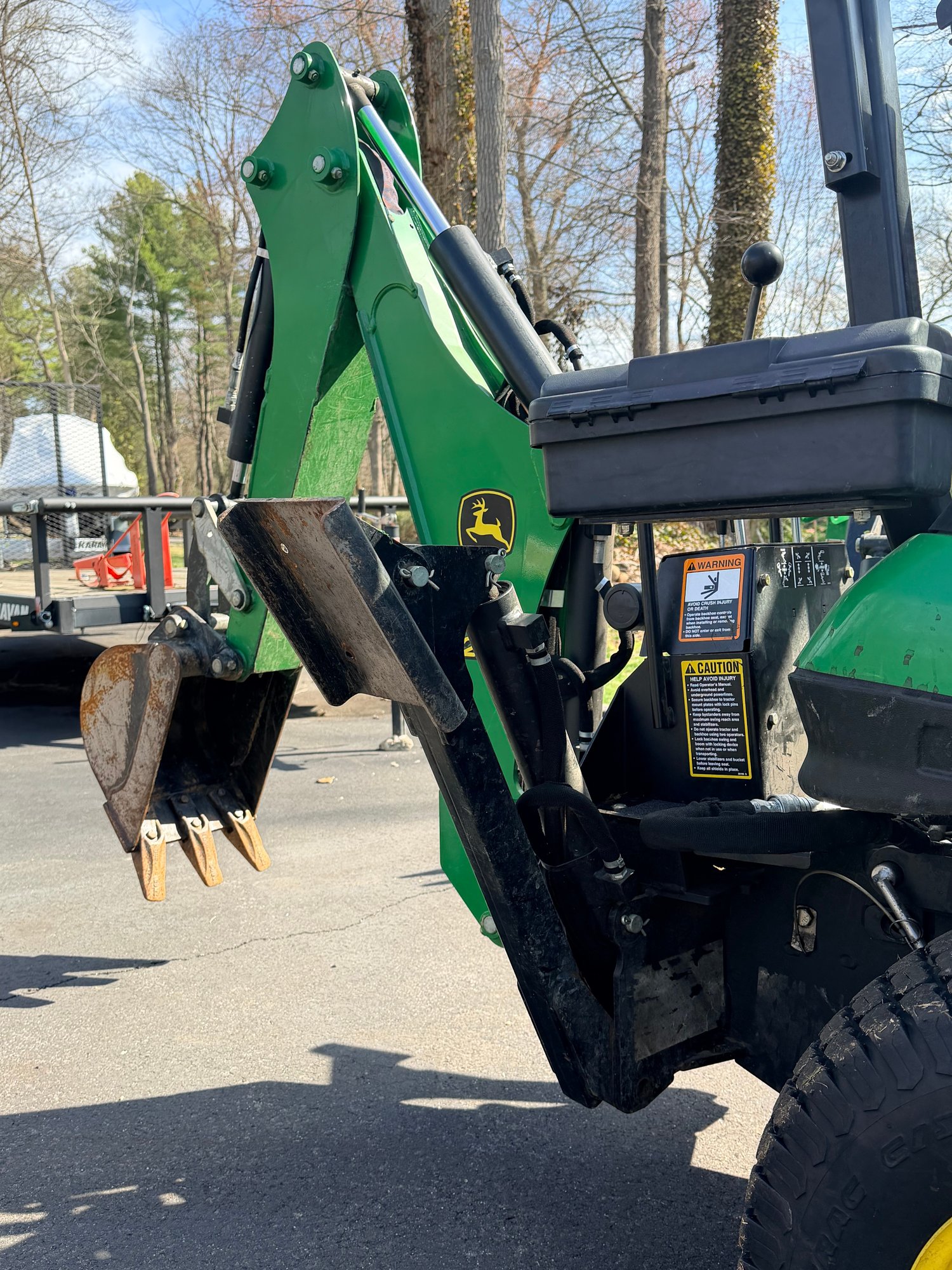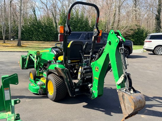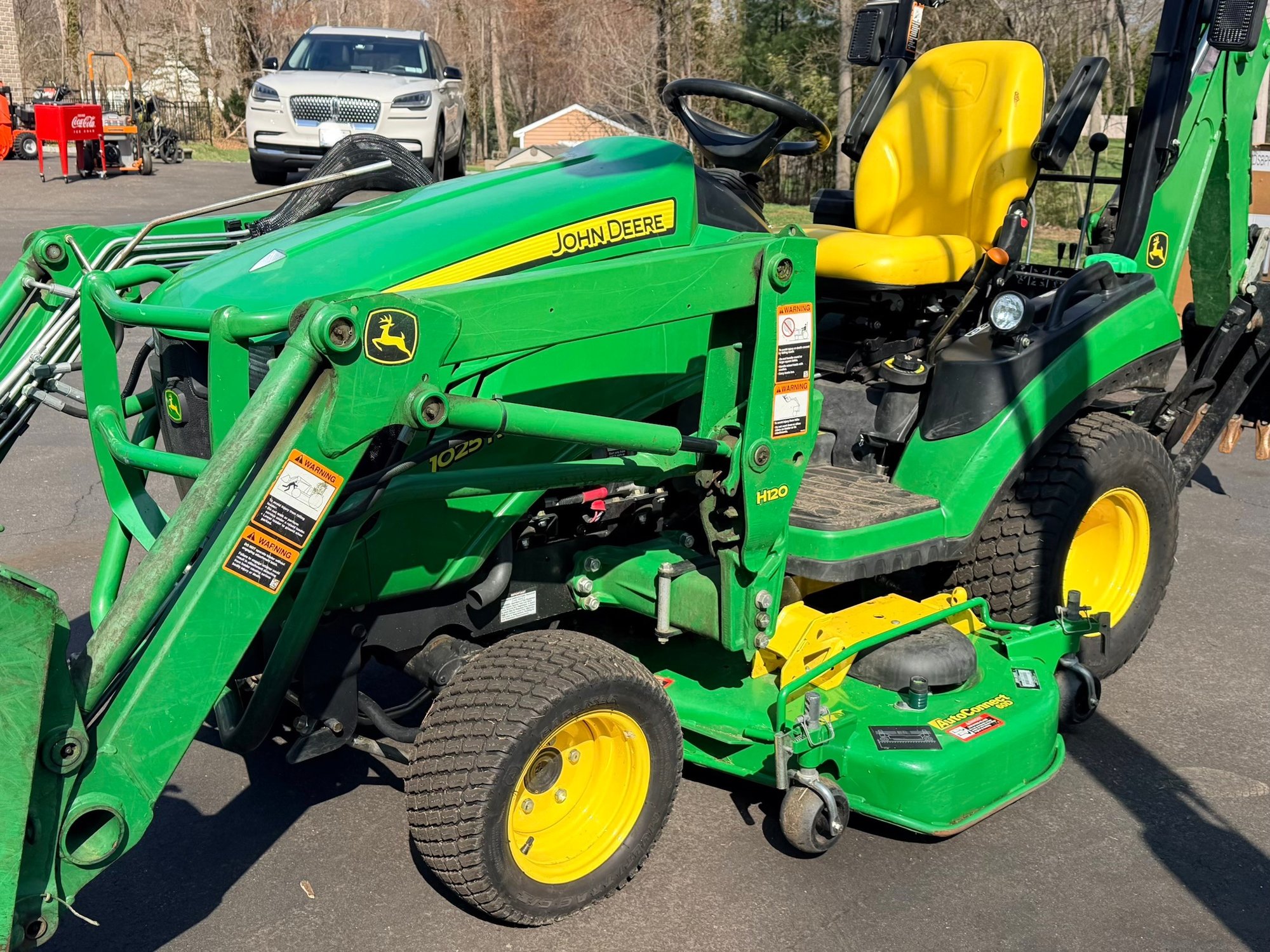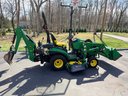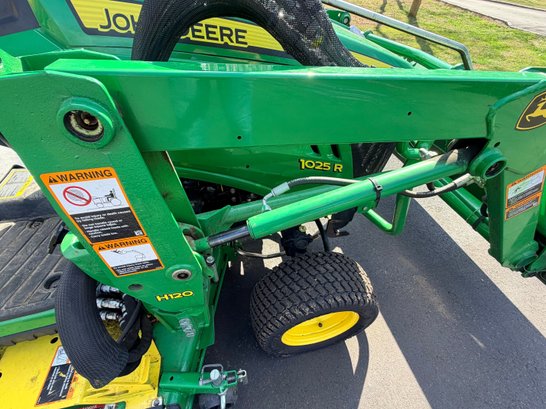 506 Hours. John Deere 1025R compact utility tractor equipped with an H120 front loader and 260 backhoe attachment. Features hydrostatic transmission, rollover protection bar, and mid-mount mower deck. Includes multiple attachments: rake, grading blade, lawn sweeper, plug aerator, spike aerator, along with an additional set of tires and rims. Suitable for landscaping, property maintenance, and light construction applications.