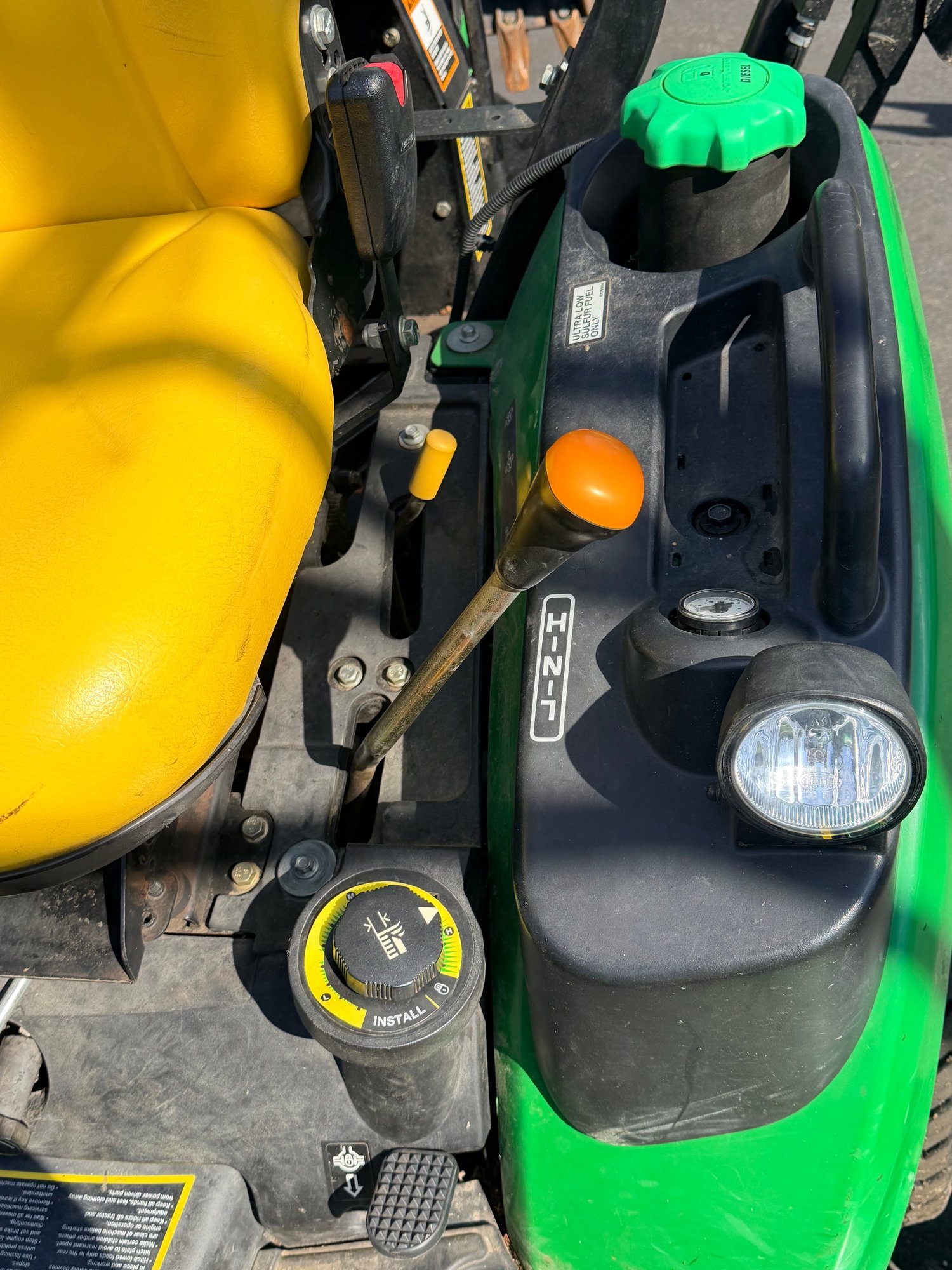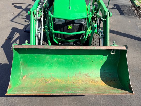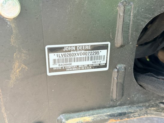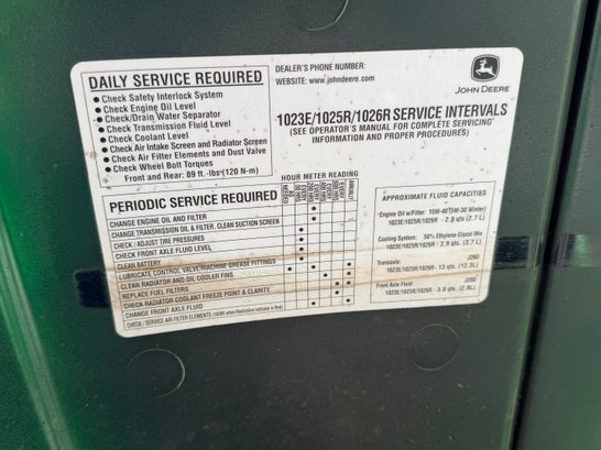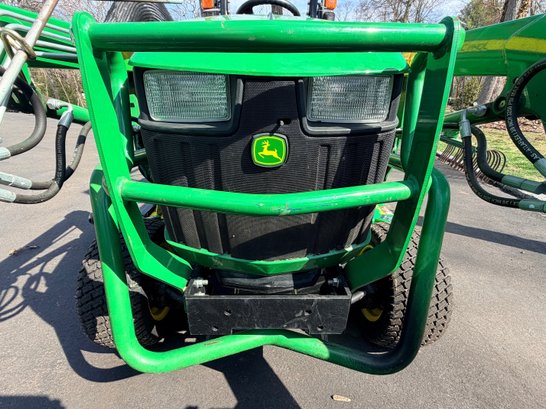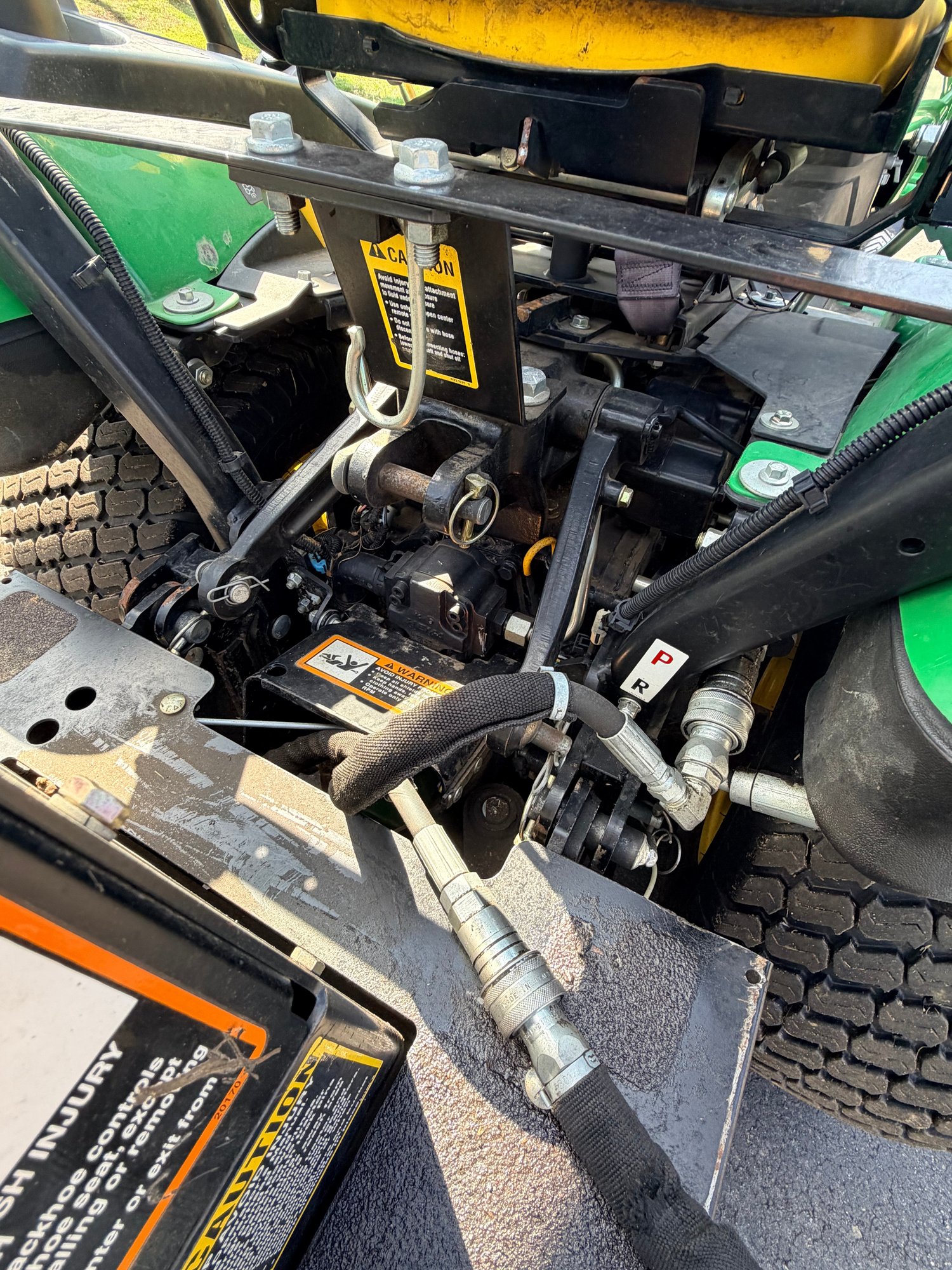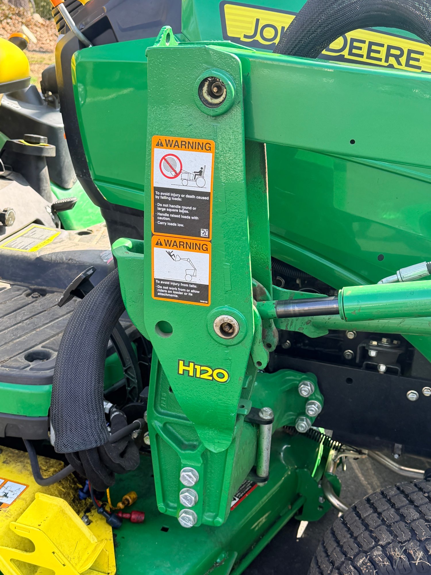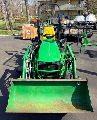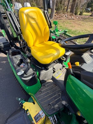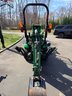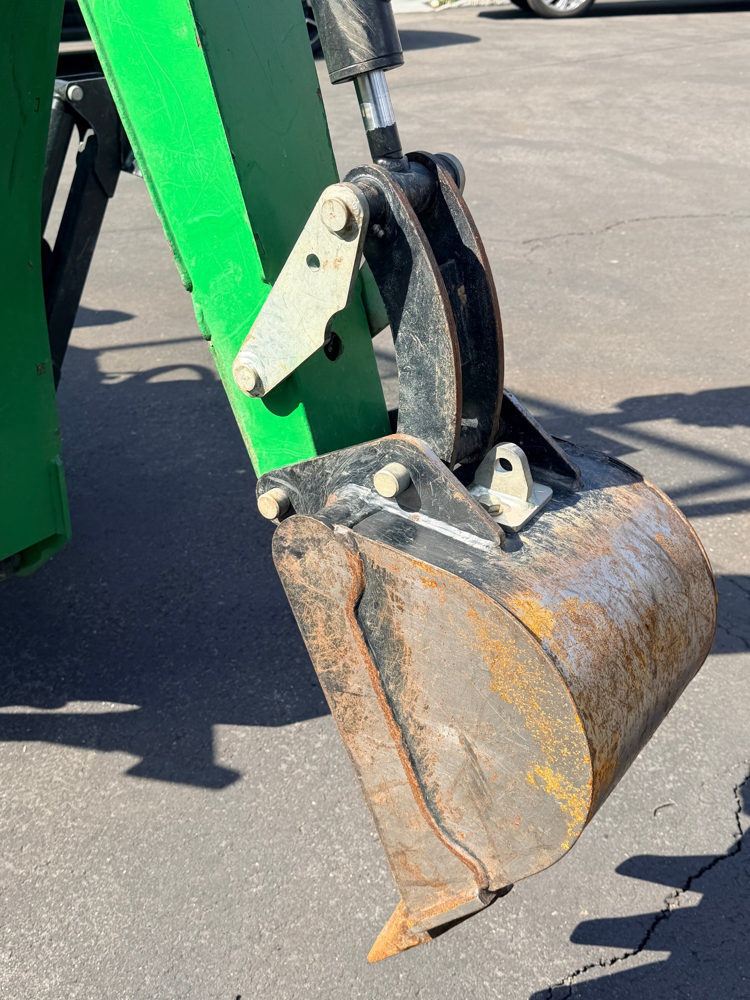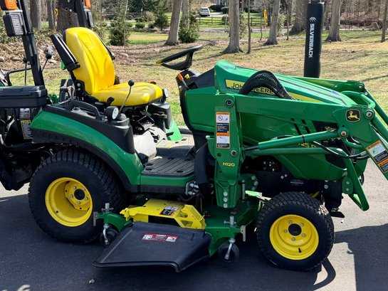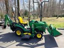 506 Hours. John Deere 1025R compact utility tractor equipped with an H120 front loader and 260 backhoe attachment. Features hydrostatic transmission, rollover protection bar, and mid-mount mower deck. Includes multiple attachments: rake, grading blade, lawn sweeper, plug aerator, spike aerator, along with an additional set of tires and rims. Suitable for landscaping, property maintenance, and light construction applications.