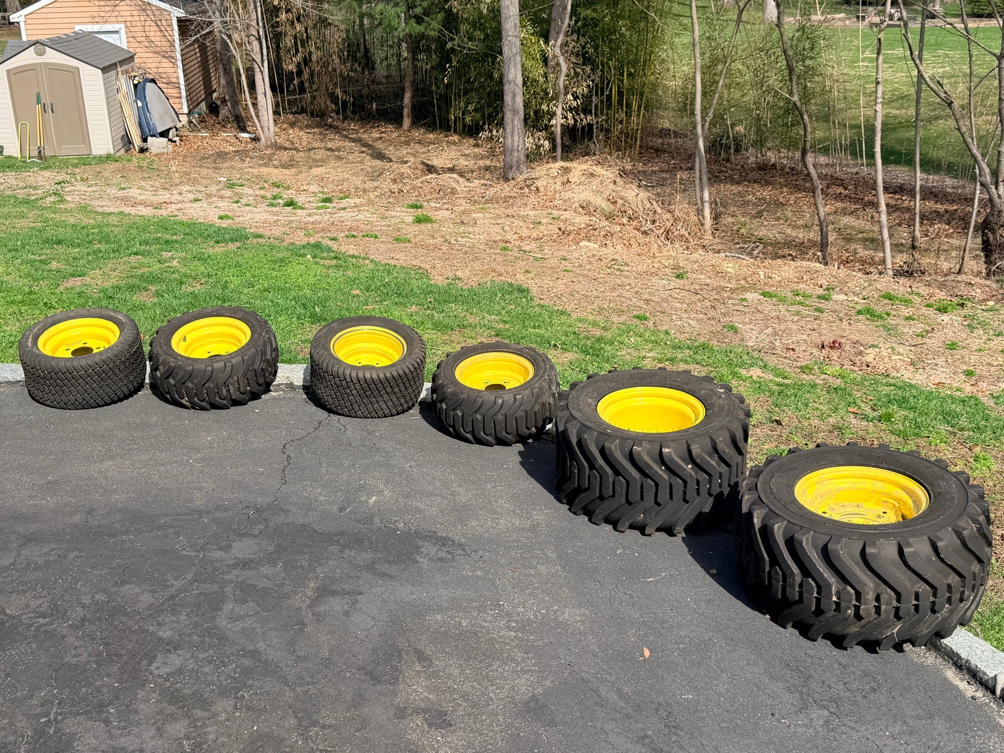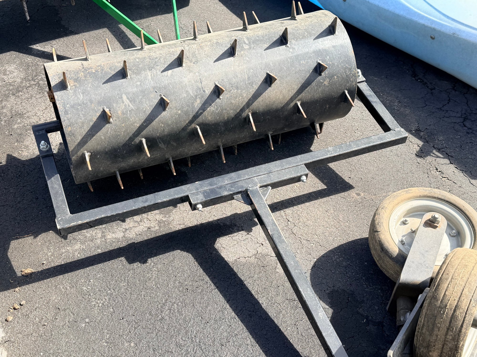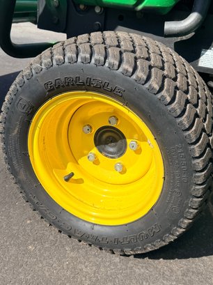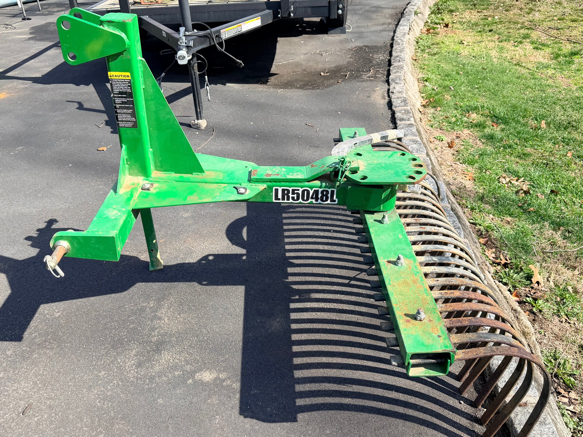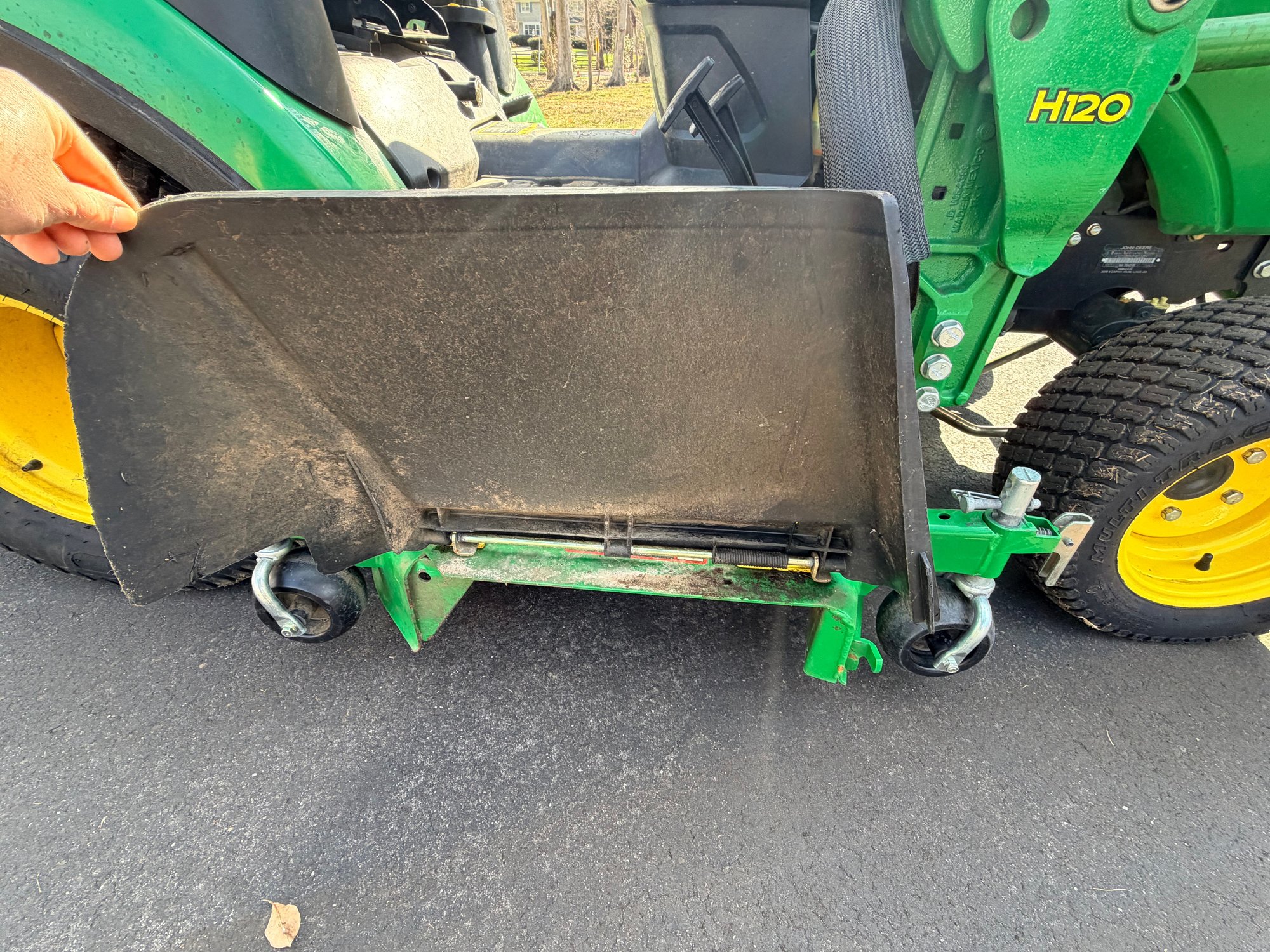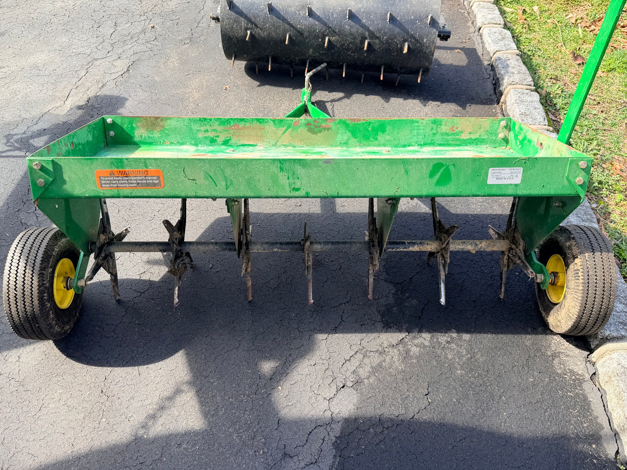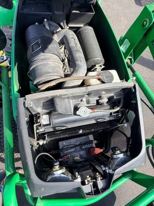 506 Hours. John Deere 1025R compact utility tractor equipped with an H120 front loader and 260 backhoe attachment. Features hydrostatic transmission, rollover protection bar, and mid-mount mower deck. Includes multiple attachments: rake, grading blade, lawn sweeper, plug aerator, spike aerator, along with an additional set of tires and rims. Suitable for landscaping, property maintenance, and light construction applications.