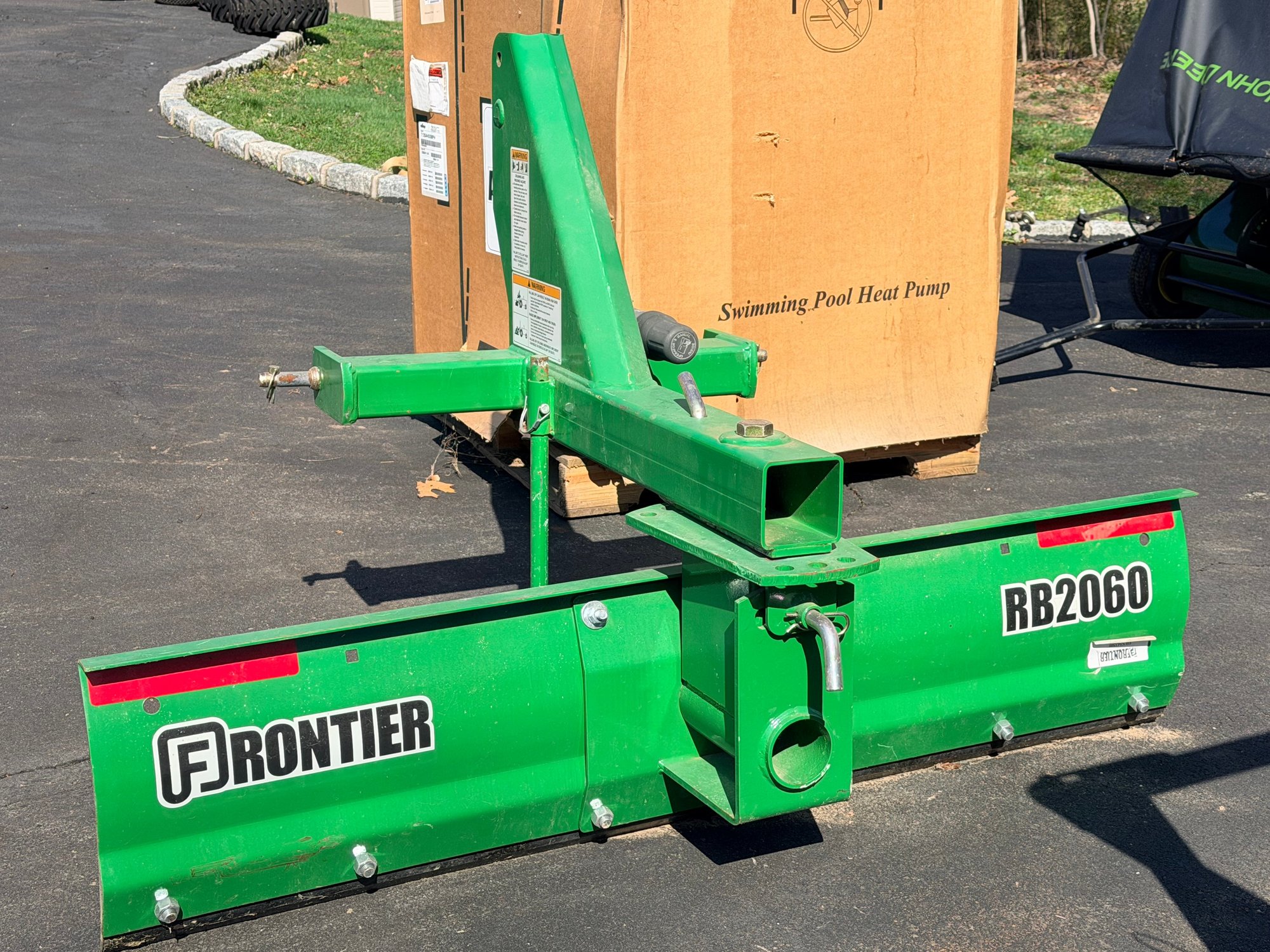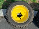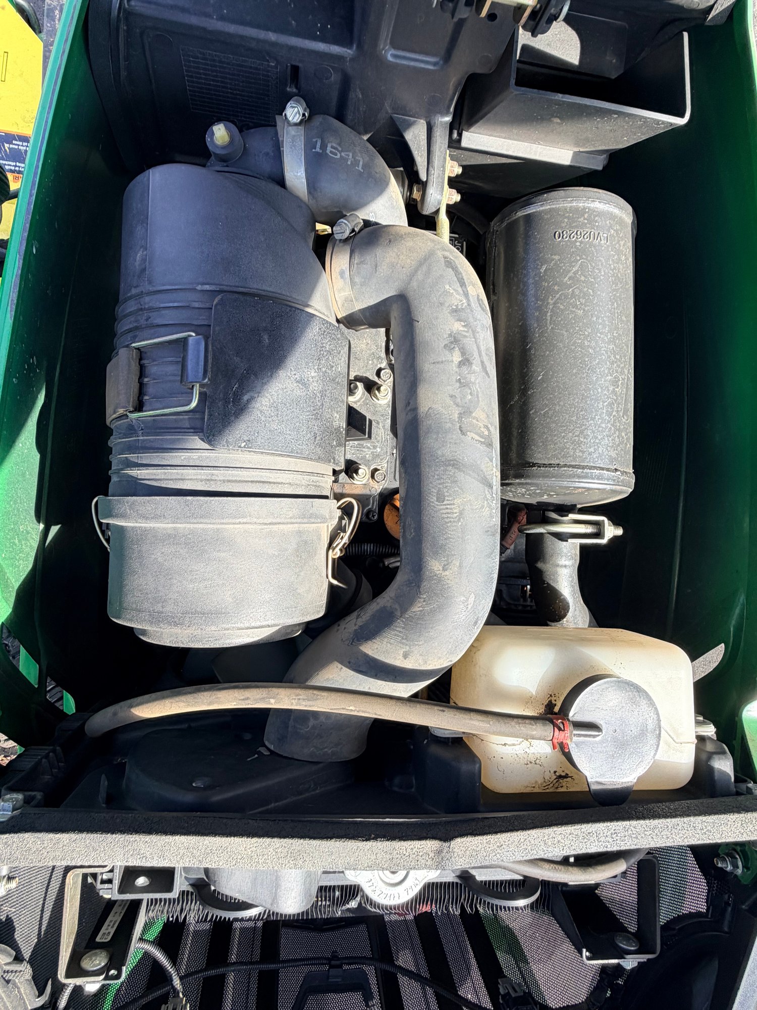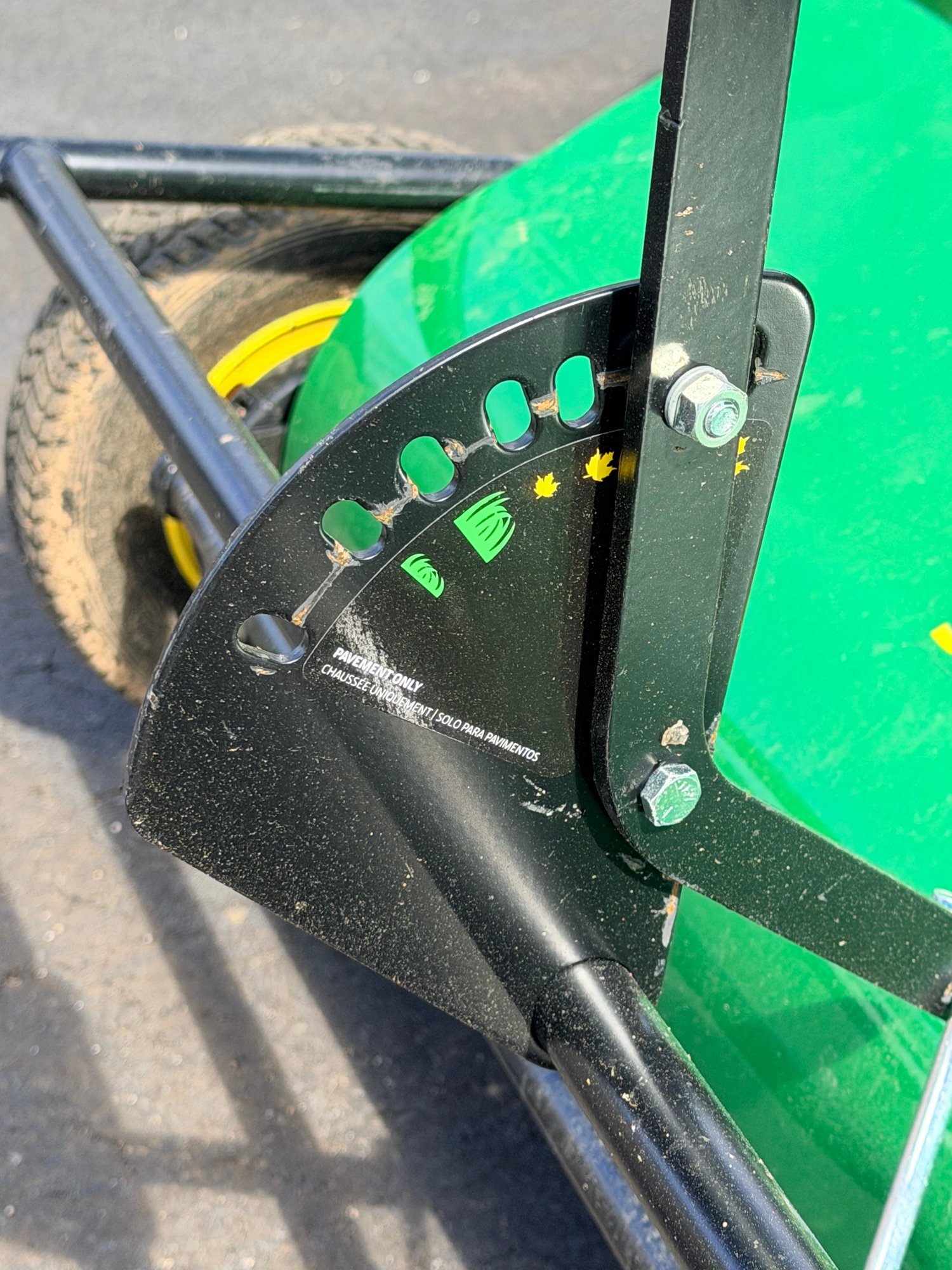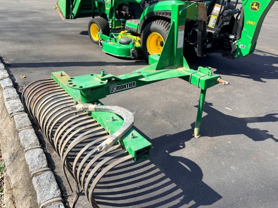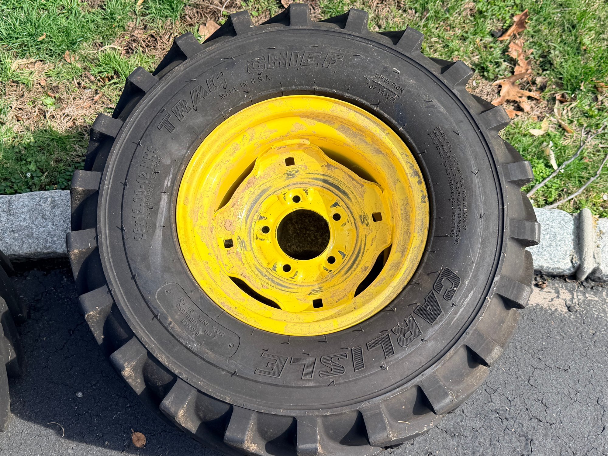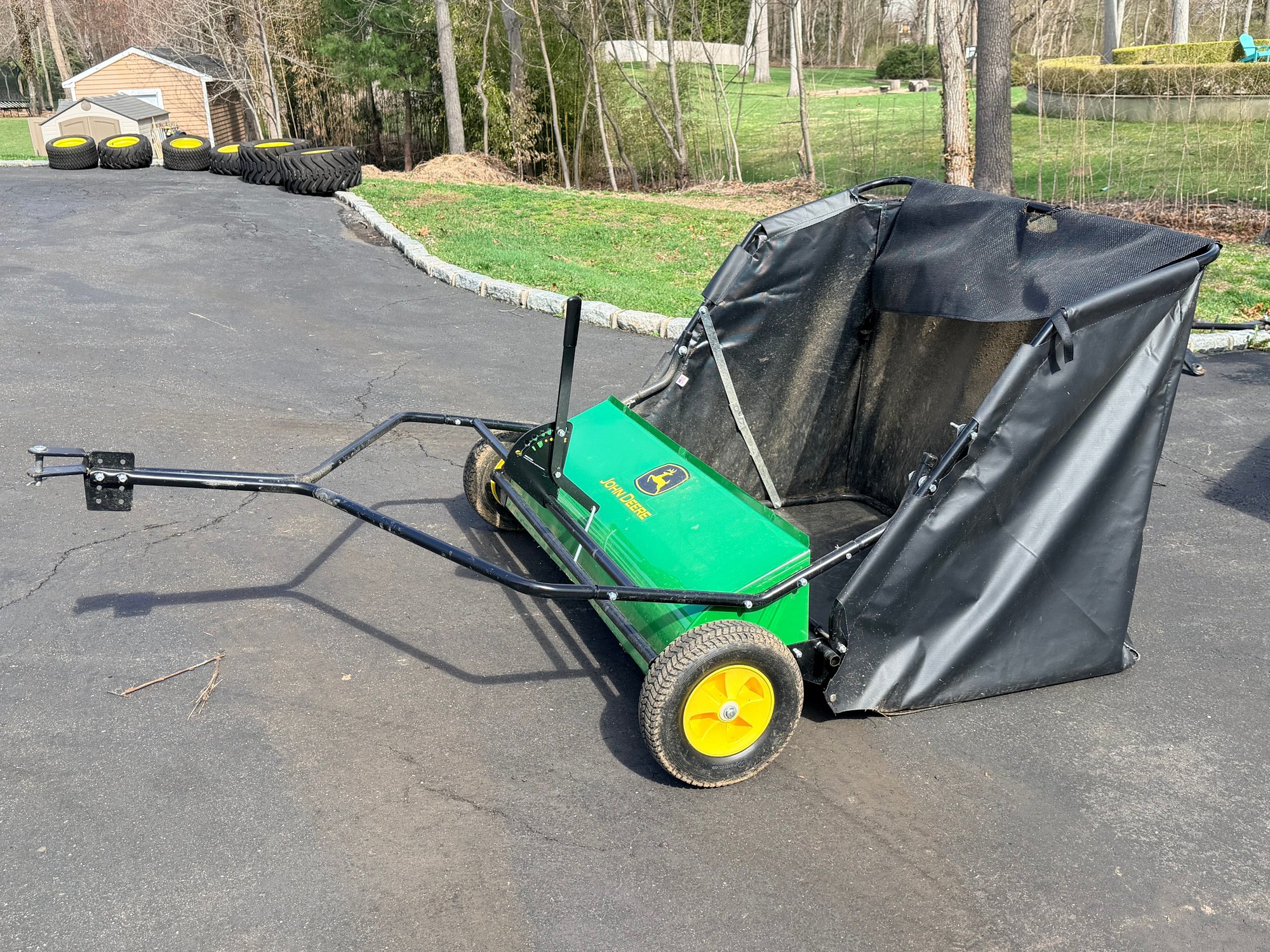 506 Hours. John Deere 1025R compact utility tractor equipped with an H120 front loader and 260 backhoe attachment. Features hydrostatic transmission, rollover protection bar, and mid-mount mower deck. Includes multiple attachments: rake, grading blade, lawn sweeper, plug aerator, spike aerator, along with an additional set of tires and rims. Suitable for landscaping, property maintenance, and light construction applications.