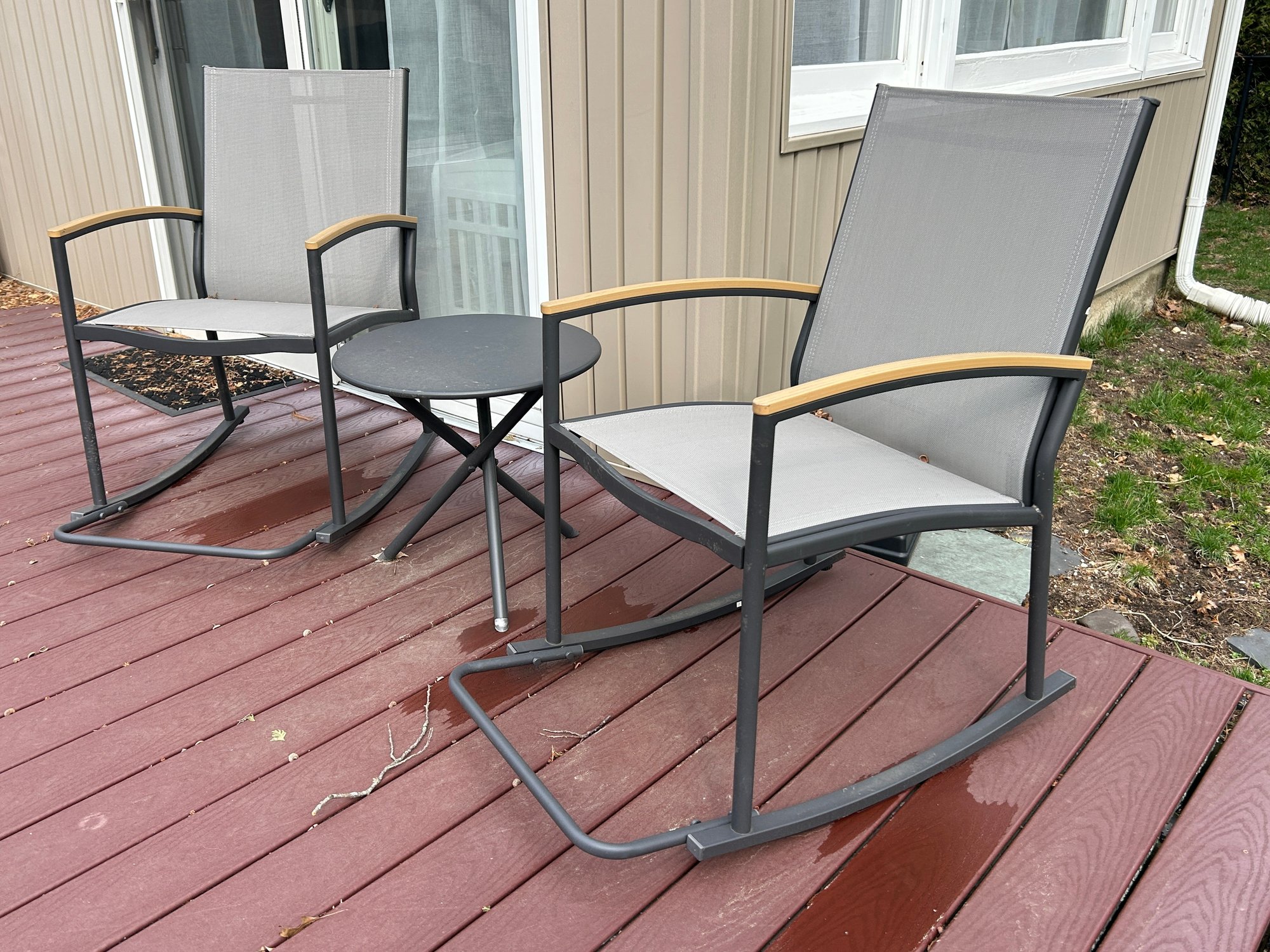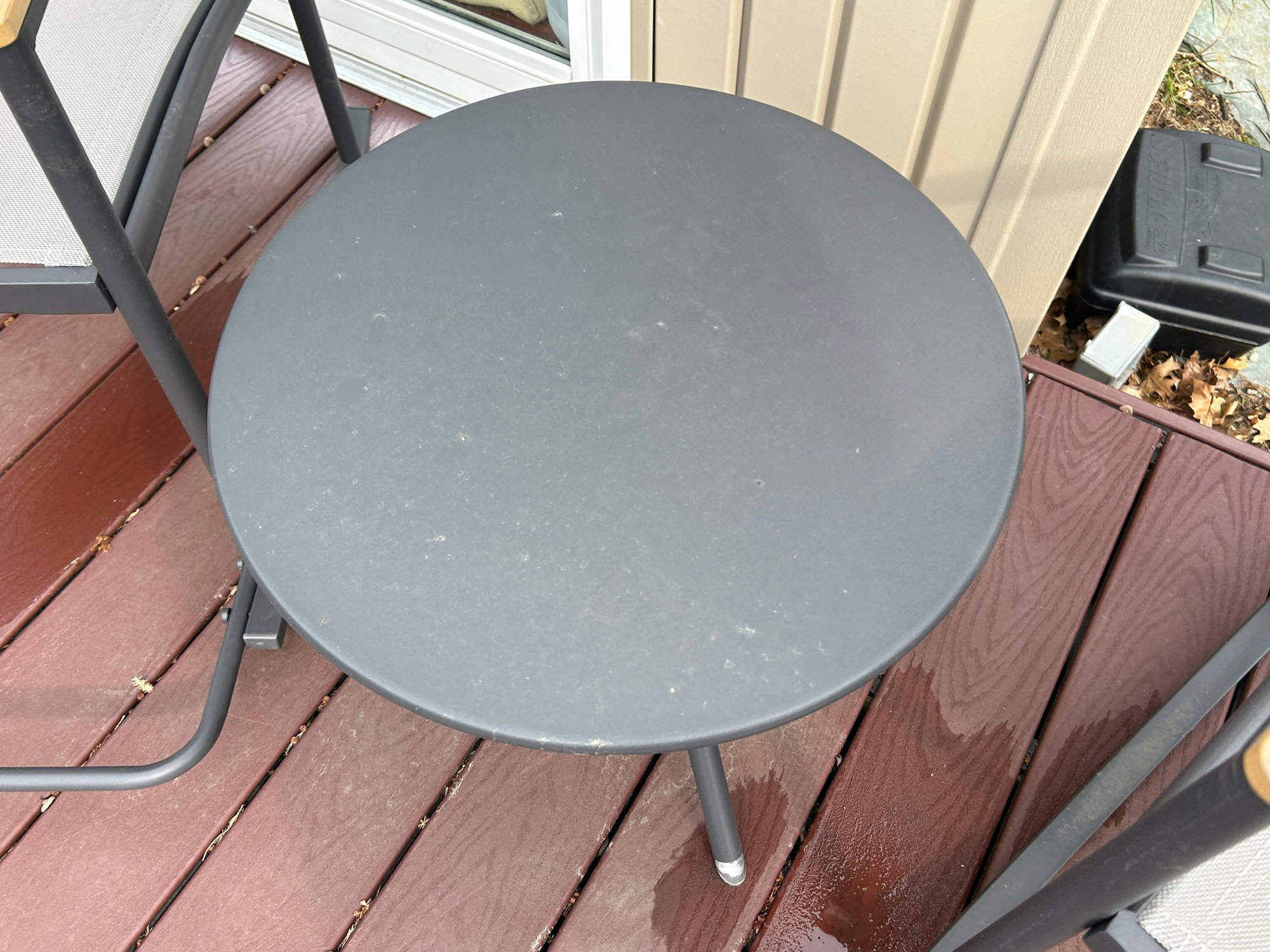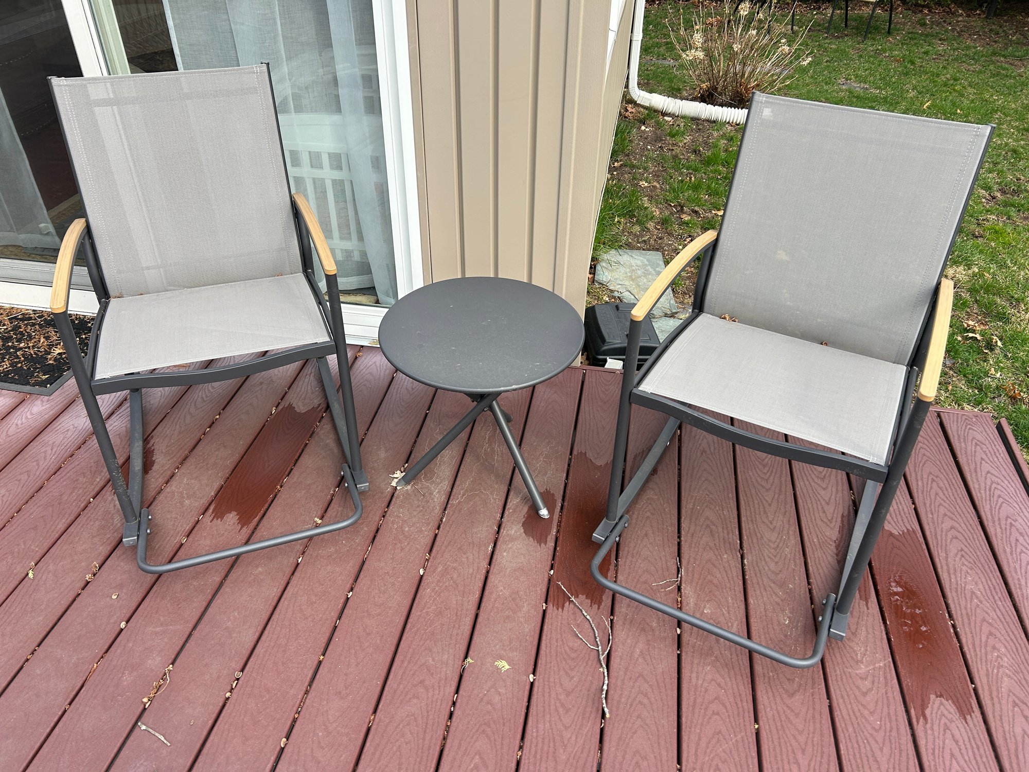 This three-piece outdoor bistro set includes two armchairs and a round side table. The chairs feature dark grey metal frames with light wood armrests and grey woven mesh sling seats and backs. The compact round side table is made of dark grey metal with a tripod base.