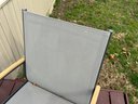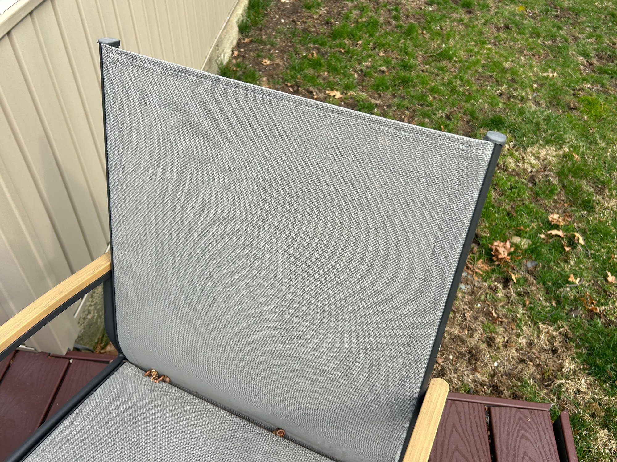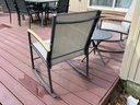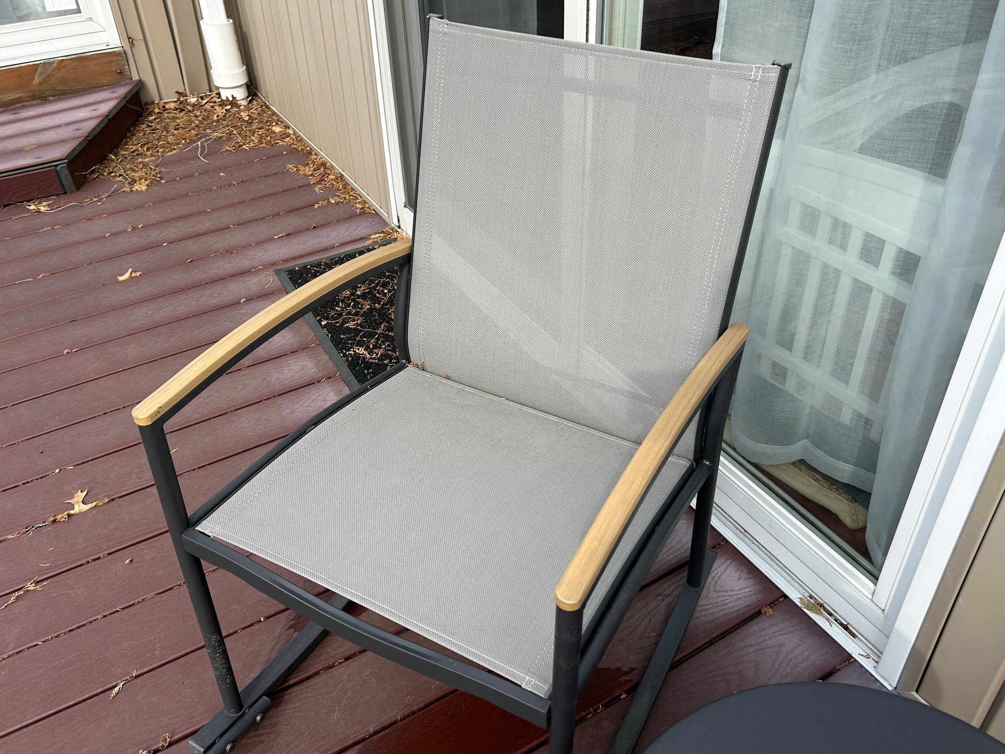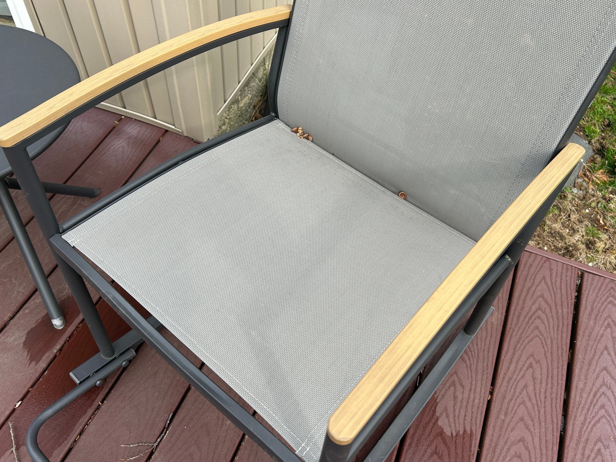 This three-piece outdoor bistro set includes two armchairs and a round side table. The chairs feature dark grey metal frames with light wood armrests and grey woven mesh sling seats and backs. The compact round side table is made of dark grey metal with a tripod base.