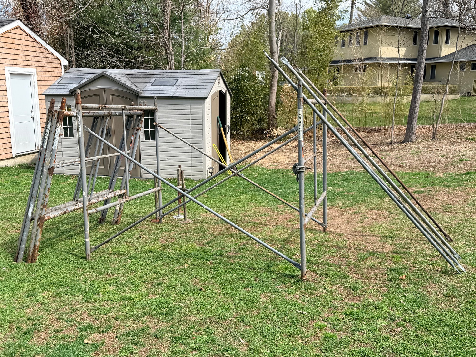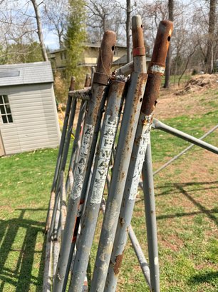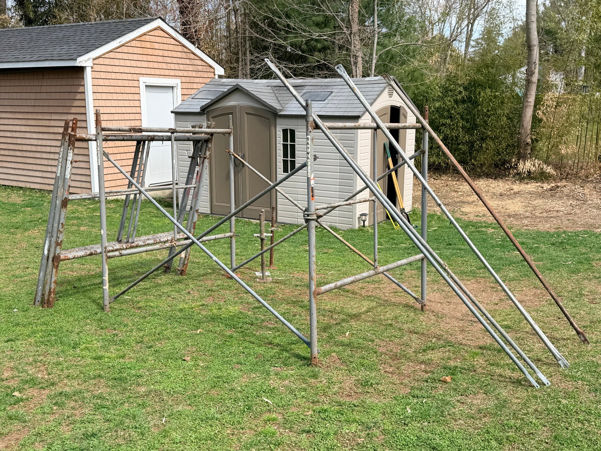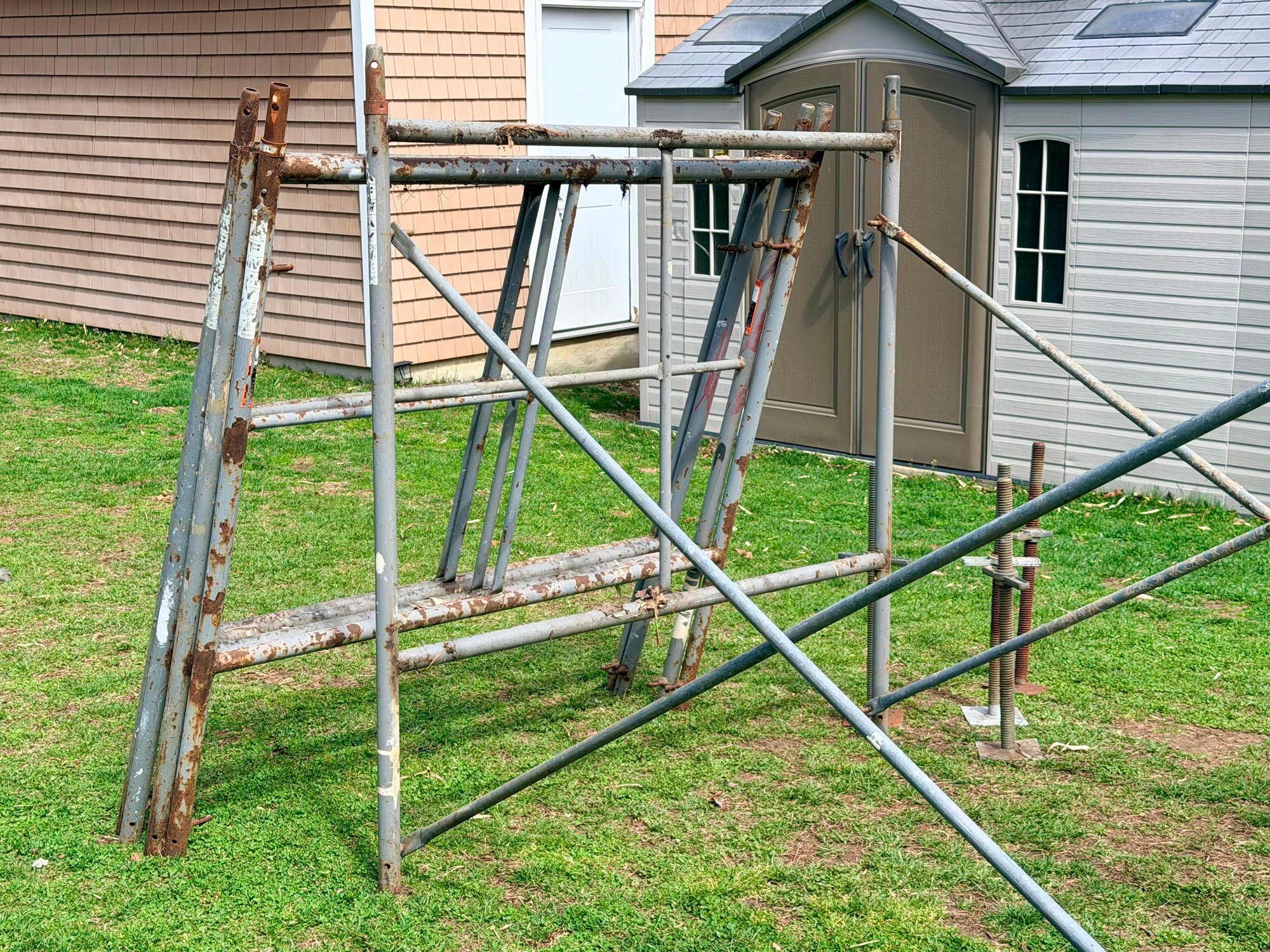 Set of three steel scaffolding sections including tubular frames, cross braces, and support poles, designed for construction or maintenance work, with a modular design that allows the sections to be assembled into a stable elevated work platform, suitable for exterior or interior projects.