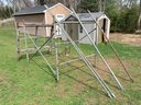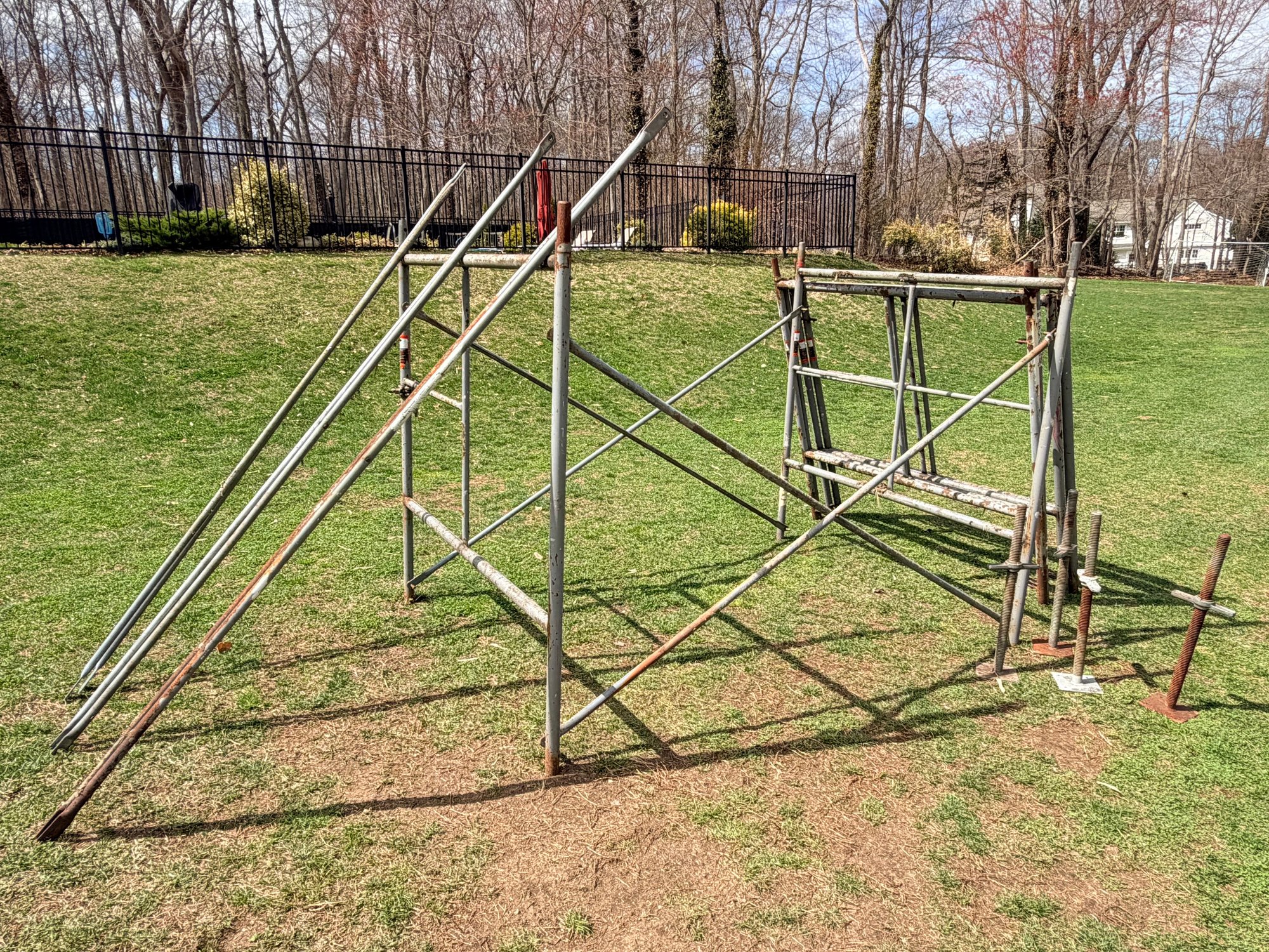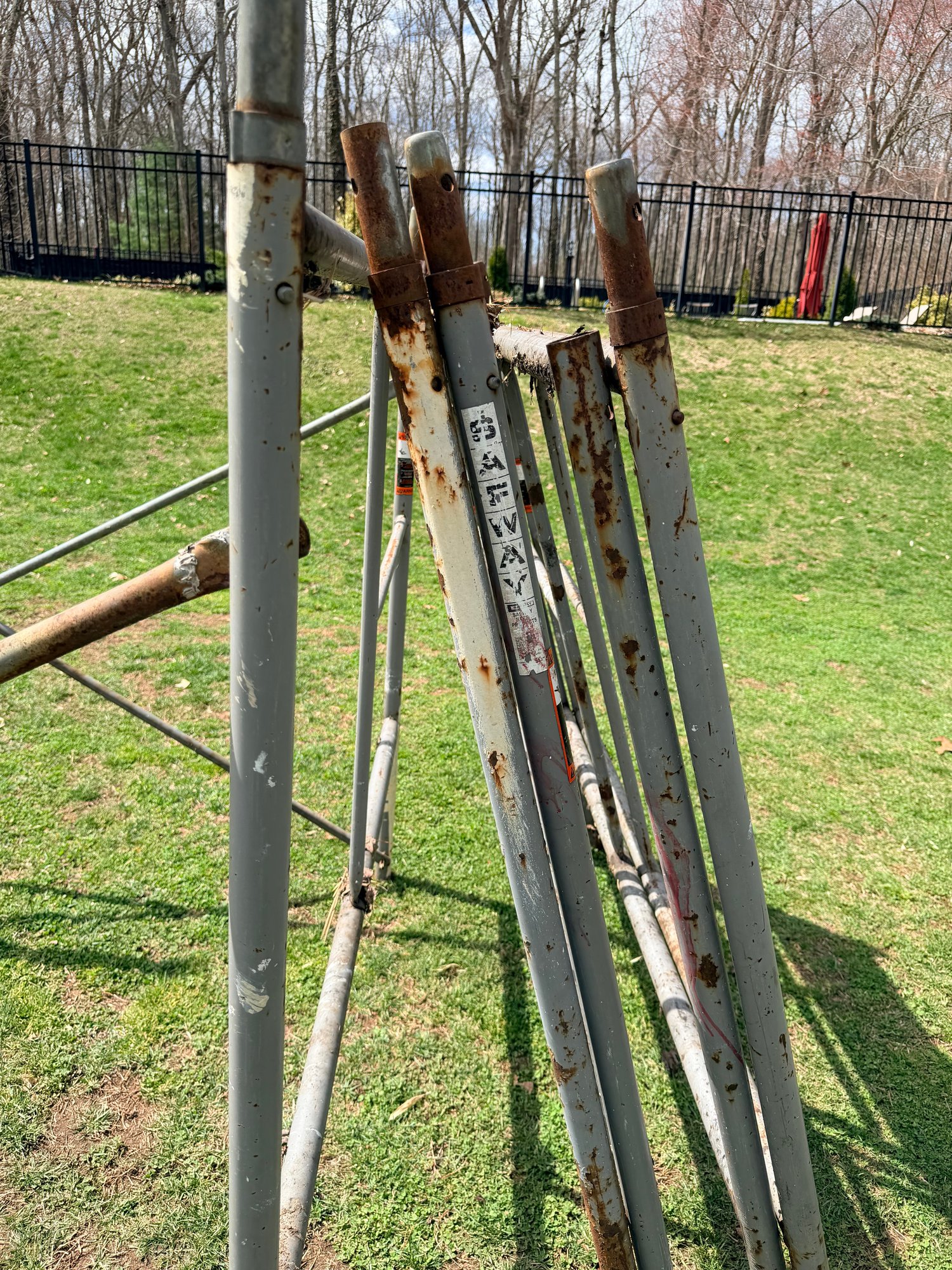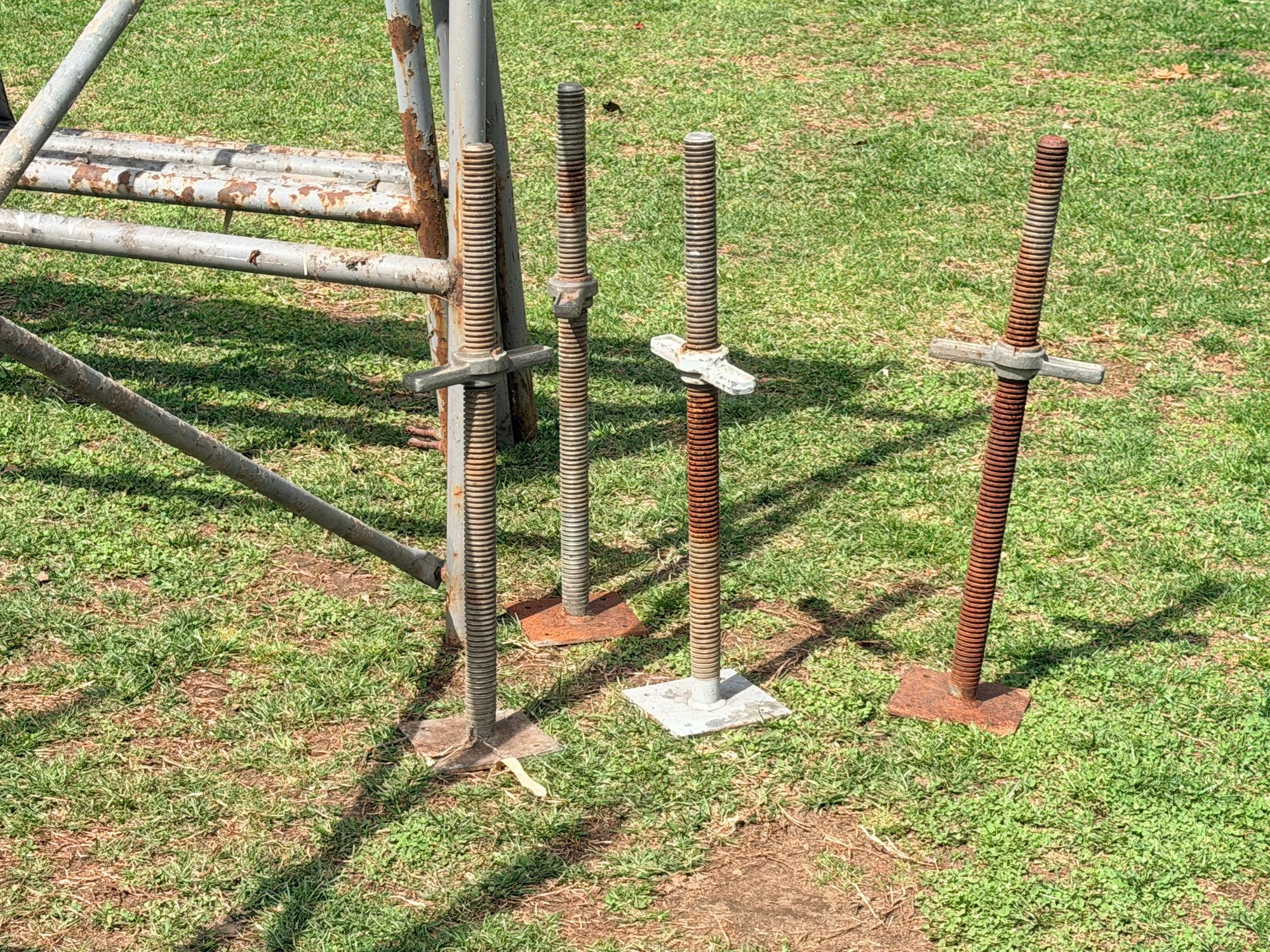 Set of three steel scaffolding sections including tubular frames, cross braces, and support poles, designed for construction or maintenance work, with a modular design that allows the sections to be assembled into a stable elevated work platform, suitable for exterior or interior projects.
