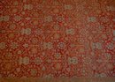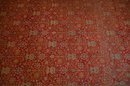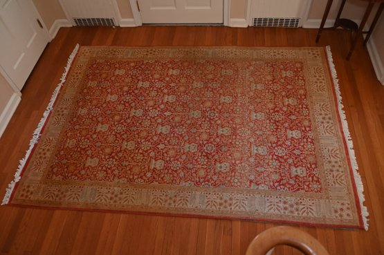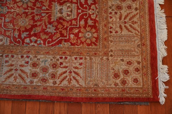 This is a traditional hand-knotted Pakistani area rug, featuring a warm red field with intricate floral and geometric motifs. The deep red background gives it a rich, elegant appearance, while the central field showcases an elaborate repeating floral and vine pattern, characteristic of classic Persian or Mughal designs.