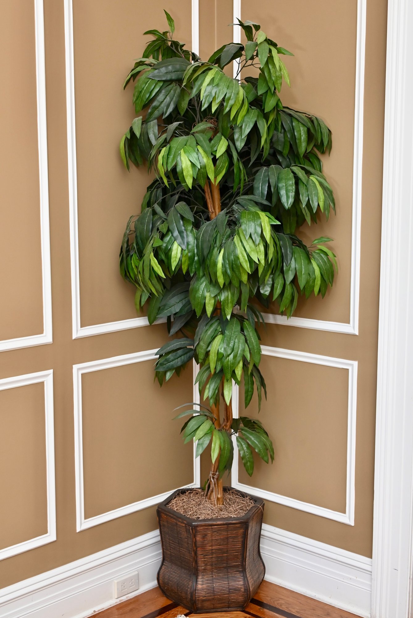 This lush artificial floor plant features vibrant green cascading leaves and a natural-looking trunk, making it a low-maintenance yet stylish decor piece for any interior space. The plant is housed in a decorative woven wicker planter, adding warmth and an elegant touch to its presentation.