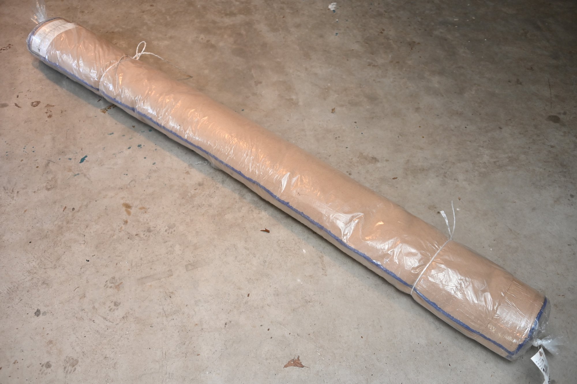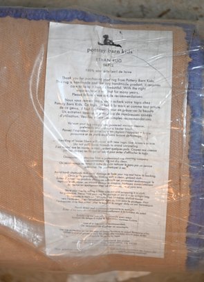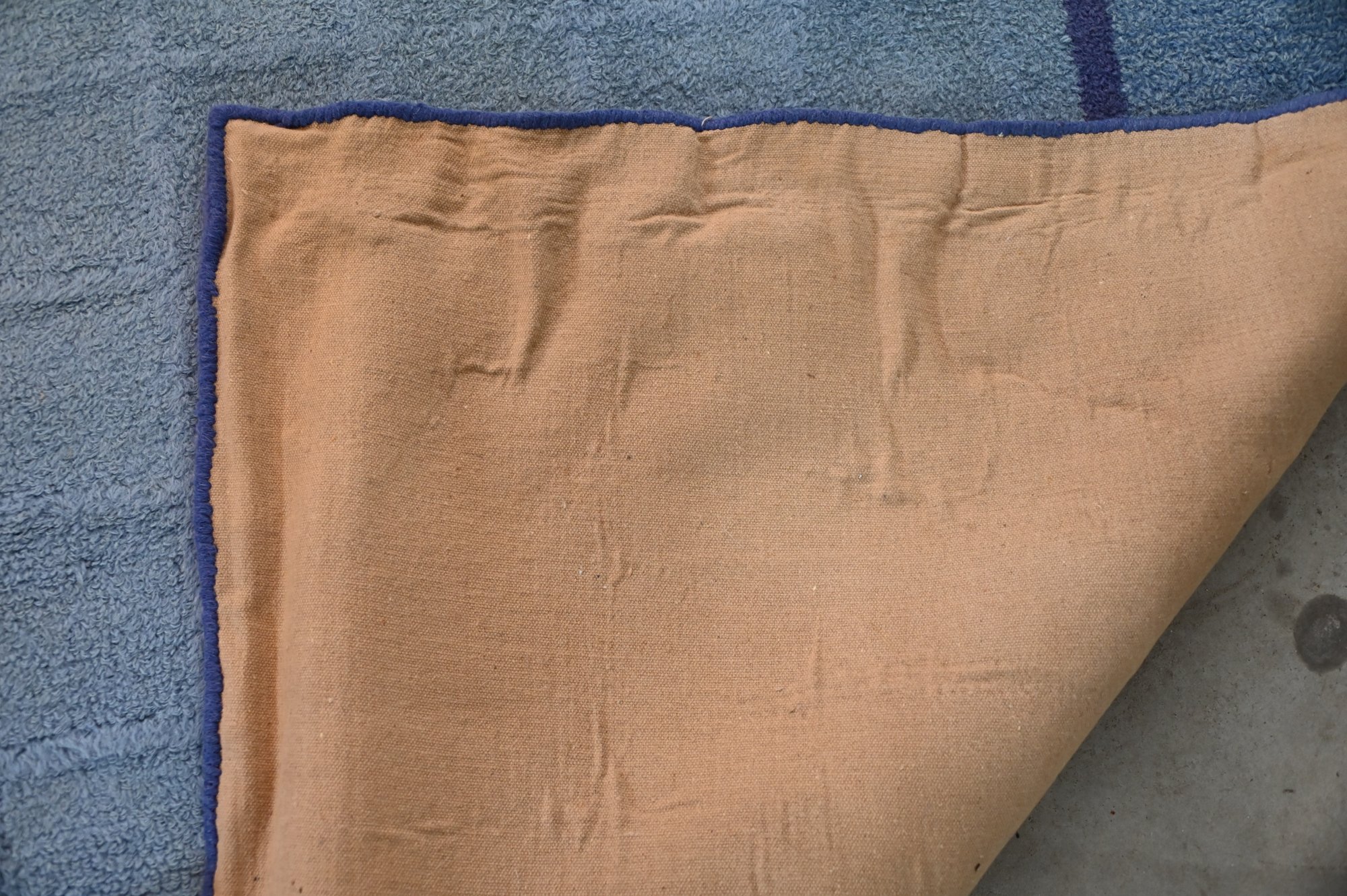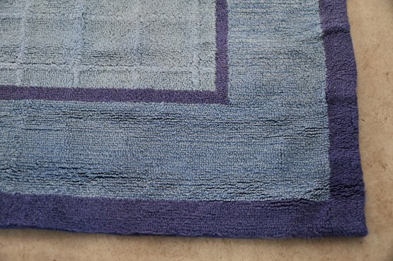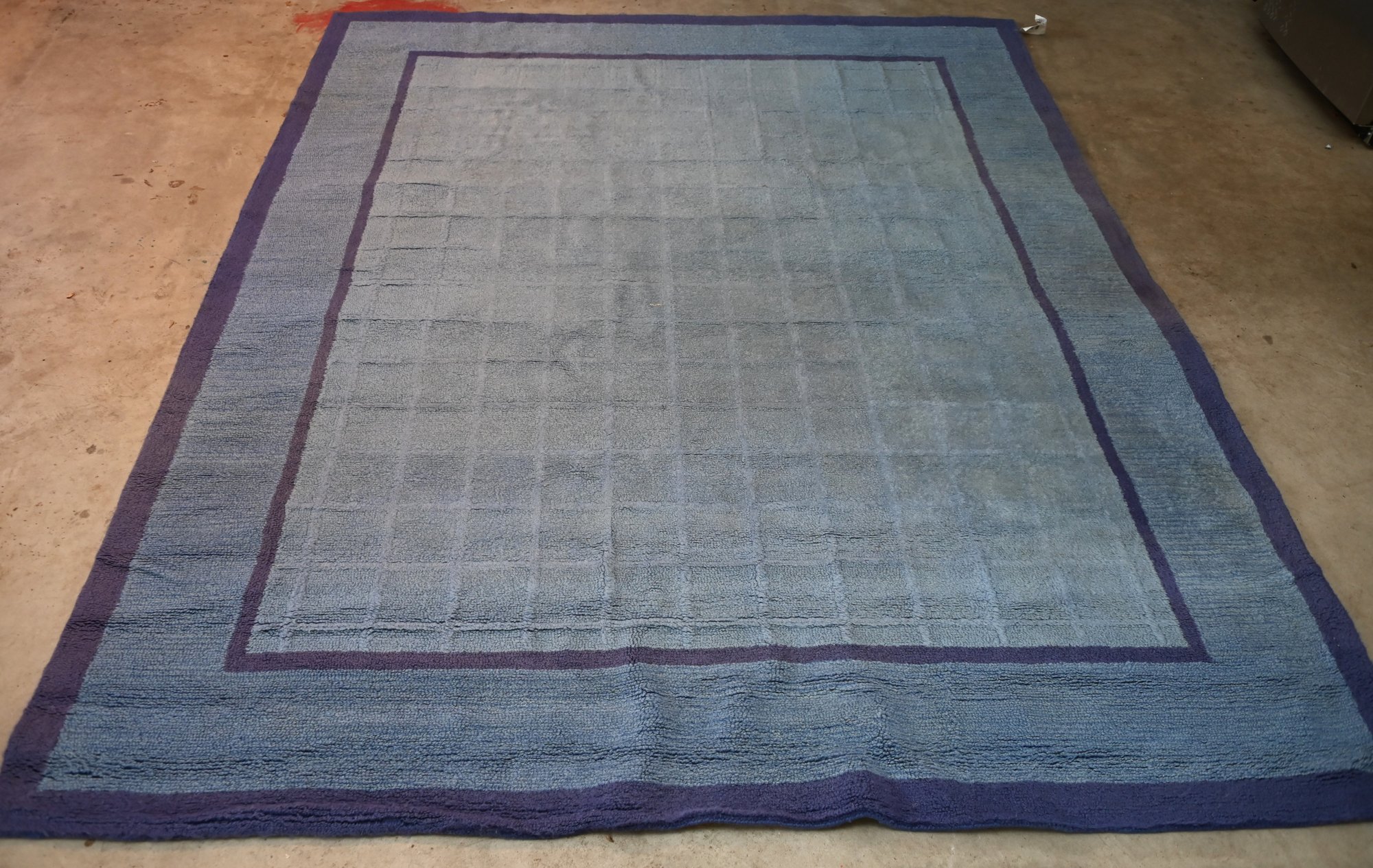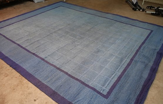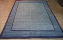 recently professionally cleaned,large rectangular area rug with a muted blue color scheme. The design features a subtle square grid pattern in the central field, bordered by two darker blue frames that add contrast. The outermost section of the rug has a broad band of deep blue, providing a structured and balanced look.