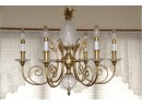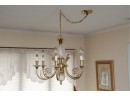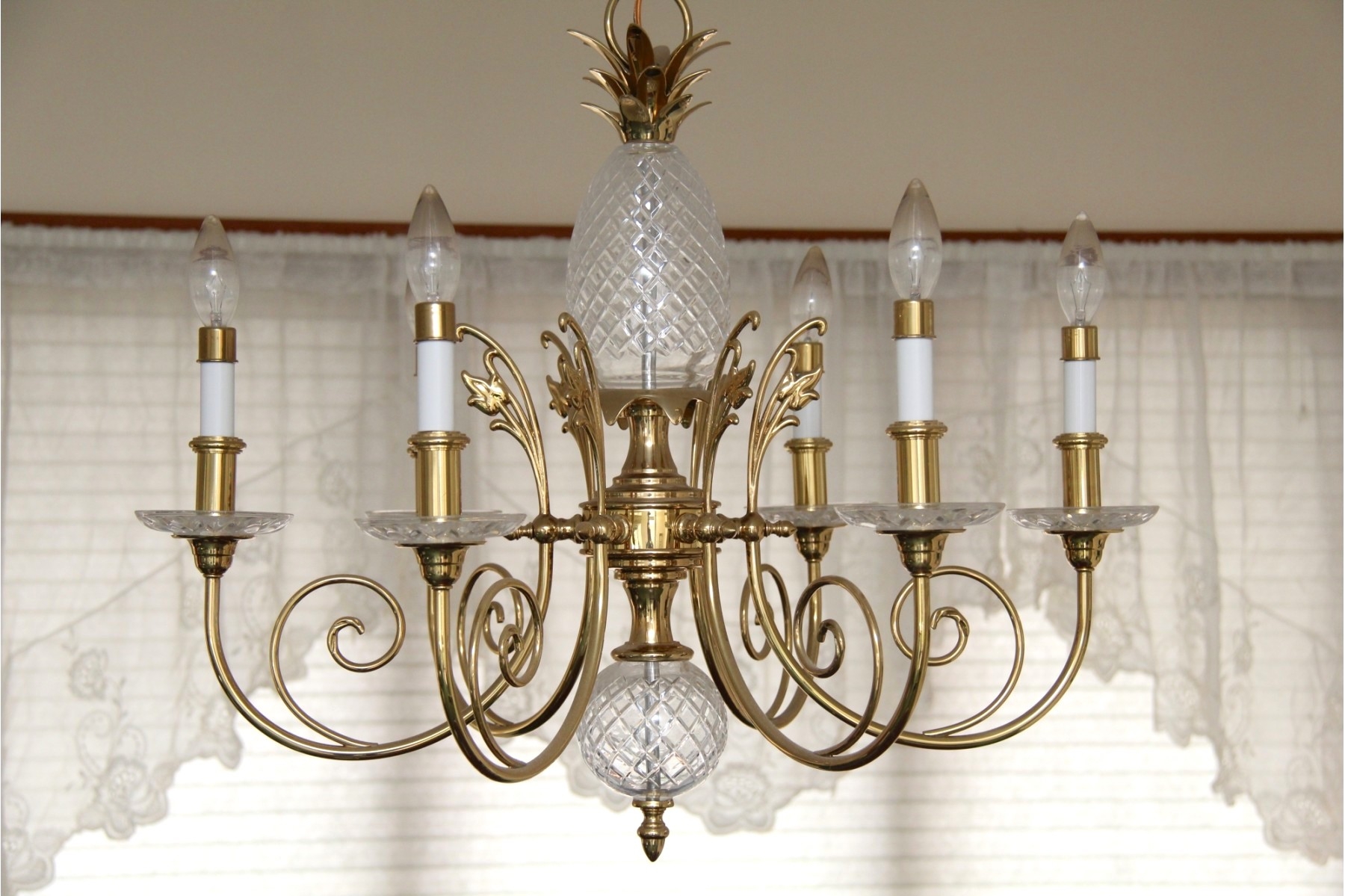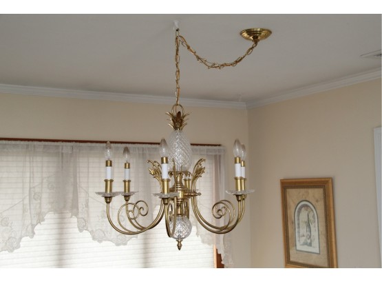 Beautiful vintage 6 light brass and crystal chandelier with pineapple globe at top - excellent condition